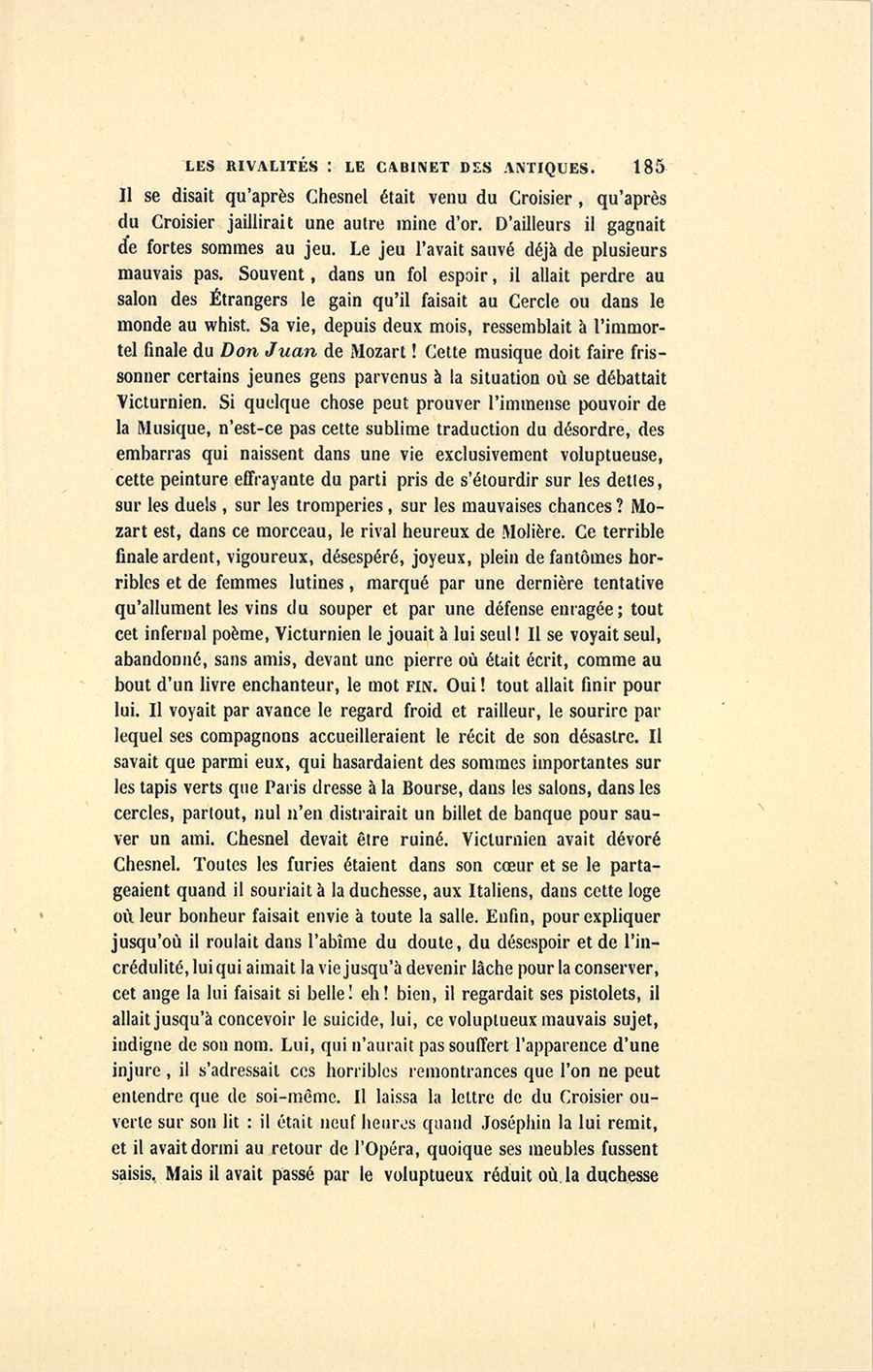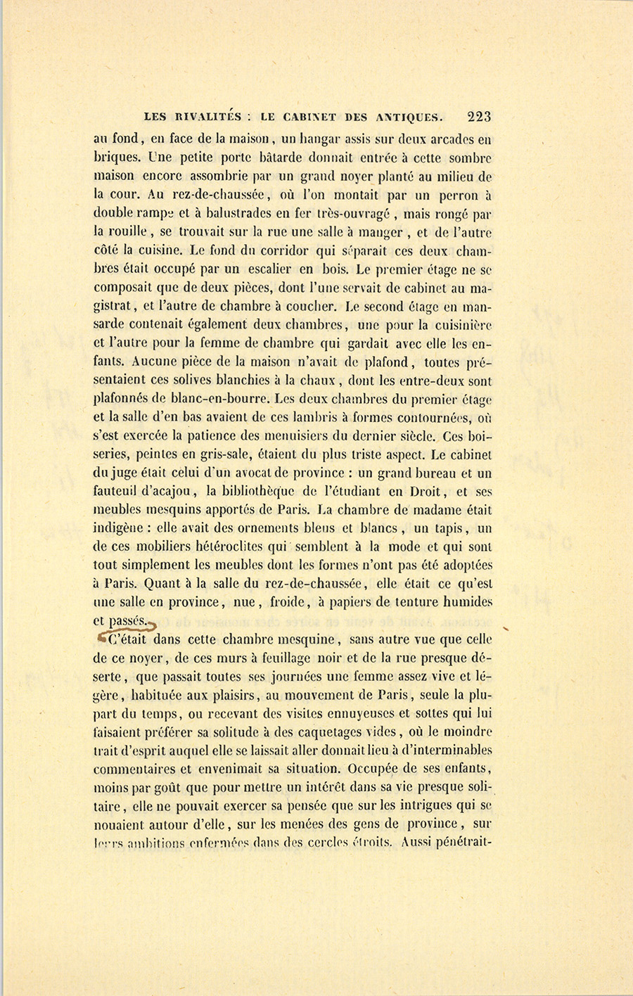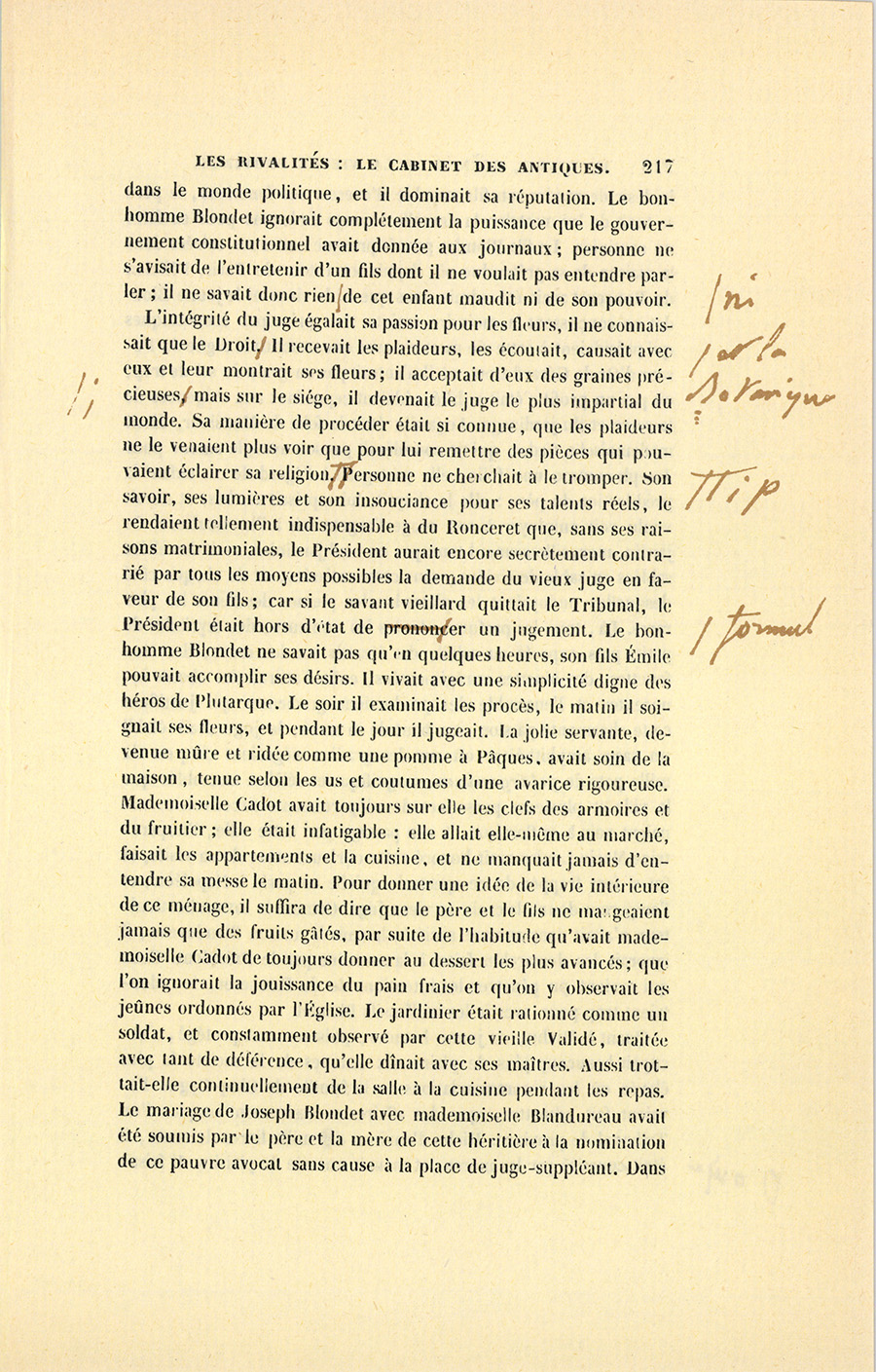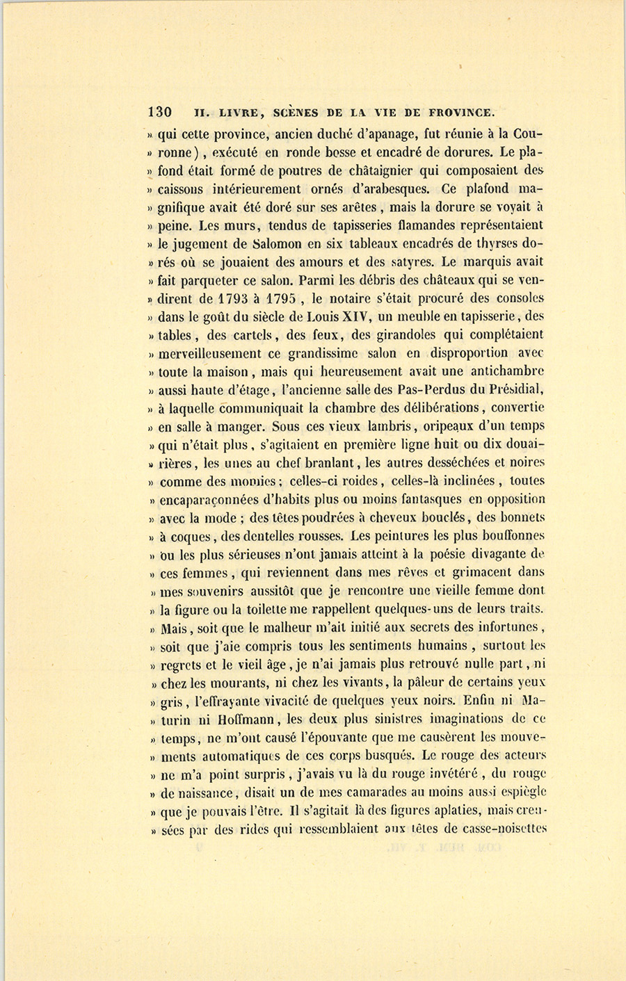 « Quant à moi, disait Émile Blondet, si je veux rassembler mes souvenirs d’enfance, j’avouerai que le mot Cabinet des Antiques me faisait toujours rire, malgré mon respect, dois-je dire mon amour pour mademoiselle Armande. L’hôtel d’Esgrignon donnait sur deux rues à l’angle desquelles elle était située, en sorte que le salon avait deux fenêtres sur l’une et deux fenêtres sur l’autre de ces rues, les plus passantes de la ville. La Place du Marché se trouvait à cinq cents pas de l’hôtel. Ce salon était alors comme une cage de verre, et personne n’allait ou venait dans la ville sans y jeter un coup d’œil. Cette pièce me sembla toujours, à moi, bambin de douze ans, être une de ces curiosités rares qui se trouvent plus tard, quand on y songe, sur les limites du réel et du fantastique, sans qu’on puisse savoir si elles sont plus d’un côté que de l’autre. Ce salon, autrefois la salle d’audience, était élevé sur un étage de caves à soupiraux grillés, où gisaient jadis les criminels de la province, mais où se faisait alors la cuisine du marquis. Je ne sais pas si la magnifique et haute cheminée du Louvre, si merveilleusement sculptée, m’a causé plus d’étonnement que je n’en ressentis en voyant pour la première fois l’immense cheminée de ce salon brodée comme un melon, et au-dessus de laquelle était un grand portrait équestre de Henri III (sous {p. 130} qui cette province, ancien duché d’apanage, fut réunie à la Couronne), exécuté en ronde bosse et encadré de dorures. Le plafond était formé de poutres de châtaignier qui composaient des caissons intérieurement ornés d’arabesques. Ce plafond magnifique avait été doré sur ses arêtes, mais la dorure se voyait à peine. Les murs, tendus de tapisseries flamandes représentaient le jugement de Salomon en six tableaux encadrés de thyrses dorés où se jouaient des amours et des satyres. Le marquis avait fait parqueter ce salon. Parmi les débris des châteaux qui se vendirent de 1793 à 1795, le notaire s’était procuré des consoles dans le goût du siècle de Louis XIV, un meuble en tapisserie, des tables, des cartels, des feux, des girandoles qui complétaient merveilleusement ce grandissime salon en disproportion avec toute la maison, mais qui heureusement avait une antichambre aussi haute d’étage, l’ancienne salle des Pas-Perdus du Présidial, à laquelle communiquait la chambre des délibérations, convertie en salle à manger. Sous ces vieux lambris, oripeaux d’un temps qui n’était plus, s’agitaient en première ligne huit ou dix douairières, les unes au chef branlant, les autres desséchées et noires comme des momies ; celles-ci roides, celles-là inclinées, toutes encaparaçonnées d’habits plus ou moins fantasques en opposition avec la mode ; des têtes poudrées à cheveux bouclés, des bonnets à coques, des dentelles rousses. Les peintures les plus bouffonnes ou les plus sérieuses n’ont jamais atteint à la poésie divagante de ces femmes, qui reviennent dans mes rêves et grimacent dans mes souvenirs aussitôt que je rencontre une vieille femme dont la figure ou la toilette me rappellent quelques-uns de leurs traits. Mais, soit que le malheur m’ait initié aux secrets des infortunes, soit que j’aie compris tous les sentiments humains, surtout les regrets et le vieil âge, je n’ai jamais plus retrouvé nulle part, ni chez les mourants, ni chez les vivants, la pâleur de certains yeux gris, l’effrayante vivacité de quelques yeux noirs. Enfin ni Maturin ni Hoffmann, les deux plus sinistres imaginations de ce temps, ne m’ont causé l’épouvante que me causèrent les mouvements automatiques de ces corps busqués. Le rouge des acteurs ne m’a point surpris, j’avais vu là du rouge invétéré, du rouge de naissance, disait un de mes camarades au moins aussi espiègle que je pouvais l’être. Il s’agitait là des figures aplaties, mais creusées par des rides qui ressemblaient aux têtes de casse-noisettes {p. 131} sculptées en Allemagne. Je voyais à travers les carreaux des corps bossués, des membres mal attachés dont je n’ai jamais tenté d’expliquer l’économie ni la contexture ; des mâchoires carrées et très-apparentes, des os exorbitants, des hanches luxuriantes. Quand ces femmes allaient et venaient, elles ne me semblaient pas moins extraordinaires que quand elles gardaient leur immobilité mortuaire, alors qu’elles jouaient aux cartes. Les hommes de ce salon offraient les couleurs grises et fanées des vieilles tapisseries, leur vie était frappée d’indécision ; mais leur costume se rapprochait beaucoup des costumes alors en usage, seulement leurs cheveux blancs, leurs visages flétris, leur teint de cire, leurs fronts2 ruinés, la pâleur des yeux leur donnaient à tous une ressemblance avec les femmes qui détruisait la réalité de leur costume. La certitude de trouver ces personnages invariablement attablés ou assis aux mêmes heures achevait de leur prêter à mes yeux je ne sais quoi de théâtral, de pompeux, de surnaturel. Jamais je ne suis entré depuis dans ces garde-meubles célèbres, à Paris, à Londres, à Vienne, à Munich, où de vieux gardiens vous montrent les splendeurs des temps passés, sans que je les peuplasse des figures du Cabinet des Antiques. Nous nous proposions souvent entre nous, écoliers de huit à dix ans, comme une partie de plaisir d’aller voir ces raretés sous leur cage de verre. Mais aussitôt que je voyais la suave mademoiselle Armande, je tressaillais, puis j’admirais avec un sentiment de jalousie ce délicieux enfant, Victurnien, chez lequel nous pressentions tous une nature supérieure à la nôtre. Cette jeune et fraîche créature, au milieu de ce cimetière réveillé avant le temps, nous frappait par je ne sais quoi d’étrange. Sans nous rendre un compte exact de nos idées, nous nous sentions bourgeois et petits devant cette cour orgue