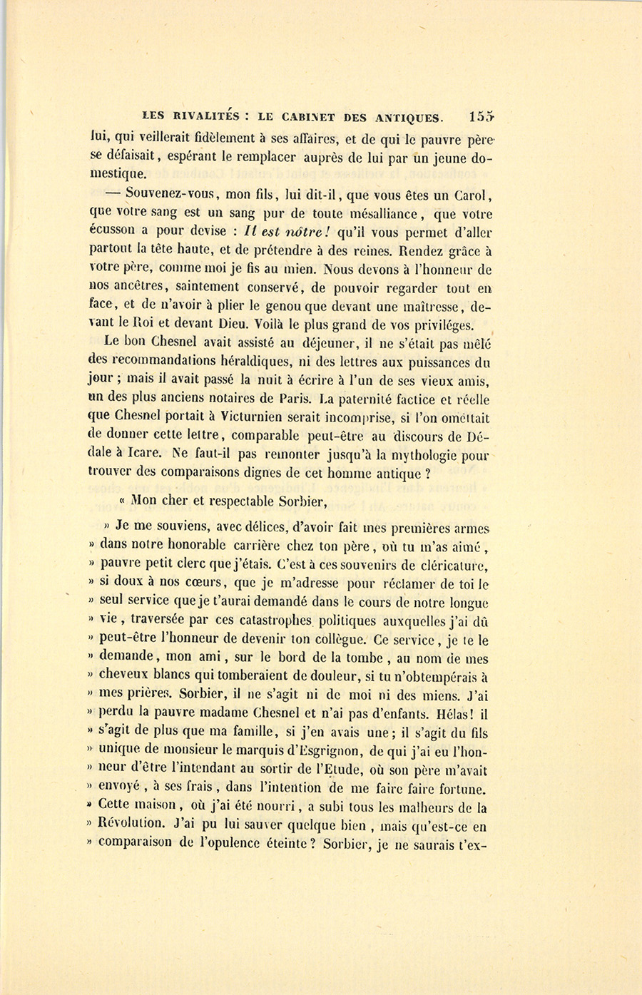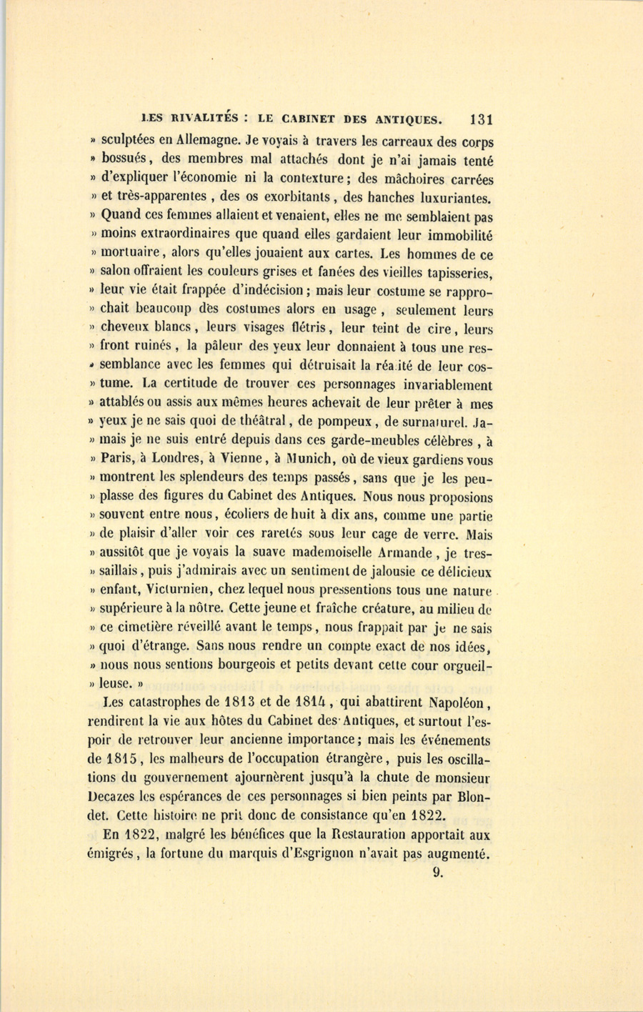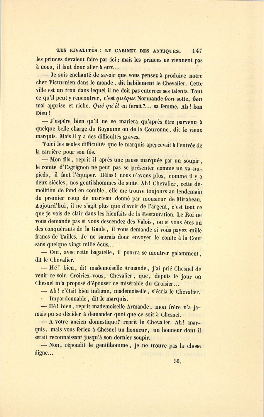 Sans ces explications qui peignent tout un côté de l’histoire de la vie provinciale sous l’Empire et la Restauration, il eût été difficile de comprendre la scène par laquelle commence cette aventure, et qui eut lieu vers la fin du mois d’octobre de l’année 1822, dans le Cabinet des Antiques, un soir, après le jeu, quand les nobles habitués, les vieilles comtesses, les jeunes marquises, les simples baronnes eurent soldé leurs comptes. Le vieux gentilhomme se promenait de long en long dans son salon, où mademoiselle d’Esgrignon allait éteignant elle-même les bougies aux tables de jeu, il ne se promenait pas seul, il était avec le Chevalier. Ces deux débris du siècle précédent causaient de Victurnien. Le Chevalier avait été chargé de faire à son sujet des ouvertures au marquis.