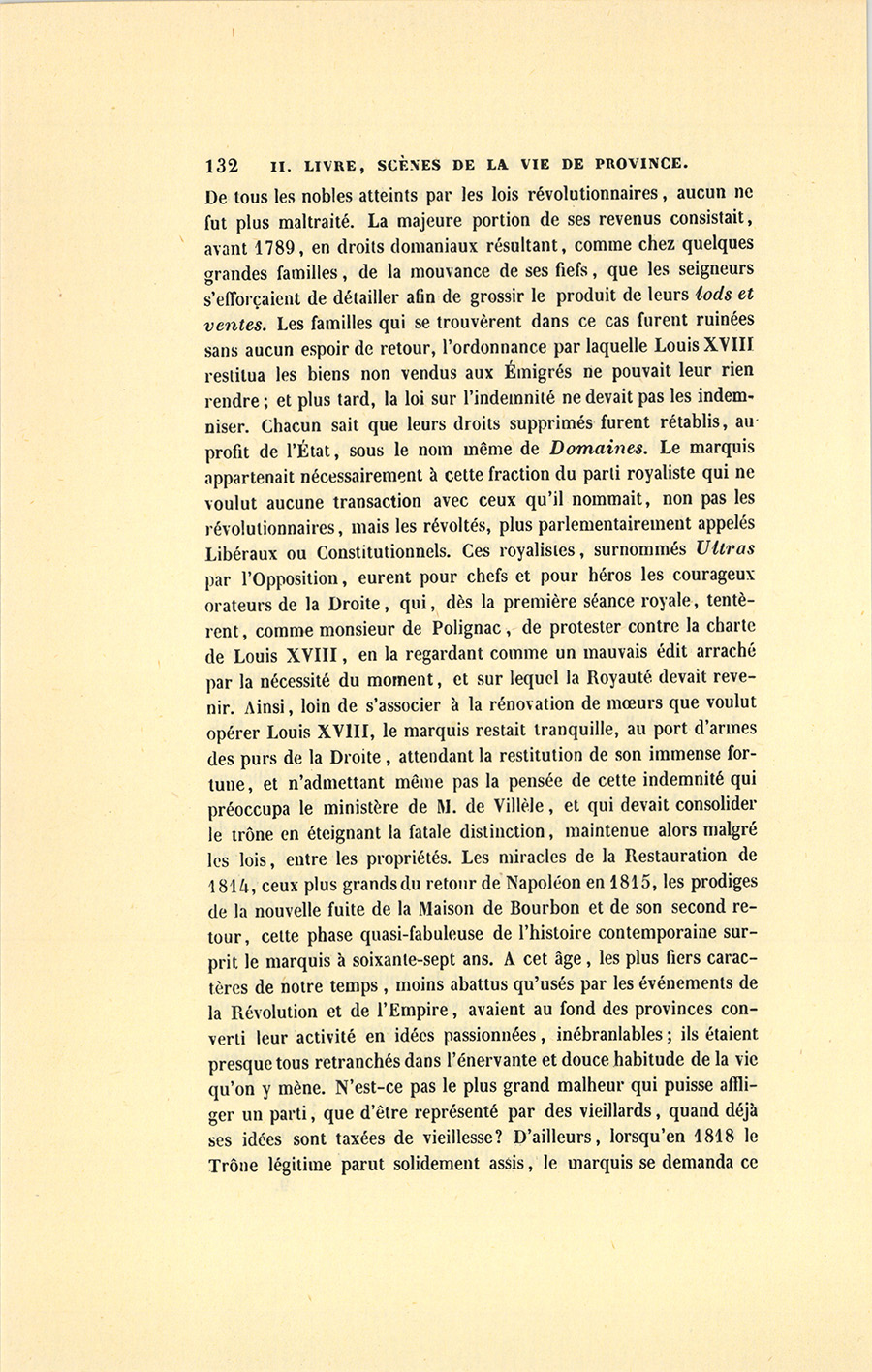 En 1822, malgré les bénéfices que la Restauration apportait aux émigrés, la fortune du marquis d’Esgrignon n’avait pas augmenté. {p. 132} De tous les nobles atteints par les lois révolutionnaires, aucun ne fut plus maltraité. La majeure portion de ses revenus consistait, avant 1789, en droits domaniaux résultant, comme chez quelques grandes familles, de la mouvance de ses fiefs, que les seigneurs s’efforçaient de détailler afin de grossir le produit de leurs lods et ventes. Les familles qui se trouvèrent dans ce cas furent ruinées sans aucun espoir de retour, l’ordonnance par laquelle Louis XVIII restitua les biens non vendus aux Émigrés ne pouvait leur rien rendre ; et plus tard, la loi sur l’indemnité ne devait pas les indemniser. Chacun sait que leurs droits supprimés furent rétablis, au profit de l’État, sous le nom même de Domaines. Le marquis appartenait nécessairement à cette fraction du parti royaliste qui ne voulut aucune transaction avec ceux qu’il nommait, non pas les révolutionnaires, mais les révoltés, plus parlementairement appelés Libéraux ou Constitutionnels. Ces royalistes, surnommés Ultras par l’Opposition, eurent pour chefs et pour héros les courageux orateurs de la Droite, qui, dès la première séance royale, tentèrent, comme monsieur de Polignac, de protester contre la charte de Louis XVIII, en la regardant comme un mauvais édit arraché par la nécessité du moment, et sur lequel la Royauté devait revenir. Ainsi, loin de s’associer à la rénovation de mœurs que voulut opérer Louis XVIII, le marquis restait tranquille, au port d’armes des purs de la Droite, attendant la restitution de son immense fortune, et n’admettant même pas la pensée de cette indemnité qui préoccupa le ministère de monsieur de Villèle, et qui devait consolider le trône en éteignant la fatale distinction, maintenue alors malgré les lois, entre les propriétés. Les miracles de la Restauration de 1814, ceux plus grands du retour de Napoléon en 1815, les prodiges de la nouvelle fuite de la Maison de Bourbon et de son second retour, cette phase quasi-fabuleuse de l’histoire contemporaine surprit le marquis à soixante-sept ans. À cet âge, les plus fiers caractères de notre temps, moins abattus qu’usés par les événements de la Révolution et de l’Empire, avaient au fond des provinces converti leur activité en idées passionnées, inébranlables ; ils étaient presque tous retranchés dans l’énervante et douce habitude de la vie qu’on y mène. N’est-ce pas le plus grand malheur qui puisse affliger un parti, que d’être représenté par des vieillards, quand déjà ses idées sont taxées de vieillesse ? D’ailleurs, lorsqu’en 1818 le Trône légitime parut solidement assis, le marquis se demanda ce {p. 133} qu’un septuagénaire irait faire à la cour, quelle charge, quel emploi pouvait-il y exercer ? Le noble et fier d’Esgrignon se contenta donc, et dut se contenter du triomphe de la Monarchie et de la Religion, en attendant les résultats de cette victoire inespérée, disputée, qui fut simplement un armistice. Il continuait donc alors à trôner dans son salon, si bien nommé le Cabinet des Antiques. Sous la Restauration, ce surnom de douce moquerie s’envenima lorsque les vaincus de 1793 se trouvèrent les vainqueurs.