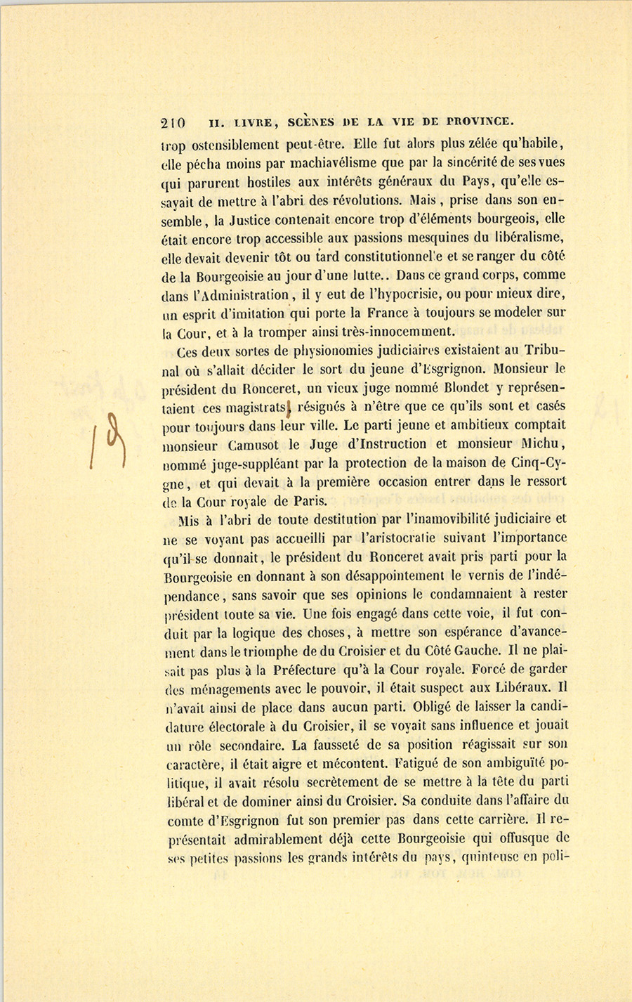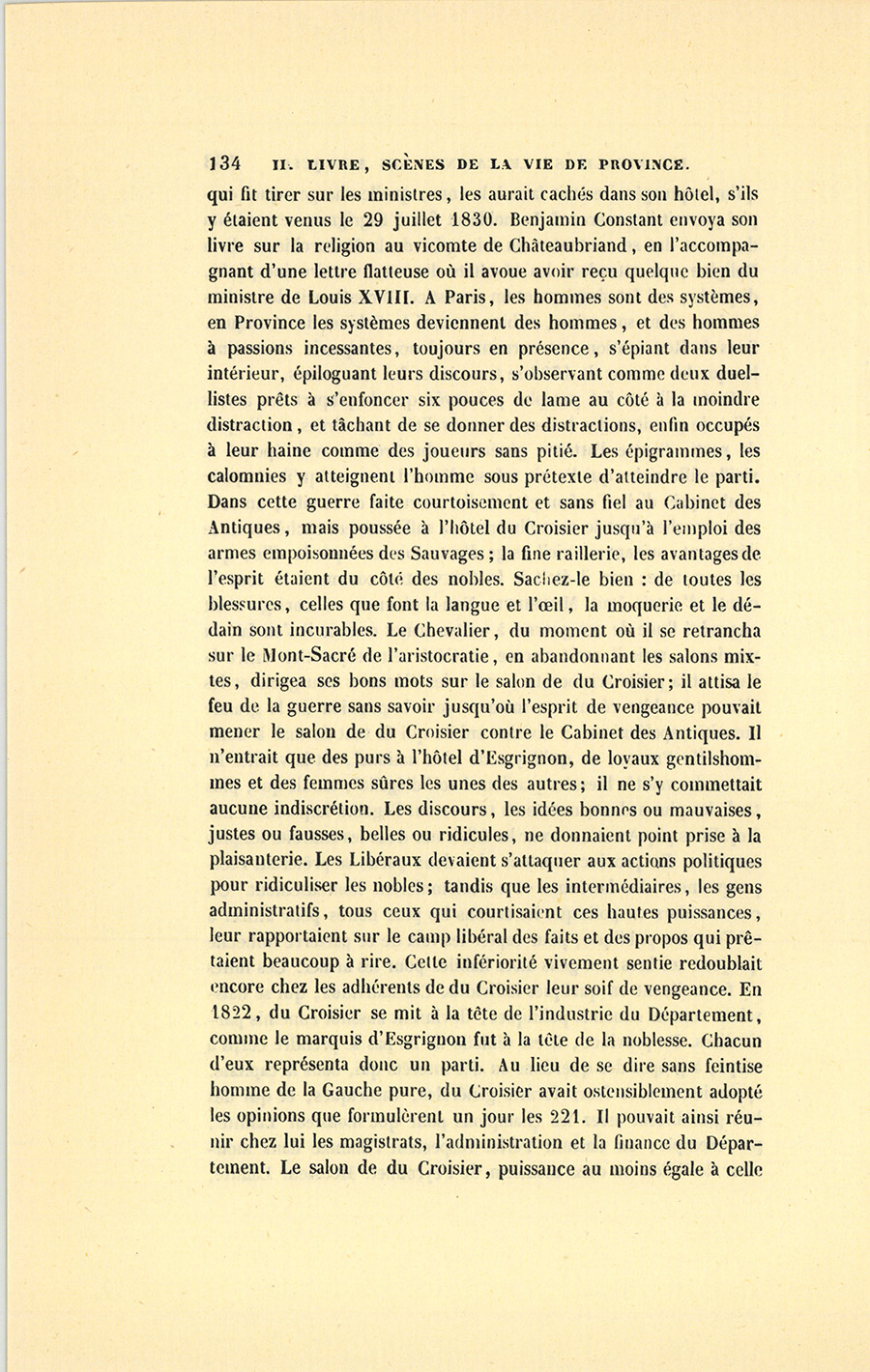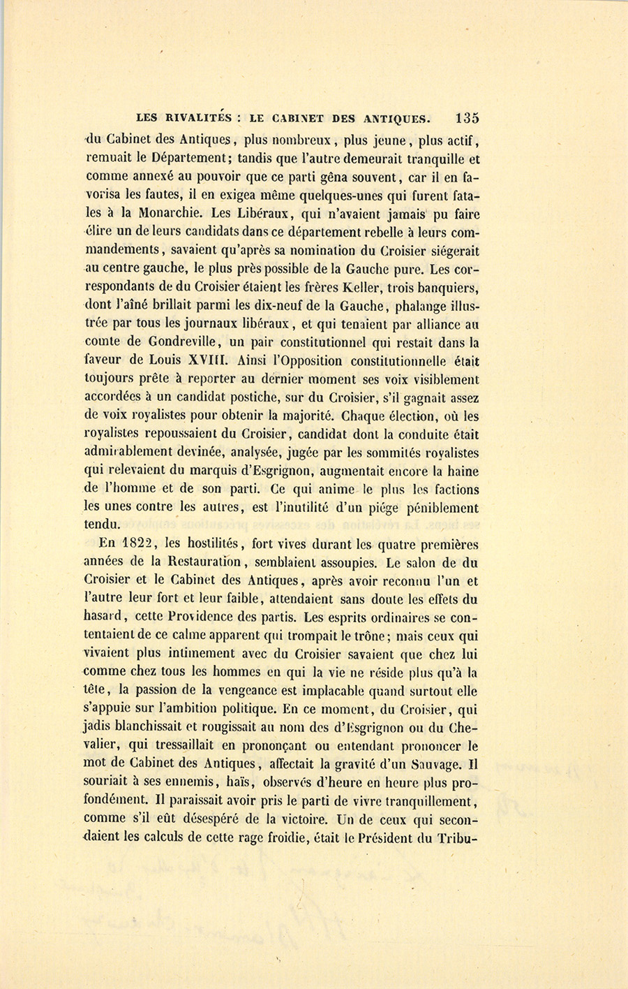 En 1822, les hostilités, fort vives durant les quatre premières années de la Restauration, semblaient assoupies. Le salon de du Croisier et le Cabinet des Antiques, après avoir reconnu l’un et l’autre leur fort et leur faible, attendaient sans doute les effets du hasard, cette Providence des partis. Les esprits ordinaires se contentaient de ce calme apparent qui trompait le trône ; mais ceux qui vivaient plus intimement avec du Croisier savaient que chez lui comme chez tous les hommes en qui la vie ne réside plus qu’à la tête, la passion de la vengeance est implacable quand surtout elle s’appuie sur l’ambition politique. En ce moment, du Croisier, qui jadis blanchissait et rougissait au nom des d’Esgrignon ou du Chevalier, qui tressaillait en prononçant ou entendant prononcer le mot de Cabinet des Antiques, affectait la gravité d’un Sauvage. Il souriait à ses ennemis, haïs, observés d’heure en heure plus profondément. Il paraissait avoir pris le parti de vivre tranquillement, comme s’il eût désespéré de la victoire. Un de ceux qui secondaient les calculs de cette rage froidie, était le Président du {p. 136} Tribunal, monsieur du Ronceret, un hobereau qui avait prétendu aux honneurs du Cabinet des Antiques sans avoir pu les obtenir.
