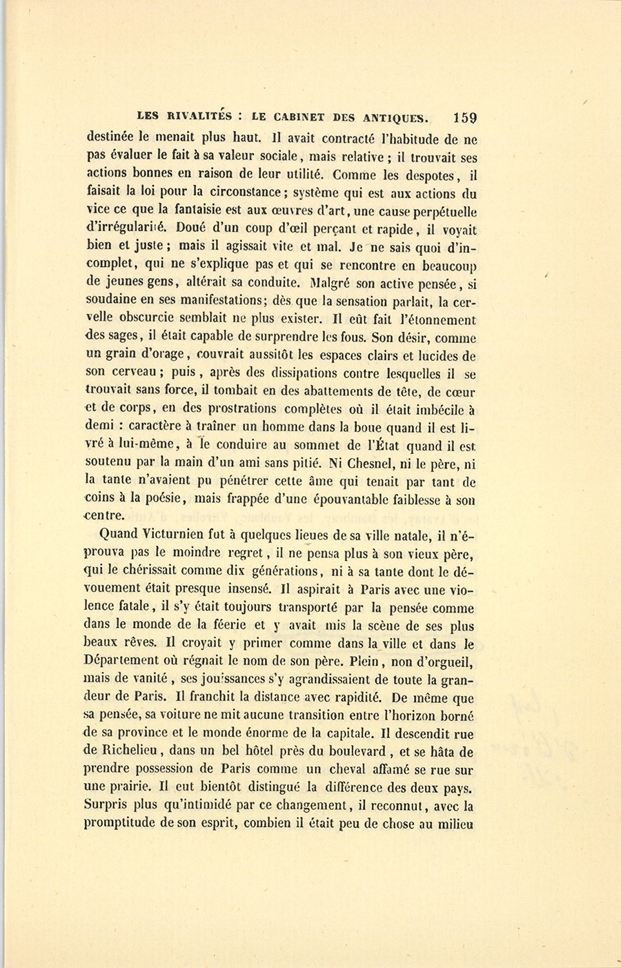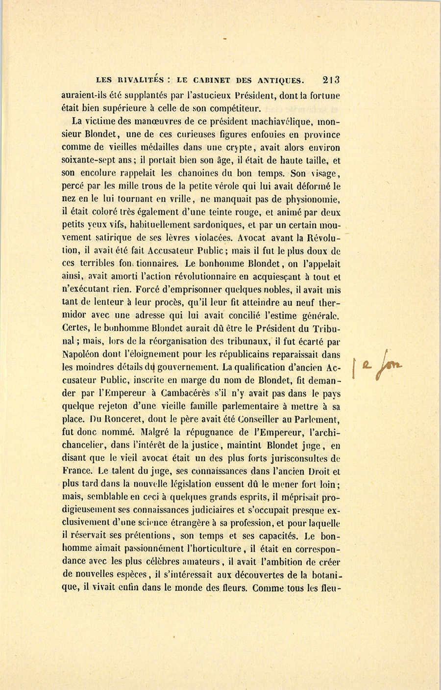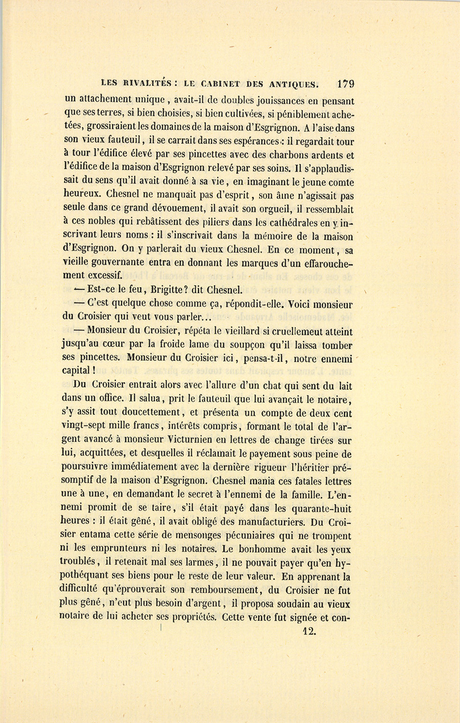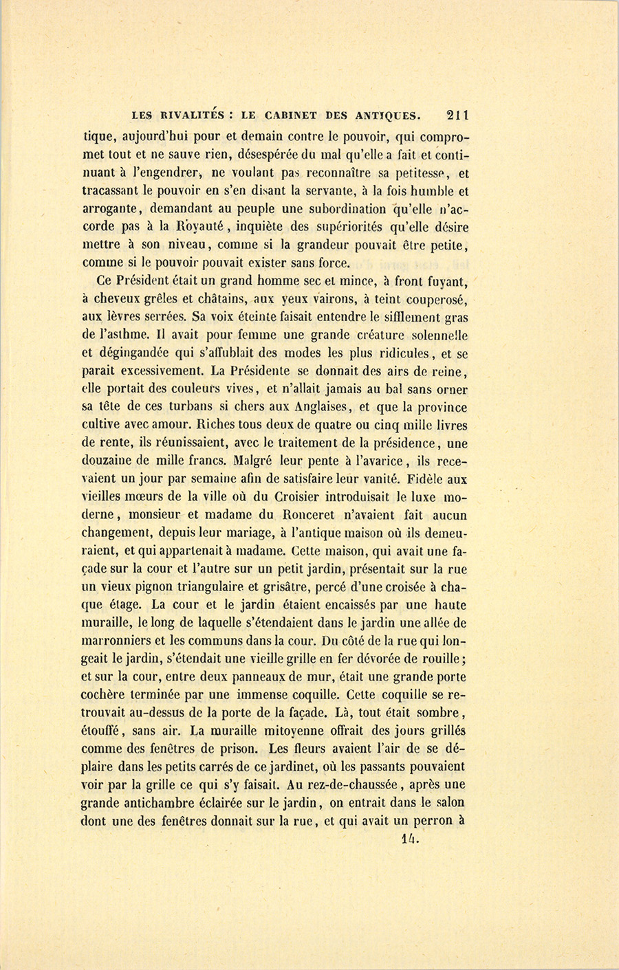 En 1822, les hostilités, fort vives durant les quatre premières années de la Restauration, semblaient assoupies. Le salon de du Croisier et le Cabinet des Antiques, après avoir reconnu l’un et l’autre leur fort et leur faible, attendaient sans doute les effets du hasard, cette Providence des partis. Les esprits ordinaires se contentaient de ce calme apparent qui trompait le trône ; mais ceux qui vivaient plus intimement avec du Croisier savaient que chez lui comme chez tous les hommes en qui la vie ne réside plus qu’à la tête, la passion de la vengeance est implacable quand surtout elle s’appuie sur l’ambition politique. En ce moment, du Croisier, qui jadis blanchissait et rougissait au nom des d’Esgrignon ou du Chevalier, qui tressaillait en prononçant ou entendant prononcer le mot de Cabinet des Antiques, affectait la gravité d’un Sauvage. Il souriait à ses ennemis, haïs, observés d’heure en heure plus profondément. Il paraissait avoir pris le parti de vivre tranquillement, comme s’il eût désespéré de la victoire. Un de ceux qui secondaient les calculs de cette rage froidie, était le Président du {p. 136} Tribunal, monsieur du Ronceret, un hobereau qui avait prétendu aux honneurs du Cabinet des Antiques sans avoir pu les obtenir.