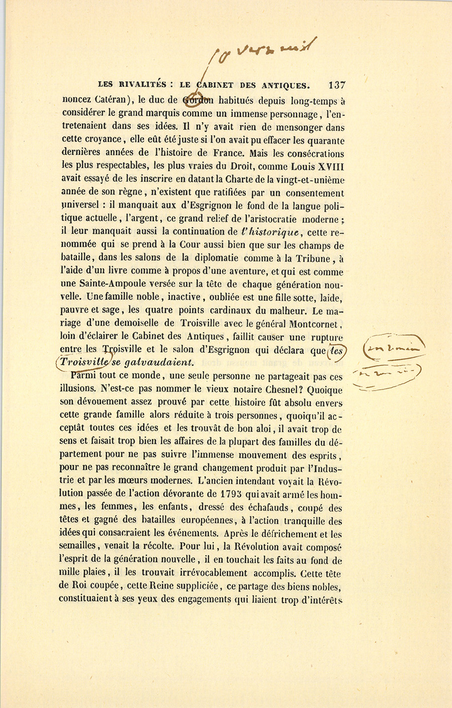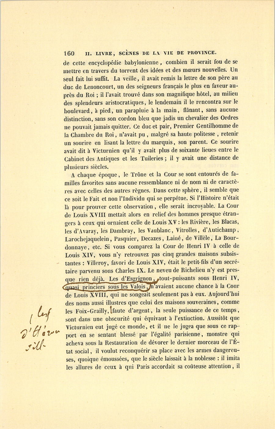 La petite fortune des d’Esgrignon, soigneusement administrée par le notaire Chesnel, suffisait difficilement à l’entretien de ce digne gentilhomme qui vivait noblement, mais sans le moindre faste. Quoique le précepteur du comte Victurnien d’Esgrignon, l’espoir de la maison, fût un ancien Oratorien donné par Monseigneur l’Évêque, et qu’il habitât l’hôtel ; encore lui fallait-il quelques appointements. Les gages d’une cuisinière, ceux d’une femme de chambre pour mademoiselle Armande, du vieux valet de chambre de monsieur le marquis et de deux autres domestiques, la nourriture de quatre maîtres, les frais d’une éducation pour laquelle on ne négligea rien, absorbaient entièrement les revenus, malgré l’économie de mademoiselle Armande, malgré la sage administration de Chesnel, malgré l’affection des domestiques. Le vieux notaire ne pouvait encore faire aucune réparation dans le château dévasté, il attendait la fin des baux pour trouver une augmentation de revenus due soit aux nouvelles méthodes d’agriculture, soit à l’abaissement des valeurs monétaires, et qui allait porter ses fruits à l’expiration de contrats passés en 1809. Le marquis n’était point initié aux détails du ménage ni à l’administration de ses biens. La révélation des excessives précautions employées pour joindre les deux bouts de l’année, suivant l’expression des ménagères, eût été pour lui comme un coup de foudre. Chacun le voyant arrivé bientôt au terme de sa carrière, hésitait à dissiper ses erreurs. La grandeur de la maison d’Esgrignon, à laquelle personne ne pensait ni à la Cour, ni dans l’État ; qui, passé les portes de la ville et quelques localités du département, était tout à fait inconnue, revivait aux yeux du marquis et de ses adhérents dans tout son éclat. La maison d’Esgrignon allait reprendre un nouveau degré de splendeur en la personne de Victurnien, au moment où les nobles spoliés rentreraient dans leurs biens, et même quand ce bel héritier pourrait apparaître à la Cour pour entrer au service du Roi, par suite épouser, comme jadis faisaient les d’Esgrignon, une Navarreins, une Cadignan, une d’Uxelles, une Beauséant, une Blamont-Chauvry, enfin une fille réunissant toutes les distinctions de la noblesse, de la richesse, de la beauté, de l’esprit et du caractère. Les personnes qui venaient faire leur partie le soir, le Chevalier, les Troisville (prononcez Tréville), les La Roche-Guyon, les Castéran {p. 137} (prononcez Catéran), le duc de Verneuil habitués depuis long-temps à considérer le grand marquis comme un immense personnage, l’entretenaient dans ses idées. Il n’y avait rien de mensonger dans cette croyance, elle eût été juste si l’on avait pu effacer les quarante dernières années de l’histoire de France. Mais les consécrations les plus respectables, les plus vraies du Droit, comme Louis XVIII avait essayé de les inscrire en datant la Charte de la vingt-et-unième année de son règne, n’existent que ratifiées par un consentement universel : il manquait aux d’Esgrignon le fond de la langue politique actuelle, l’argent, ce grand relief de l’aristocratie moderne ; il leur manquait aussi la continuation de l’historique, cette renommée qui se prend à la Cour aussi bien que sur les champs de bataille, dans les salons de la diplomatie comme à la Tribune, à l’aide d’un livre comme à propos d’une aventure, et qui est comme une Sainte-Ampoule versée sur la tête de chaque génération nouvelle. Une famille noble, inactive, oubliée est une fille sotte, laide, pauvre et sage, les quatre points cardinaux du malheur. Le mariage d’une demoiselle de Troisville avec le général Montcornet, loin d’éclairer le Cabinet des Antiques, faillit causer une rupture entre les Troisville et le salon d’Esgrignon qui déclara que les Troisville se galvaudaient.