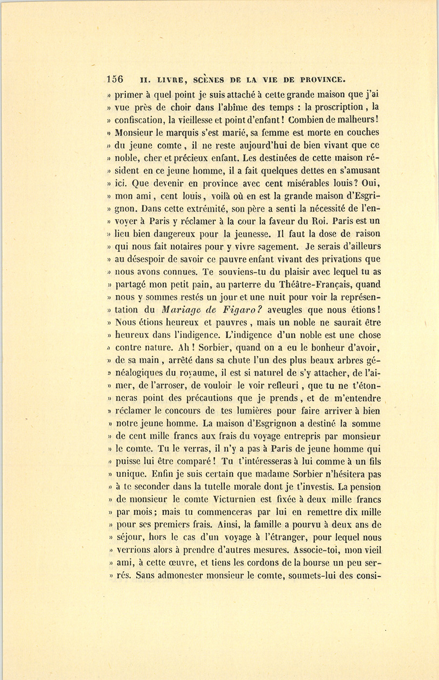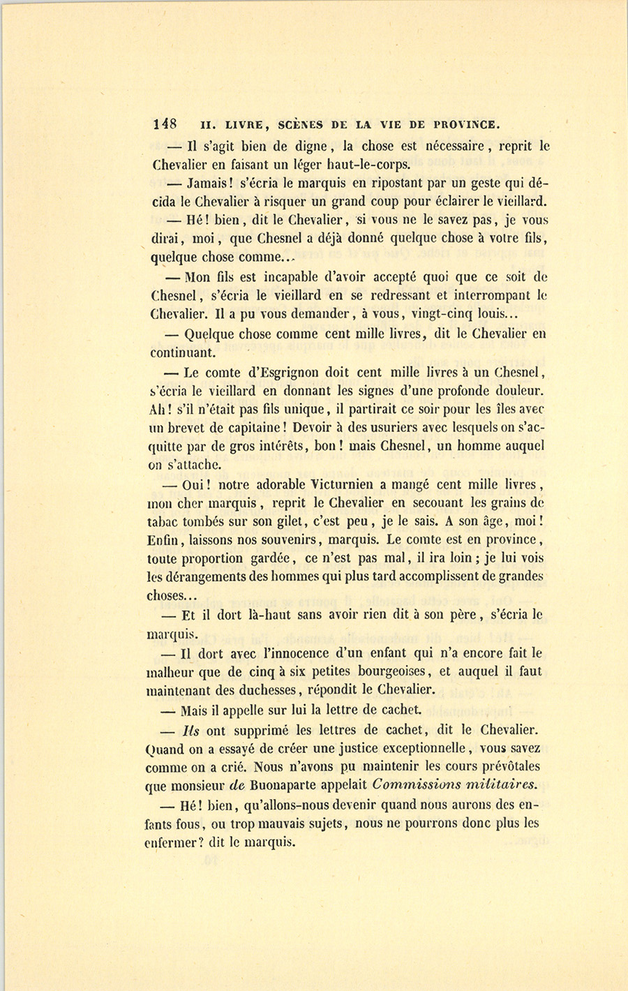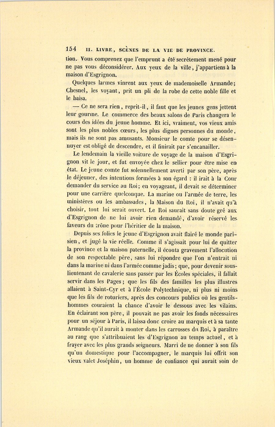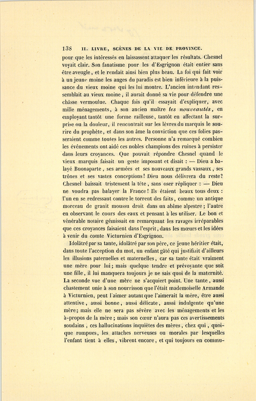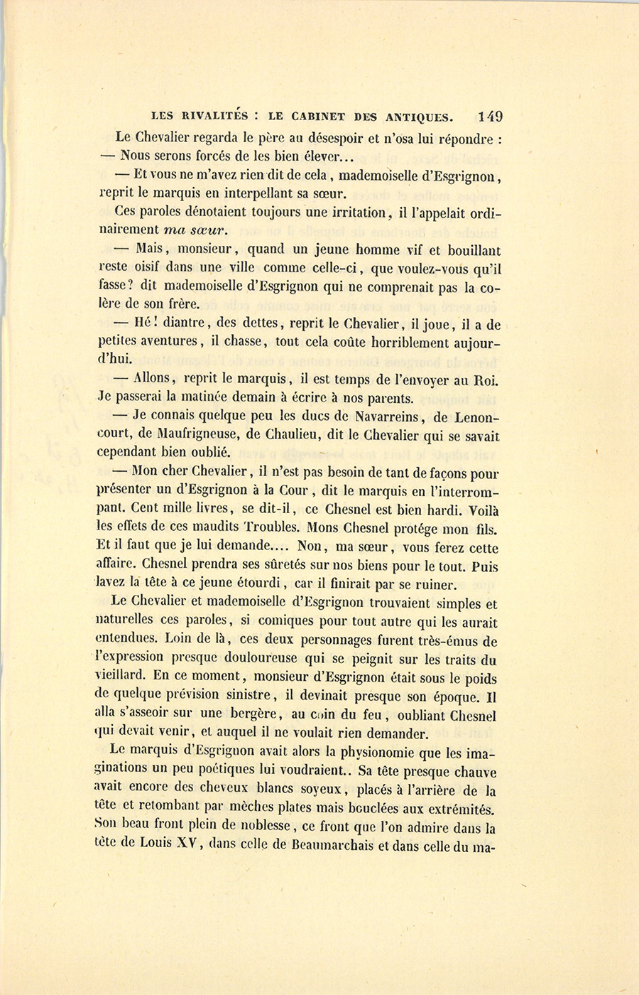 – Mon cher Chevalier, il n’est pas besoin de tant de façons pour présenter un d’Esgrignon à la Cour, dit le marquis en l’interrompant. Cent mille livres, se dit-il, ce Chesnel est bien hardi. Voilà les effets de ces maudits Troubles. Mons Chesnel protége mon fils. Et il faut que je lui demande… Non, ma sœur, vous ferez cette affaire. Chesnel prendra ses sûretés sur nos biens pour le tout. Puis lavez la tête à ce jeune étourdi, car il finirait par se ruiner.