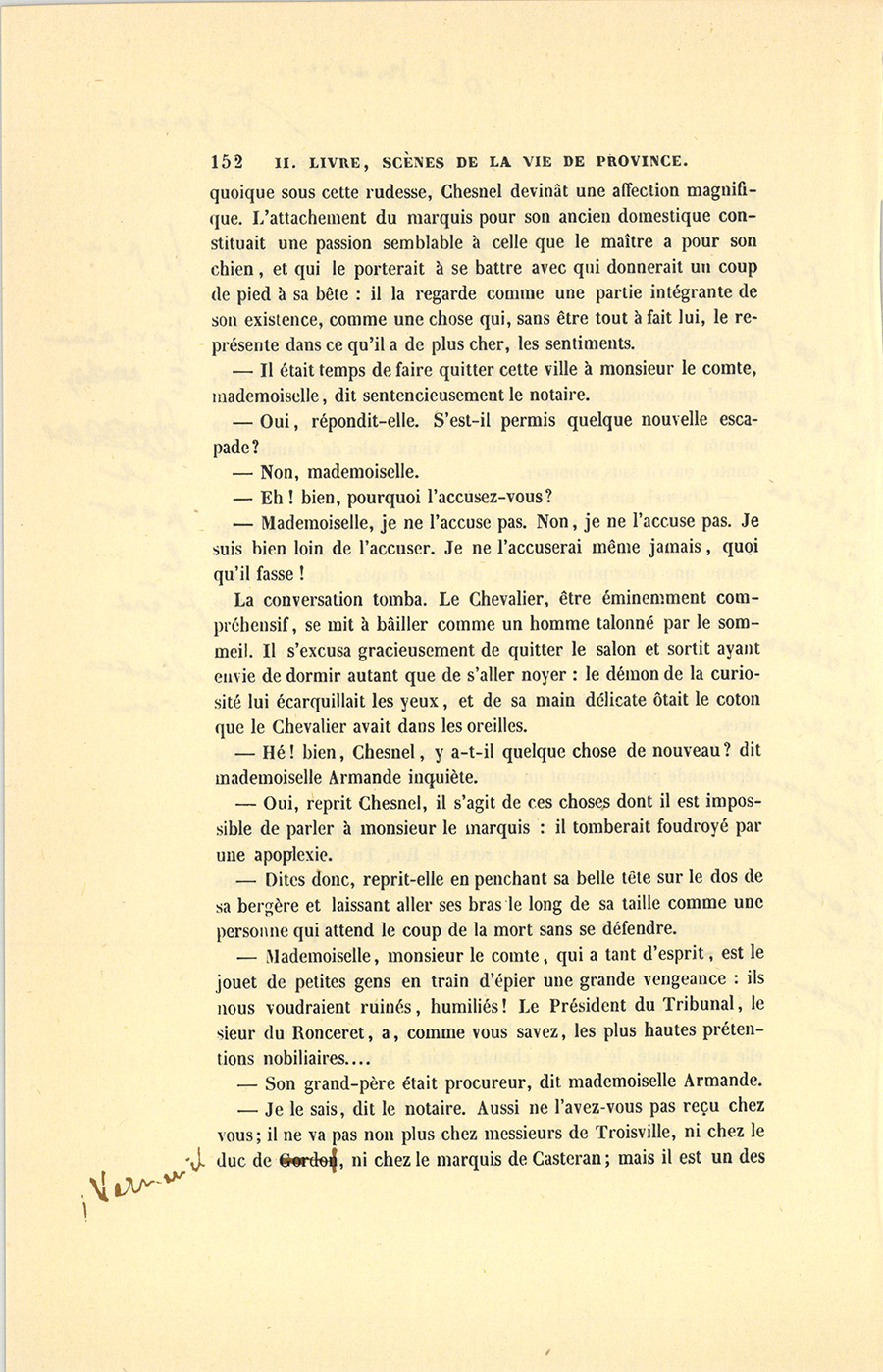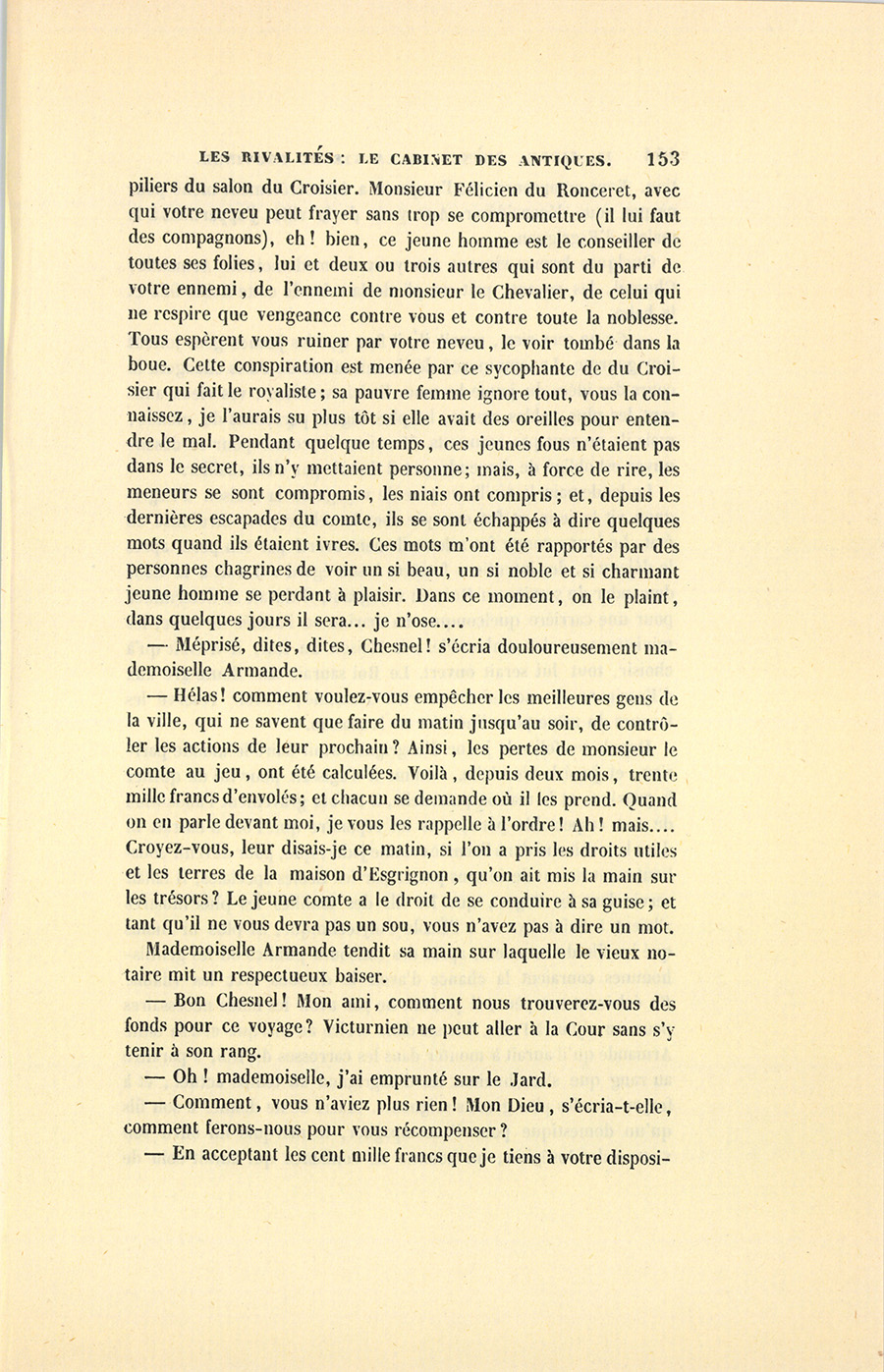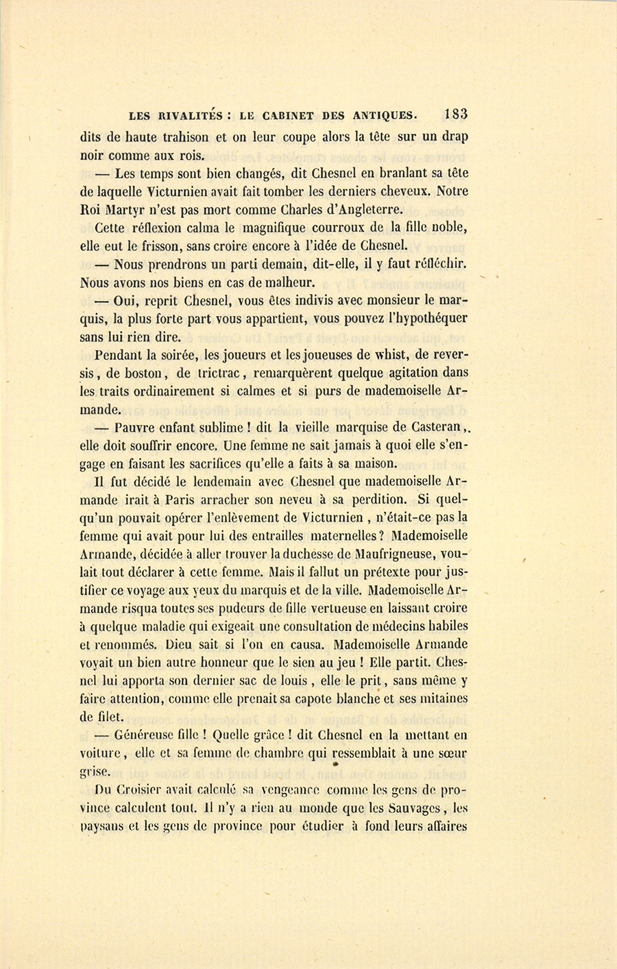 Par ses délicatesses de femme, mademoiselle Armande ôtait toute rudesse au commerce du marquis avec son ancien intendant ; {p. 152} quoique sous cette rudesse, Chesnel devinât une affection magnifique. L’attachement du marquis pour son ancien domestique constituait une passion semblable à celle que le maître a pour son chien, et qui le porterait à se battre avec qui donnerait un coup de pied à sa bête : il la regarde comme une partie intégrante de son existence, comme une chose qui, sans être tout à fait lui, le représente dans ce qu’il a de plus cher, les sentiments.