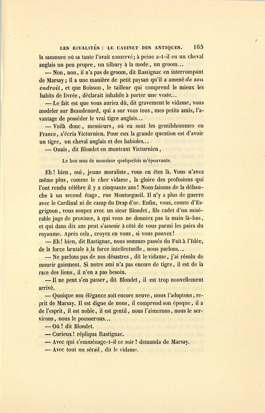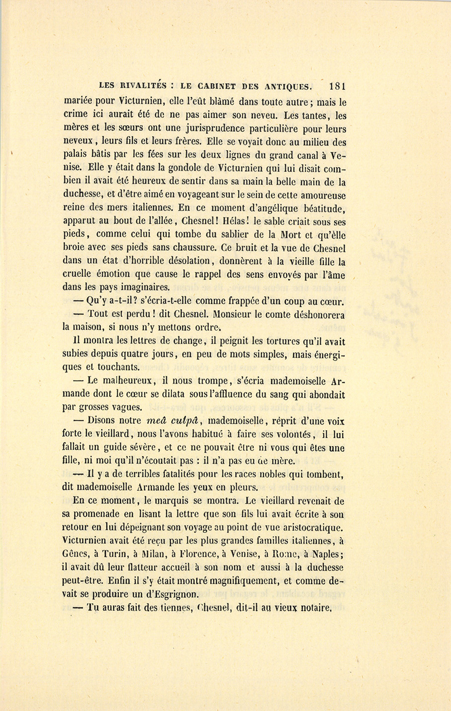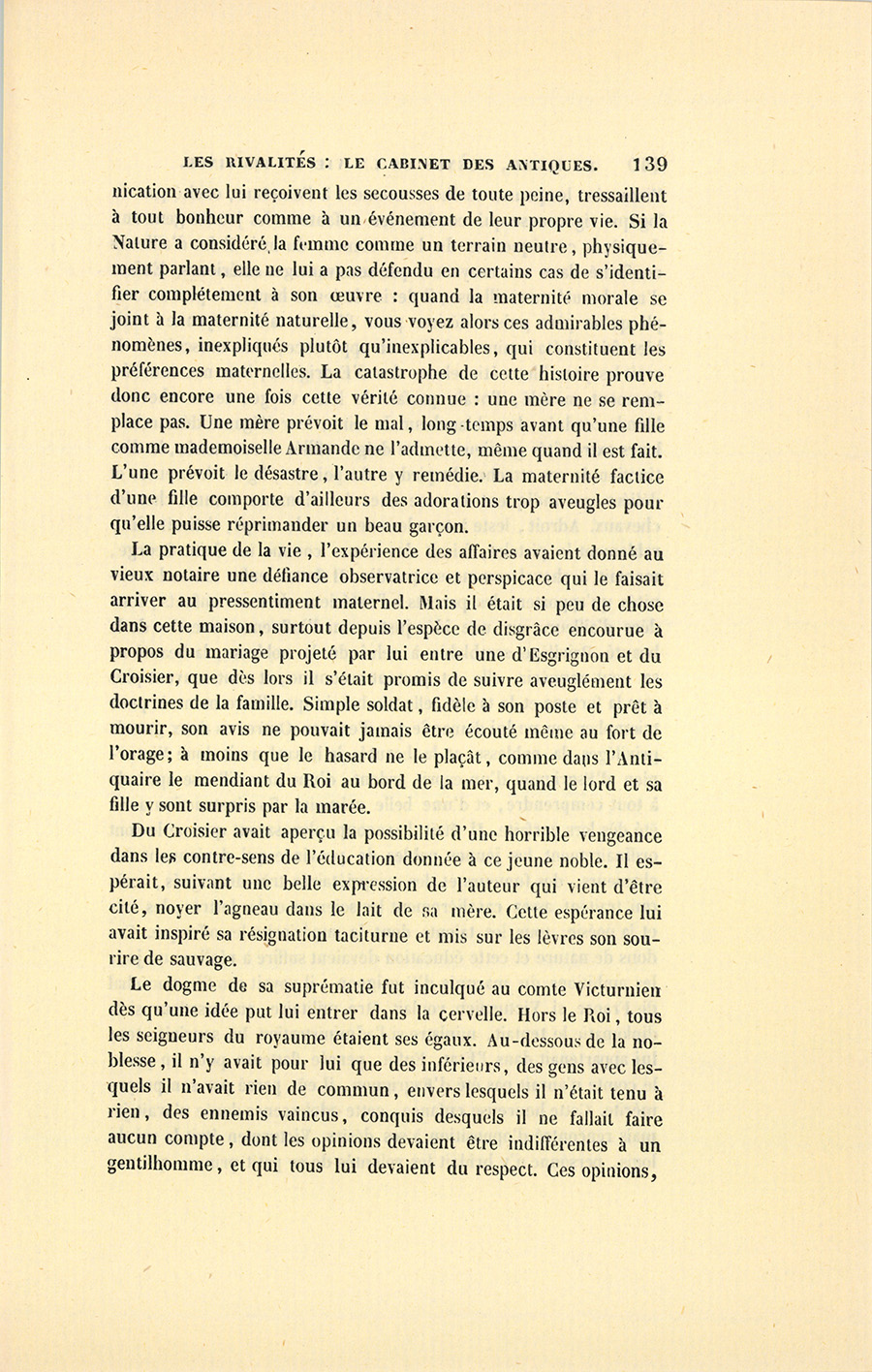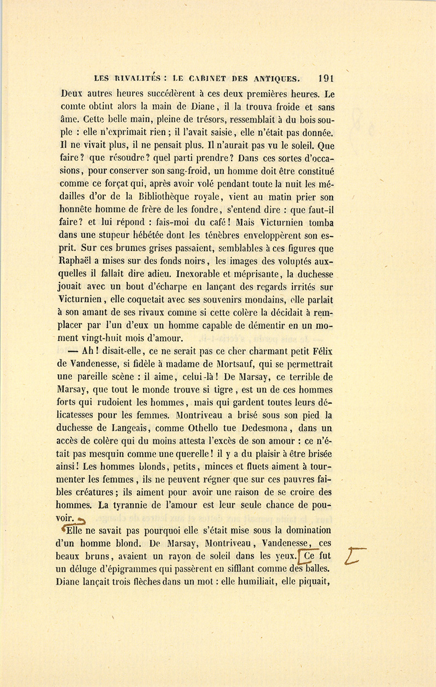 Par ses délicatesses de femme, mademoiselle Armande ôtait toute rudesse au commerce du marquis avec son ancien intendant ; {p. 152} quoique sous cette rudesse, Chesnel devinât une affection magnifique. L’attachement du marquis pour son ancien domestique constituait une passion semblable à celle que le maître a pour son chien, et qui le porterait à se battre avec qui donnerait un coup de pied à sa bête : il la regarde comme une partie intégrante de son existence, comme une chose qui, sans être tout à fait lui, le représente dans ce qu’il a de plus cher, les sentiments.