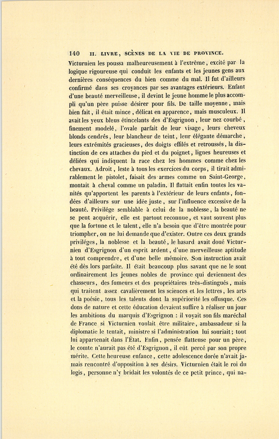 Le dogme de sa suprématie fut inculqué au comte Victurnien dès qu’une idée put lui entrer dans la cervelle. Hors le Roi, tous les seigneurs du royaume étaient ses égaux. Au-dessous de la noblesse, il n’y avait pour lui que des inférieurs, des gens avec lesquels il n’avait rien de commun, envers lesquels il n’était tenu à rien, des ennemis vaincus, conquis desquels il ne fallait faire aucun compte, dont les opinions devaient être indifférentes à un gentilhomme, et qui tous lui devaient du respect. Ces opinions, {p. 140} Victurnien les poussa malheureusement à l’extrême, excité par la logique rigoureuse qui conduit les enfants et les jeunes gens aux dernières conséquences du bien comme du mal. Il fut d’ailleurs confirmé dans ses croyances par ses avantages extérieurs. Enfant d’une beauté merveilleuse, il devint le jeune homme le plus accompli qu’un père puisse désirer pour fils. De taille moyenne, mais bien fait, il était mince, délicat en apparence, mais musculeux. Il avait les yeux bleus étincelants des d’Esgrignon, leur nez courbé, finement modelé, l’ovale parfait de leur visage, leurs cheveux blond cendré3, leur blancheur de teint, leur élégante démarche, leurs extrémités gracieuses, des doigts effilés et retroussés, la distinction de ces attaches du pied et du poignet, lignes heureuses et déliées qui indiquent la race chez les hommes comme chez les chevaux. Adroit, leste à tous les exercices du corps, il tirait admirablement le pistolet, faisait des armes comme un Saint-Georges4, montait à cheval comme un paladin. Il flattait enfin toutes les vanités qu’apportent les parents à l’extérieur de leurs enfants, fondées d’ailleurs sur une idée juste, sur l’influence excessive de la beauté. Privilége semblable à celui de la noblesse, la beauté ne se peut acquérir, elle est partout reconnue, et vaut souvent plus que la fortune et le talent, elle n’a besoin que d’être montrée pour triompher, on ne lui demande que d’exister. Outre ces deux grands priviléges, la noblesse et la beauté, le hasard avait doué Victurnien d’Esgrignon d’un esprit ardent, d’une merveilleuse aptitude à tout comprendre, et d’une belle mémoire. Son instruction avait été dès lors parfaite. Il était beaucoup plus savant que ne le sont ordinairement les jeunes nobles de province qui deviennent des chasseurs, des fumeurs et des propriétaires très-distingués, mais qui traitent assez cavalièrement les sciences et les lettres, les arts et la poésie, tous les talents dont la supériorité les offusque. Ces dons de nature et cette éducation devaient suffire à réaliser un jour les ambitions du marquis d’Esgrignon : il voyait son fils maréchal de France si Victurnien voulait être militaire, ambassadeur si la diplomatie le tentait, ministre si l’administration lui souriait ; tout lui appartenait dans l’État. Enfin, pensée flatteuse pour un père, le comte n’aurait pas été d’Esgrignon, il eût percé par son propre mérite. Cette heureuse enfance, cette adolescence dorée n’avait jamais rencontré d’opposition à ses désirs. Victurnien était le roi du logis, personne n’y bridait les volontés de ce petit prince, qui {p. 141} naturellement devint égoïste comme un prince, entier comme le plus fougueux cardinal du moyen-âge, impertinent et audacieux, vices que chacun divinisait en y voyant les qualités essentielles au noble.