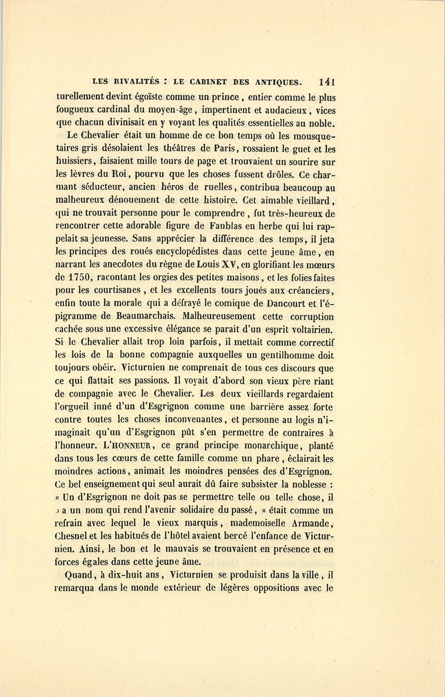 Le Chevalier était un homme de ce bon temps où les mousquetaires gris désolaient les théâtres de Paris, rossaient le guet et les huissiers, faisaient mille tours de page et trouvaient un sourire sur les lèvres du Roi, pourvu que les choses fussent drôles. Ce charmant séducteur, ancien héros de ruelles, contribua beaucoup au malheureux dénouement de cette histoire. Cet aimable vieillard, qui ne trouvait personne pour le comprendre, fut très-heureux de rencontrer cette adorable figure de Faublas en herbe qui lui rappelait sa jeunesse. Sans apprécier la différence des temps, il jeta les principes des roués encyclopédistes dans cette jeune âme, en narrant les anecdotes du règne de Louis XV, en glorifiant les mœurs de 1750, racontant les orgies des petites maisons, et les folies faites pour les courtisanes, et les excellents tours joués aux créanciers, enfin toute la morale qui a défrayé le comique de Dancourt et l’épigramme de Beaumarchais. Malheureusement cette corruption cachée sous une excessive élégance se parait d’un esprit voltairien. Si le Chevalier allait trop loin parfois, il mettait comme correctif les lois de la bonne compagnie auxquelles un gentilhomme doit toujours obéir. Victurnien ne comprenait de tous ces discours que ce qui flattait ses passions. Il voyait d’abord son vieux père riant de compagnie avec le Chevalier. Les deux vieillards regardaient l’orgueil inné d’un d’Esgrignon comme une barrière assez forte contre toutes les choses inconvenantes, et personne au logis n’imaginait qu’un d’Esgrignon pût s’en permettre de contraires à l’honneur. L’honneur, ce grand principe monarchique, planté dans tous les cœurs de cette famille comme un phare, éclairait les moindres actions, animait les moindres pensées des d’Esgrignon. Ce bel enseignement qui seul aurait dû faire subsister la noblesse : « Un d’Esgrignon ne doit pas se permettre telle ou telle chose, il a un nom qui rend l’avenir solidaire du passé », était comme un refrain avec lequel le vieux marquis, mademoiselle Armande, Chesnel et les habitués de l’hôtel avaient bercé l’enfance de Victurnien. Ainsi, le bon et le mauvais se trouvaient en présence et en forces égales dans cette jeune âme.