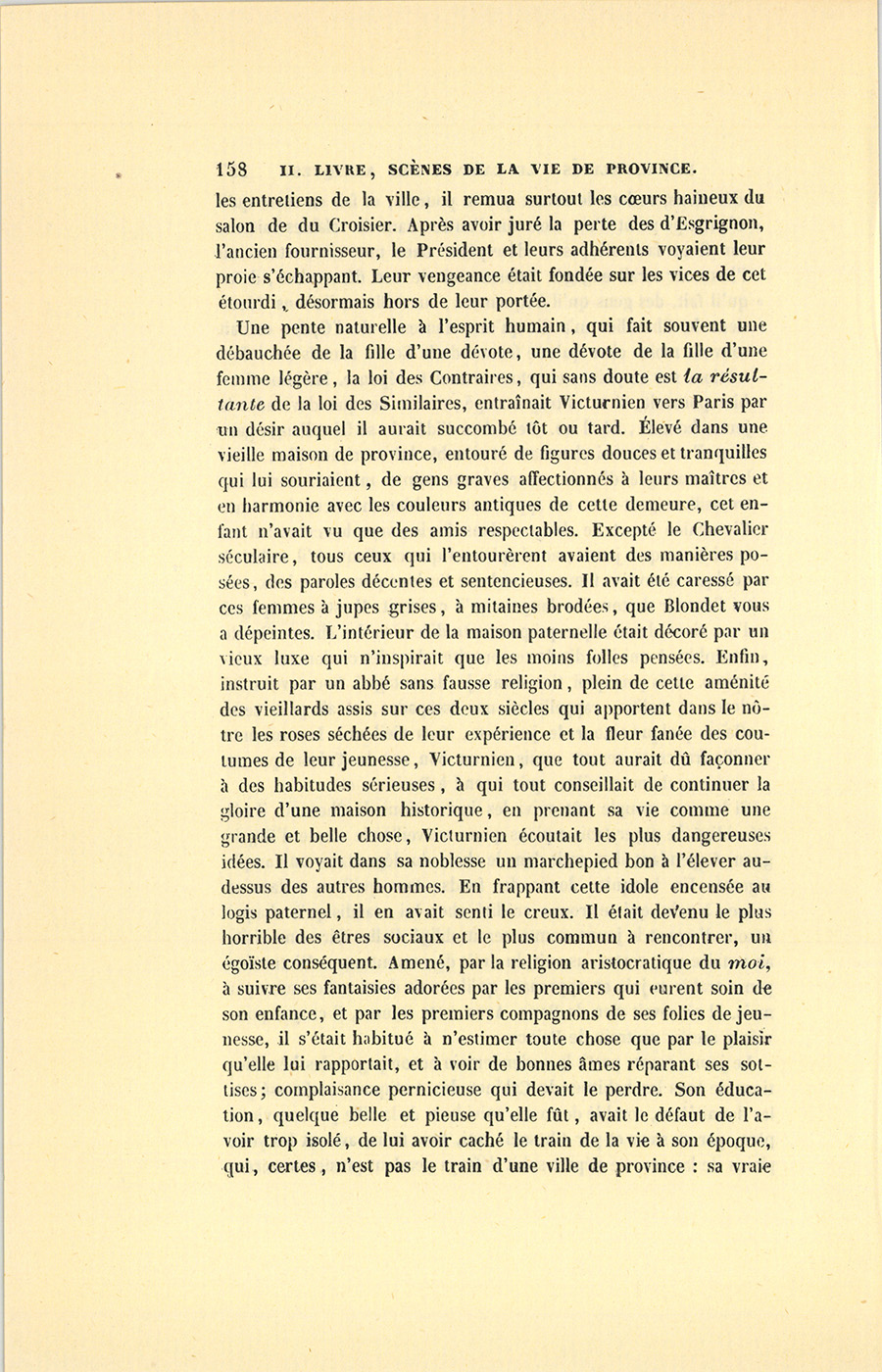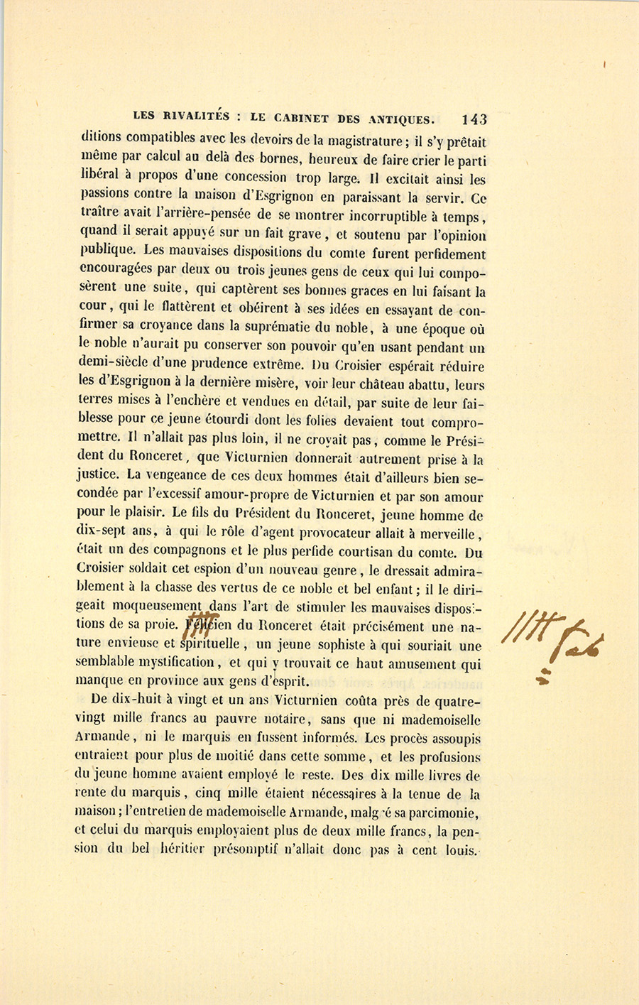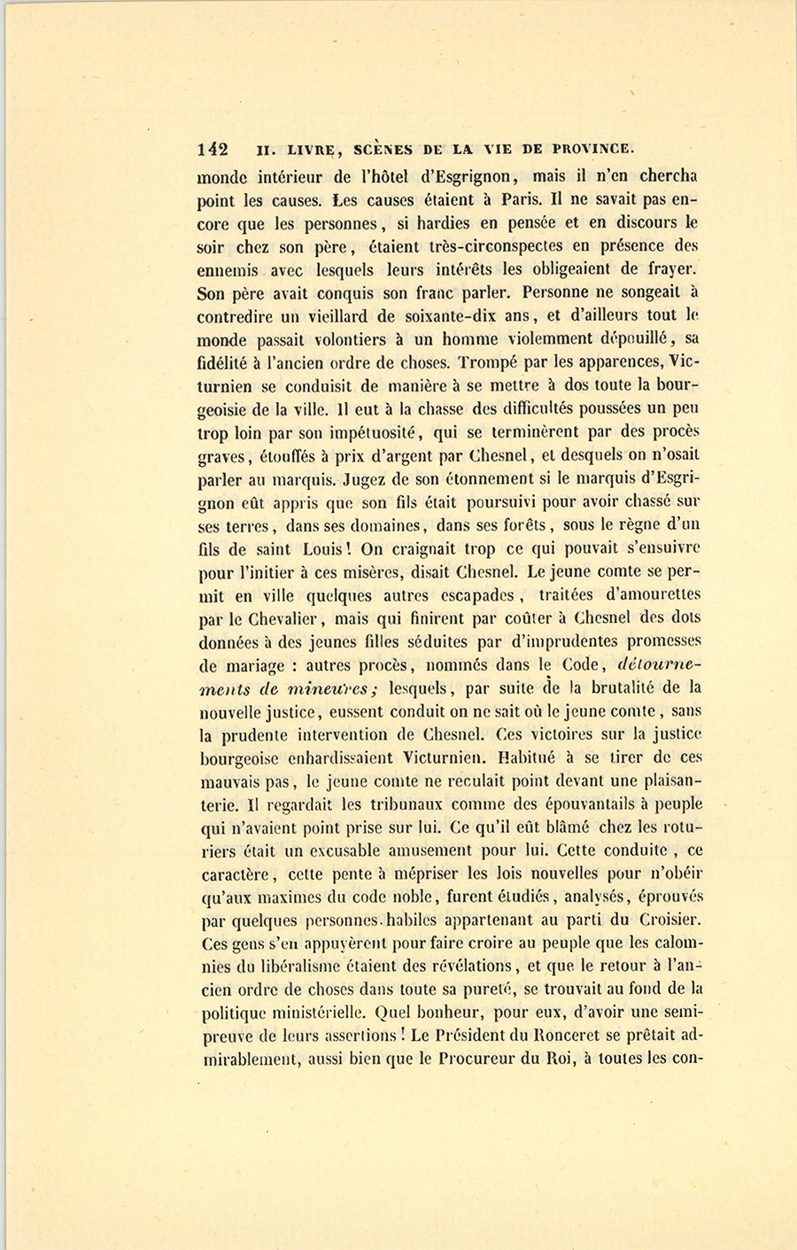 Quand, à dix-huit ans, Victurnien se produisit dans la ville, il remarqua dans le monde extérieur de légères oppositions avec le {p. 142} monde intérieur de l’hôtel d’Esgrignon, mais il n’en chercha point les causes. Les causes étaient à Paris. Il ne savait pas encore que les personnes, si hardies en pensée et en discours le soir chez son père, étaient très-circonspectes en présence des ennemis avec lesquels leurs intérêts les obligeaient de frayer. Son père avait conquis son franc parler. Personne ne songeait à contredire un vieillard de soixante-dix ans, et d’ailleurs tout le monde passait volontiers à un homme violemment dépouillé, sa fidélité à l’ancien ordre de choses. Trompé par les apparences, Victurnien se conduisit de manière à se mettre à dos toute la bourgeoisie de la ville. Il eut à la chasse des difficultés poussées un peu trop loin par son impétuosité, qui se terminèrent par des procès graves, étouffés à prix d’argent par Chesnel, et desquels on n’osait parler au marquis. Jugez de son étonnement si le marquis d’Esgrignon eût appris que son fils était poursuivi pour avoir chassé sur ses terres, dans ses domaines, dans ses forêts, sous le règne d’un fils de saint Louis ! On craignait trop ce qui pouvait s’ensuivre pour l’initier à ces misères, disait Chesnel. Le jeune comte se permit en ville quelques autres escapades, traitées d’amourettes par le Chevalier, mais qui finirent par coûter à Chesnel des dots données à des jeunes filles séduites par d’imprudentes promesses de mariage : autres procès, nommés dans le Code, détournements de mineures ; lesquels, par suite de la brutalité de la nouvelle justice, eussent conduit on ne sait où le jeune comte, sans la prudente intervention de Chesnel. Ces victoires sur la justice bourgeoise enhardissaient Victurnien. Habitué à se tirer de ces mauvais pas, le jeune comte ne reculait point devant une plaisanterie. Il regardait les tribunaux comme des épouvantails à peuple qui n’avaient point prise sur lui. Ce qu’il eût blâmé chez les roturiers était un excusable amusement pour lui. Cette conduite, ce caractère, cette pente à mépriser les lois nouvelles pour n’obéir qu’aux maximes du code noble, furent étudiés, analysés, éprouvés par quelques personnes habiles appartenant au parti du Croisier. Ces gens s’en appuyèrent pour faire croire au peuple que les calomnies du libéralisme étaient des révélations, et que le retour à l’ancien ordre de choses dans toute sa pureté, se trouvait au fond de la politique ministérielle. Quel bonheur, pour eux, d’avoir une semi-preuve de leurs assertions ! Le Président du Ronceret se prêtait admirablement, aussi bien que le Procureur du Roi, à toutes les {p. 143} conditions compatibles avec les devoirs de la magistrature ; il s’y prêtait même par calcul au delà des bornes, heureux de faire crier le parti libéral à propos d’une concession trop large. Il excitait ainsi les passions contre la maison d’Esgrignon en paraissant la servir. Ce traître avait l’arrière-pensée de se montrer incorruptible à temps, quand il serait appuyé sur un fait grave, et soutenu par l’opinion publique. Les mauvaises dispositions du comte furent perfidement encouragées par deux ou trois jeunes gens de ceux qui lui composèrent une suite, qui captèrent ses bonnes grâces5 en lui faisant la cour, qui le flattèrent et obéirent à ses idées en essayant de confirmer sa croyance dans la suprématie du noble, à une époque où le noble n’aurait pu conserver son pouvoir qu’en usant pendant un demi-siècle d’une prudence extrême. Du Croisier espérait réduire les d’Esgrignon à la dernière misère, voir leur château abattu, leurs terres mises à l’enchère et vendues en détail, par suite de leur faiblesse pour ce jeune étourdi dont les folies devaient tout compromettre. Il n’allait pas plus loin, il ne croyait pas, comme le Président du Ronceret, que Victurnien donnerait autrement prise à la justice. La vengeance de ces deux hommes était d’ailleurs bien secondée par l’excessif amour-propre de Victurnien et par son amour pour le plaisir. Le fils du Président du Ronceret, jeune homme de dix-sept ans, à qui le rôle d’agent provocateur allait à merveille, était un des compagnons et le plus perfide courtisan du comte. Du Croisier soldait cet espion d’un nouveau genre, le dressait admirablement à la chasse des vertus de ce noble et bel enfant ; il le dirigeait moqueusement dans l’art de stimuler les mauvaises dispositions de sa proie. Fabien du Ronceret était précisément une nature envieuse et spirituelle, un jeune sophiste à qui souriait une semblable mystification, et qui y trouvait ce haut amusement qui manque en province aux gens d’esprit.