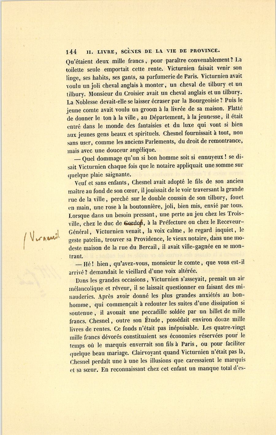 De dix-huit à vingt et un ans Victurnien coûta près de quatre-vingt mille francs au pauvre notaire, sans que ni mademoiselle Armande, ni le marquis en fussent informés. Les procès assoupis entraient pour plus de moitié dans cette somme, et les profusions du jeune homme avaient employé le reste. Des dix mille livres de rente du marquis, cinq mille étaient nécessaires à la tenue de la maison ; l’entretien de mademoiselle Armande, malgré sa parcimonie, et celui du marquis employaient plus de deux mille francs, la pension du bel héritier présomptif n’allait donc pas à cent louis. {p. 144} Qu’étaient deux mille francs, pour paraître convenablement ? La toilette seule emportait cette rente. Victurnien faisait venir son linge, ses habits, ses gants, sa parfumerie de Paris. Victurnien avait voulu un joli cheval anglais à monter, un cheval de tilbury et un tilbury. Monsieur du Croisier avait un cheval anglais et un tilbury. La Noblesse devait-elle se laisser écraser par la Bourgeoisie ? Puis le jeune comte avait voulu un groom à la livrée de sa maison. Flatté de donner le ton à la ville, au Département, à la jeunesse, il était entré dans le monde des fantaisies et du luxe qui vont si bien aux jeunes gens beaux et spirituels. Chesnel fournissait à tout, non sans user, comme les anciens Parlements, du droit de remontrance, mais avec une douceur angélique.