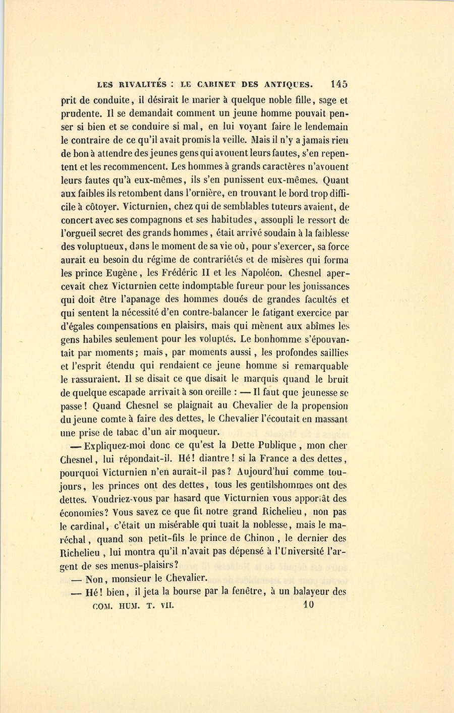 – Expliquez-moi donc ce qu’est la Dette Publique, mon cher Chesnel, lui répondait-il. Hé ! diantre ! si la France a des dettes, pourquoi Victurnien n’en aurait-il pas ? Aujourd’hui comme toujours, les princes ont des dettes, tous les gentilshommes ont des dettes. Voudriez-vous par hasard que Victurnien vous apportât des économies ? Vous savez ce que fit notre grand Richelieu, non pas le cardinal, c’était un misérable qui tuait la noblesse, mais le maréchal, quand son petit-fils le prince de Chinon, le dernier des Richelieu, lui montra qu’il n’avait pas dépensé à l’Université l’argent de ses menus-plaisirs ?
