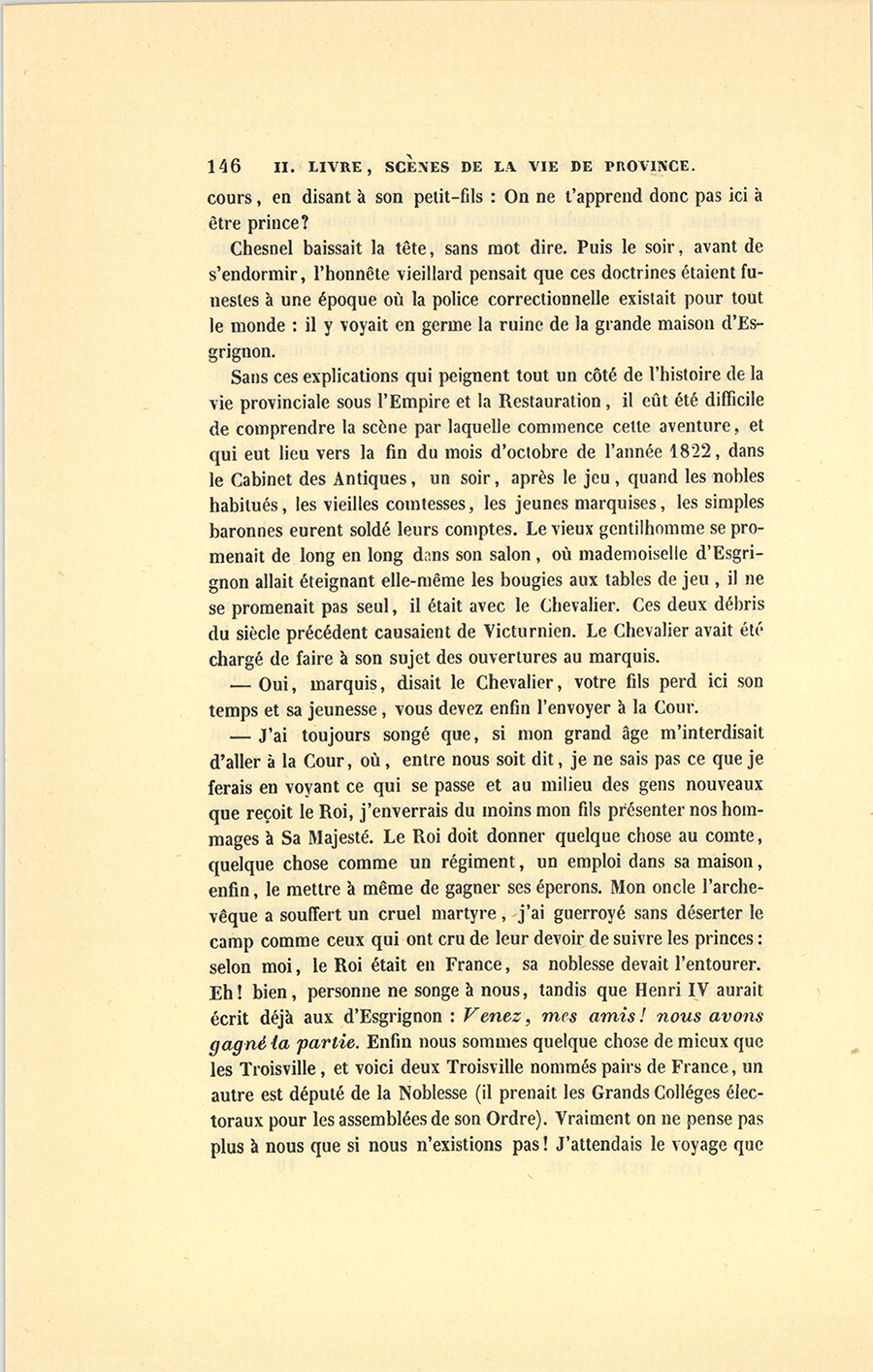 – J’ai toujours songé que, si mon grand âge m’interdisait d’aller à la Cour, où, entre nous soit dit, je ne sais pas ce que je ferais en voyant ce qui se passe et au milieu des gens nouveaux que reçoit le Roi, j’enverrais du moins mon fils présenter nos hommages à Sa Majesté. Le Roi doit donner quelque chose au comte, quelque chose comme un régiment, un emploi dans sa maison, enfin, le mettre à même de gagner ses éperons. Mon oncle l’archevêque a souffert un cruel martyre, j’ai guerroyé sans déserter le camp comme ceux qui ont cru de leur devoir de suivre les princes : selon moi, le Roi était en France, sa noblesse devait l’entourer. Eh ! bien, personne ne songe à nous, tandis que Henri IV aurait écrit déjà aux d’Esgrignon : Venez, mes amis ! nous avons gagné la partie. Enfin nous sommes quelque chose de mieux que les Troisville, et voici deux Troisville nommés pairs de France, un autre est député de la Noblesse (il prenait les Grands Colléges électoraux pour les assemblées de son ordre). Vraiment on ne pense pas plus à nous que si nous n’existions pas ! J’attendais le voyage que {p. 147} les princes devaient faire par ici ; mais les princes ne viennent pas à nous, il faut donc aller à eux…