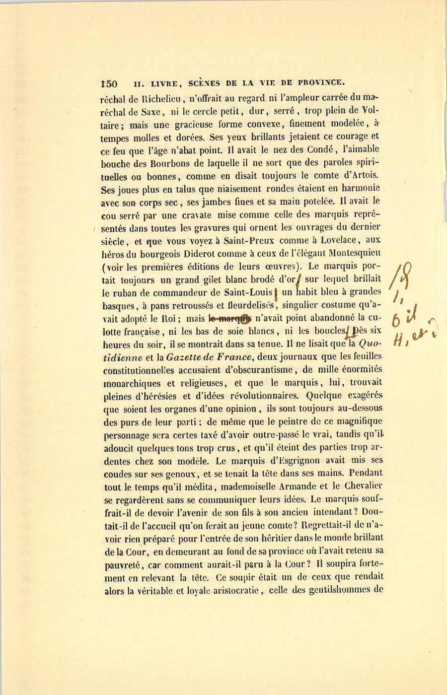 Le marquis d’Esgrignon avait alors la physionomie que les imaginations un peu poétiques lui voudraient. Sa tête presque chauve avait encore des cheveux blancs soyeux, placés à l’arrière de la tête et retombant par mèches plates mais bouclées aux extrémités. Son beau front plein de noblesse, ce front que l’on admire dans la tête de Louis XV, dans celle de Beaumarchais et dans celle du {p. 150} maréchal de Richelieu, n’offrait au regard ni l’ampleur carrée du maréchal de Saxe, ni le cercle petit, dur, serré, trop plein de Voltaire ; mais une gracieuse forme convexe, finement modelée, à tempes molles et dorées. Ses yeux brillants jetaient ce courage et ce feu que l’âge n’abat point. Il avait le nez des Condé, l’aimable bouche des Bourbons de laquelle il ne sort que des paroles spirituelles ou bonnes, comme en disait toujours le comte d’Artois. Ses joues plus en talus que niaisement rondes étaient en harmonie avec son corps sec, ses jambes fines et sa main potelée. Il avait le cou serré par une cravate mise comme celle des marquis représentés dans toutes les gravures qui ornent les ouvrages du dernier siècle, et que vous voyez à Saint-Preux comme à Lovelace, aux héros du bourgeois Diderot comme à ceux de l’élégant Montesquieu (voir les premières éditions de leurs œuvres). Le marquis portait toujours un grand gilet blanc brodé d’or sur lequel brillait le ruban de commandeur de Saint-Louis, un habit bleu à grandes basques, à pans retroussés et fleurdelisés, singulier costume qu’avait adopté le Roi ; mais il n’avait point abandonné la culotte française, ni les bas de soie blancs, ni les boucles, et dès six heures du soir, il se montrait dans sa tenue. Il ne lisait que la Quotidienne et la Gazette de France, deux journaux que les feuilles constitutionnelles accusaient d’obscurantisme, de mille énormités monarchiques et religieuses, et que le marquis, lui, trouvait pleines d’hérésies et d’idées révolutionnaires. Quelque exagérés que soient les organes d’une opinion, ils sont toujours au-dessous des purs de leur parti ; de même que le peintre de ce magnifique personnage sera certes taxé d’avoir outre-passé le vrai, tandis qu’il adoucit quelques tons trop crus, et qu’il éteint des parties trop ardentes chez son modèle. Le marquis d’Esgrignon avait mis ses coudes sur ses genoux, et se tenait la tête dans ses mains. Pendant tout le temps qu’il médita, mademoiselle Armande et le Chevalier se regardèrent sans se communiquer leurs idées. Le marquis souffrait-il de devoir l’avenir de son fils à son ancien intendant ? Doutait-il de l’accueil qu’on ferait au jeune comte ? Regrettait-il de n’avoir rien préparé pour l’entrée de son héritier dans le monde brillant de la Cour, en demeurant au fond de sa province où l’avait retenu sa pauvreté, car comment aurait-il paru à la Cour ? Il soupira fortement en relevant la tête. Ce soupir était un de ceux que rendait alors la véritable et loyale aristocratie, celle des gentilshommes de {p. 151} province, alors si négligés, comme la plupart de ceux qui avaient saisi leur épée et résisté pendant l’orage.