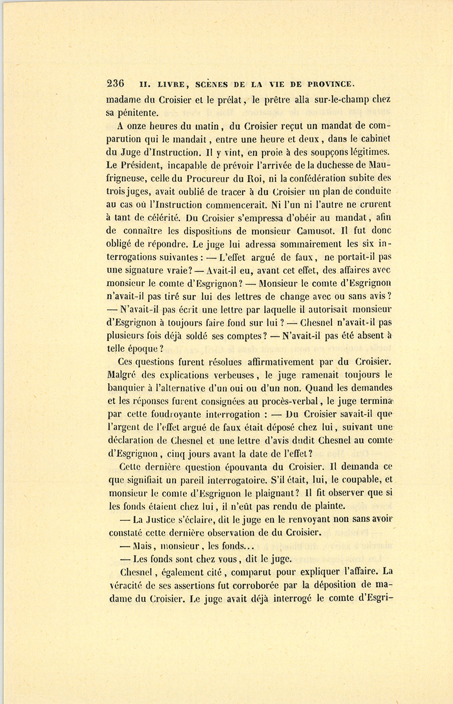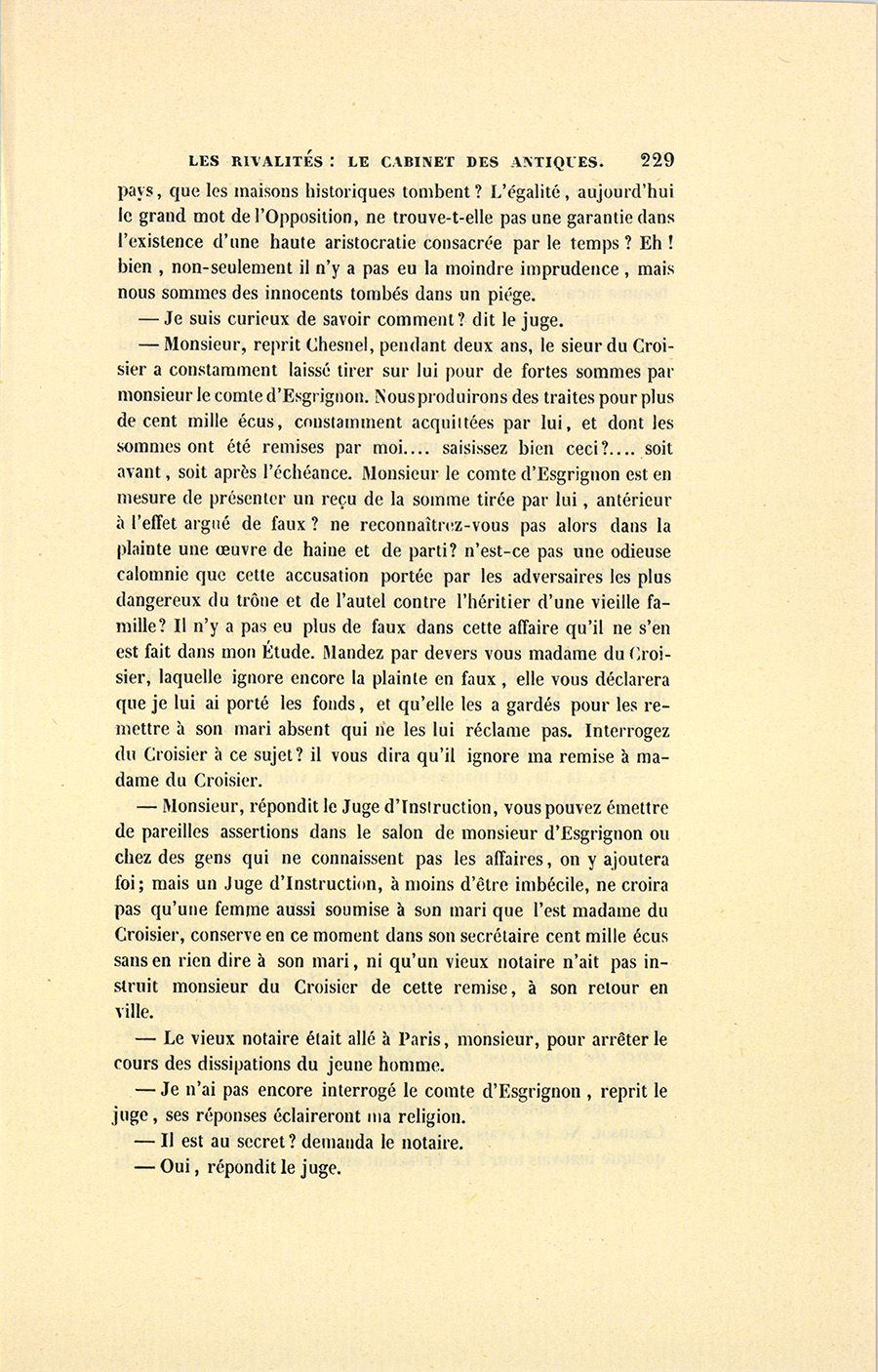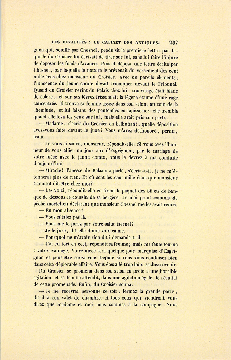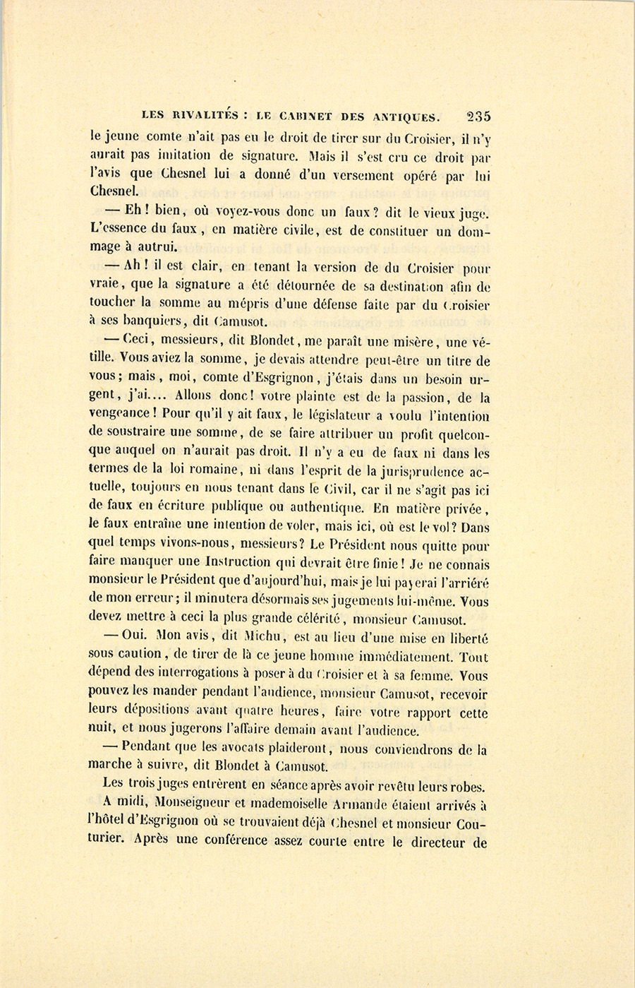– Vous croyez, dit Camusot. Mais d’abord, en supposant que {p. 235} le jeune comte n’ait pas eu le droit de tirer sur du Croisier, il n’y aurait pas imitation de signature. Mais il s’est cru ce droit par l’avis que Chesnel lui a donné d’un versement opéré par lui Chesnel.