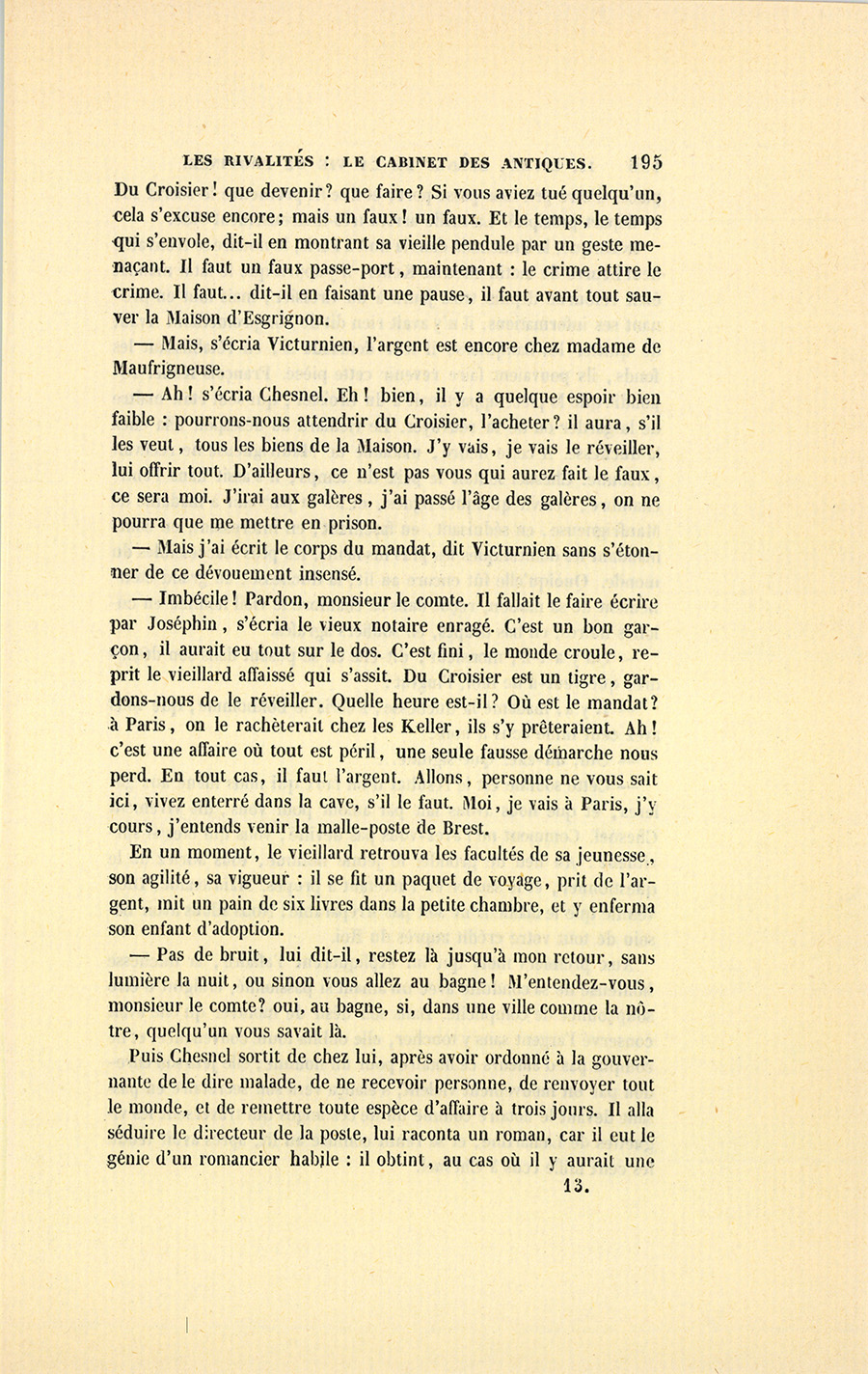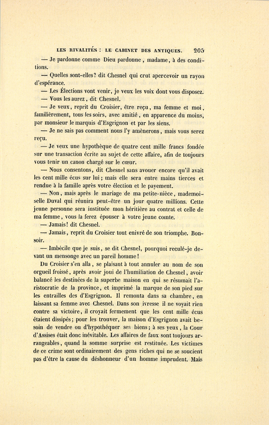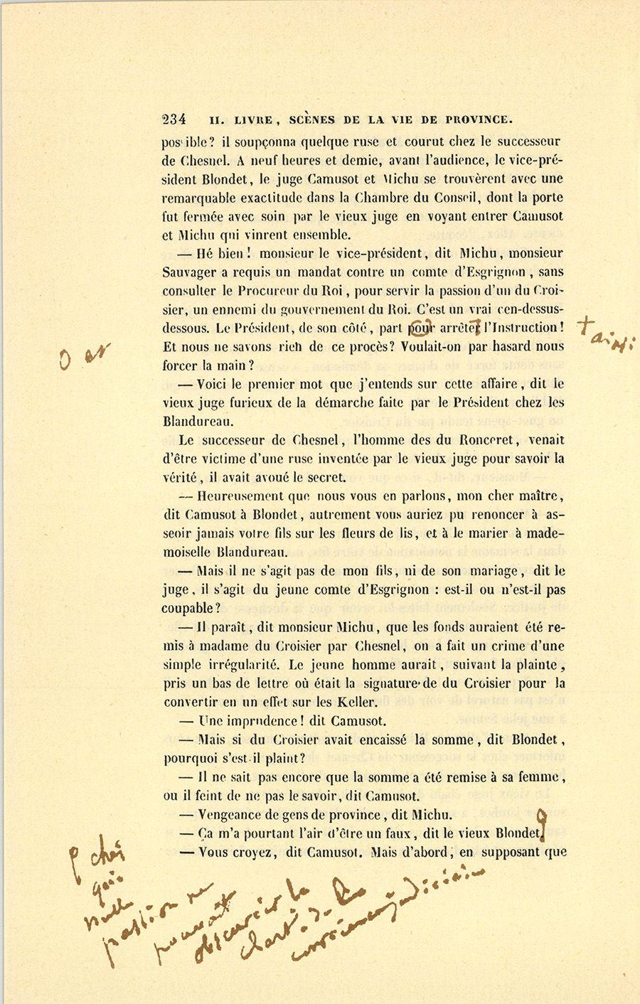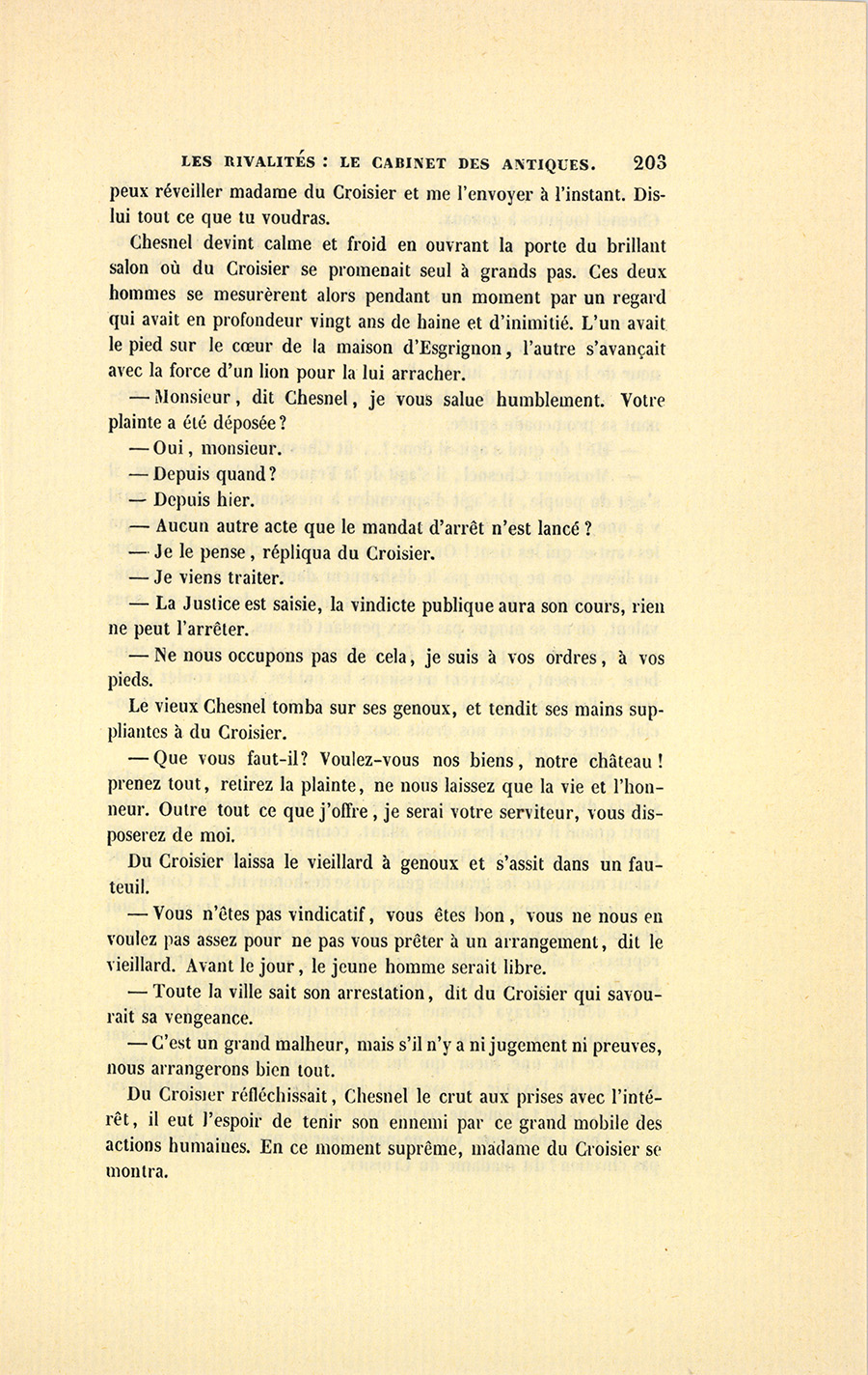 – Vous croyez, dit Camusot. Mais d’abord, en supposant que {p. 235} le jeune comte n’ait pas eu le droit de tirer sur du Croisier, il n’y aurait pas imitation de signature. Mais il s’est cru ce droit par l’avis que Chesnel lui a donné d’un versement opéré par lui Chesnel.