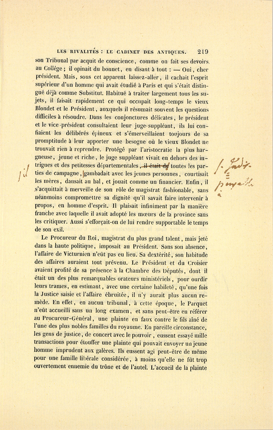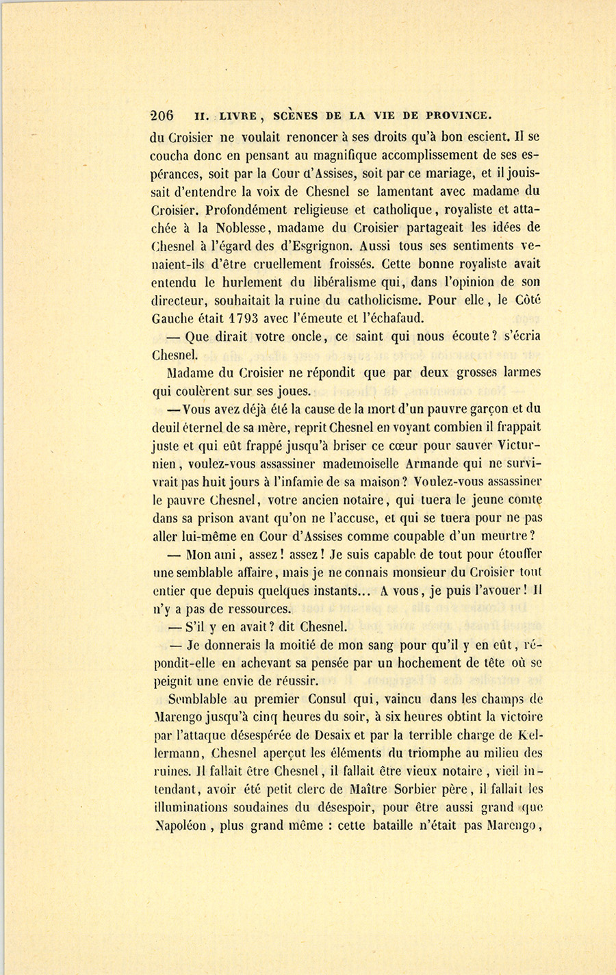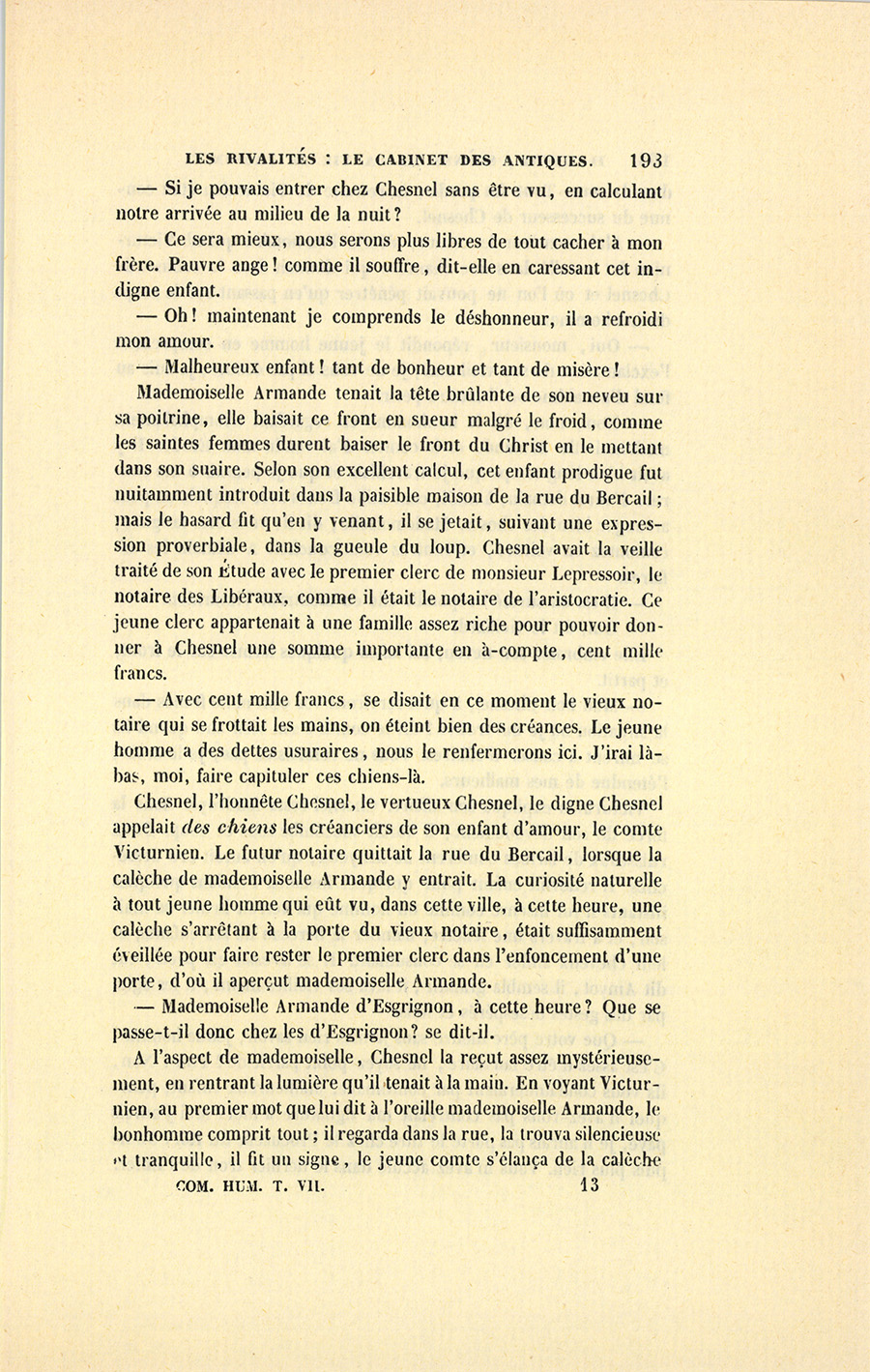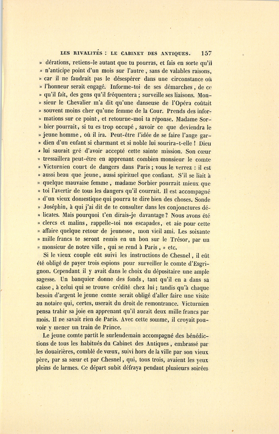 – Vous croyez, dit Camusot. Mais d’abord, en supposant que {p. 235} le jeune comte n’ait pas eu le droit de tirer sur du Croisier, il n’y aurait pas imitation de signature. Mais il s’est cru ce droit par l’avis que Chesnel lui a donné d’un versement opéré par lui Chesnel.