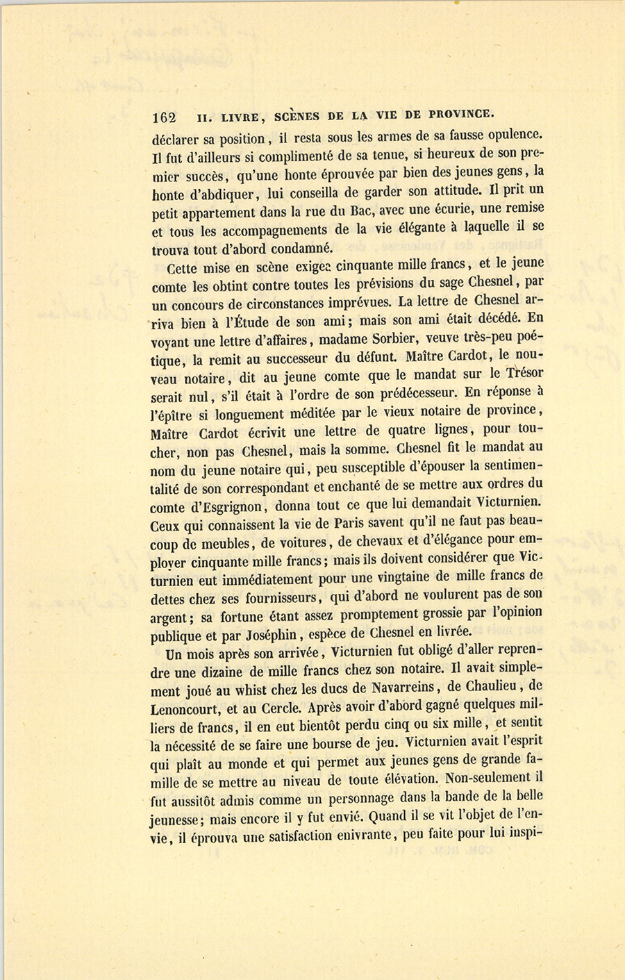 Veuf et sans enfants, Chesnel avait adopté le fils de son ancien maître au fond de son cœur, il jouissait de le voir traversant la grande rue de la ville, perché sur le double coussin de son tilbury, fouet en main, une rose à la boutonnière, joli, bien mis, envié par tous. Lorsque dans un besoin pressant, une perte au jeu chez les Troisville, chez le duc de Verneuil, à la Préfecture ou chez le Receveur-Général, Victurnien venait, la voix calme, le regard inquiet, le geste patelin, trouver sa Providence, le vieux notaire, dans une modeste maison de la rue du Bercail, il avait ville-gagnée en se montrant.