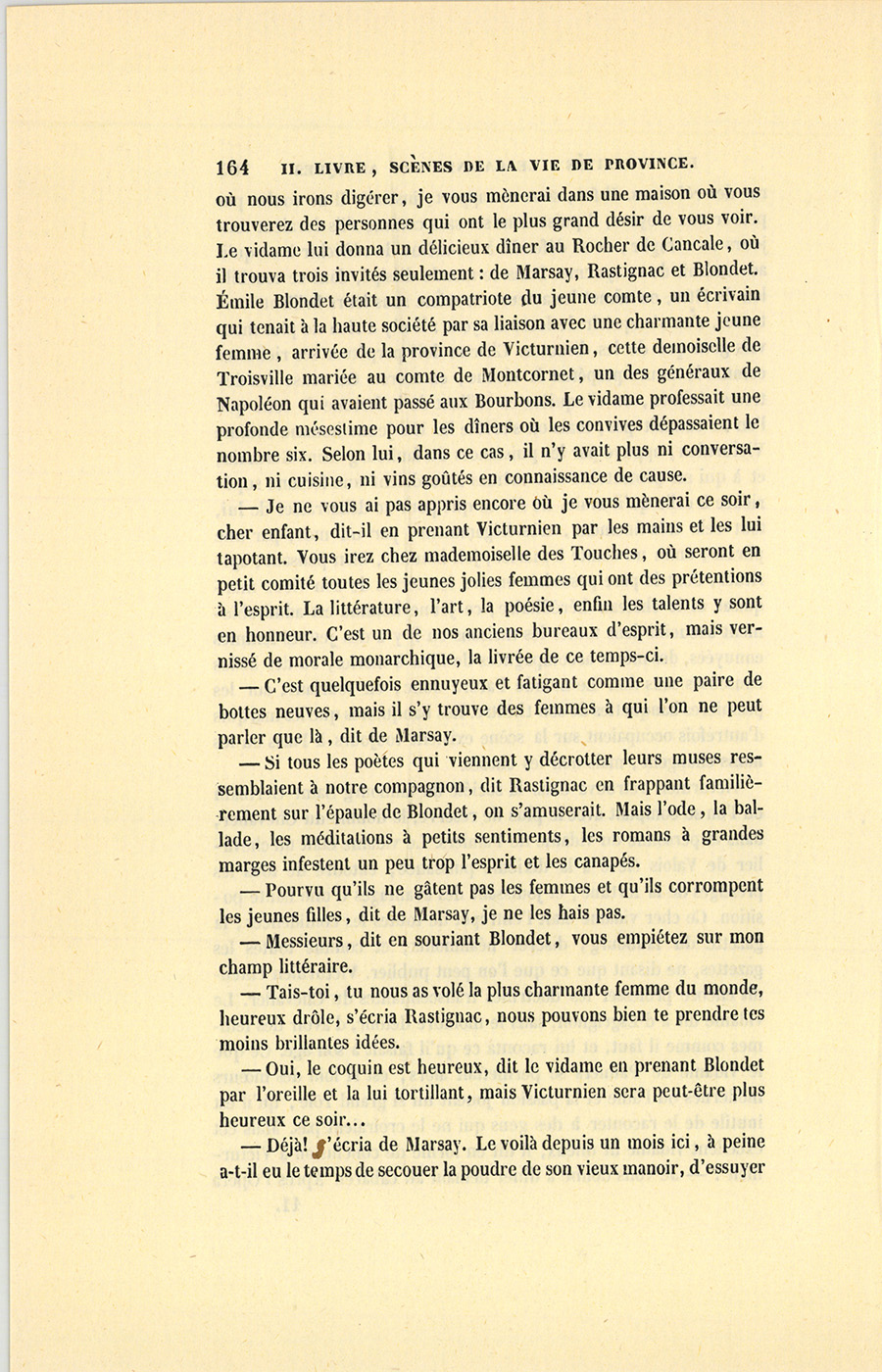 – Je suis enchanté de savoir que vous pensez à produire notre cher Victurnien dans le monde, dit habilement le Chevalier. Cette ville est un trou dans lequel il ne doit pas enterrer ses talents. Tout ce qu’il peut y rencontrer, c’est quéque Normande ben sotte, ben mal apprise et riche. Qué qu’il en ferait ?… sa femme. Ah ! bon Dieu !