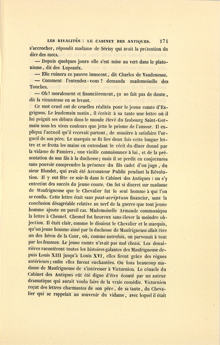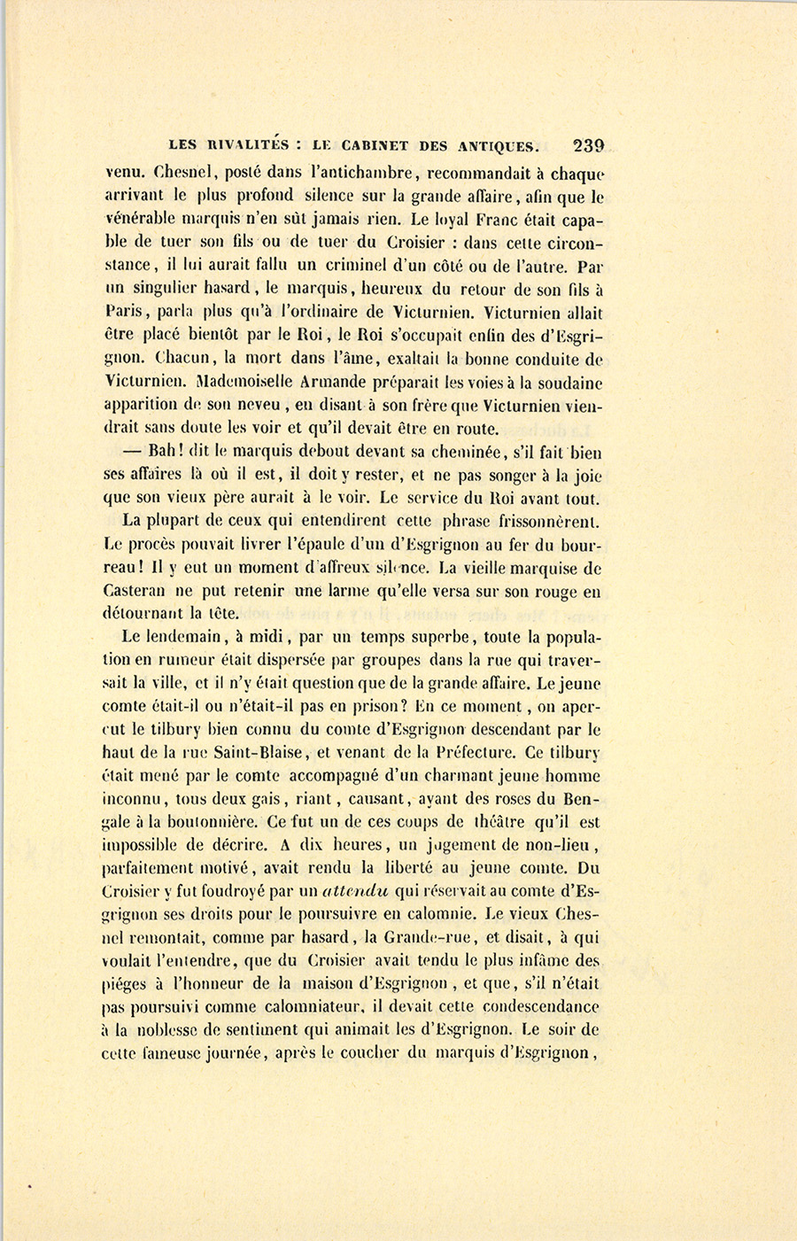 Mademoiselle Armande descendit au salon, et trouva le Cabinet des Antiques au grand complet. Autant pour fêter Monseigneur que pour entourer le marquis d’Esgrignon, chacun des habitués était {p. 239} venu. Chesnel, posté dans l’antichambre, recommandait à chaque arrivant le plus profond silence sur la grande affaire, afin que le vénérable marquis n’en sût jamais rien. Le loyal Franc était capable de tuer son fils ou de tuer du Croisier : dans cette circonstance, il lui aurait fallu un criminel d’un côté ou de l’autre. Par un singulier hasard, le marquis, heureux du retour de son fils à Paris, parla plus qu’à l’ordinaire de Victurnien. Victurnien allait être placé bientôt par le Roi, le Roi s’occupait enfin des d’Esgrignon. Chacun, la mort dans l’âme, exaltait la bonne conduite de Victurnien. Mademoiselle Armande préparait les voies à la soudaine apparition de son neveu, en disant à son frère que Victurnien viendrait sans doute les voir et qu’il devait être en route.