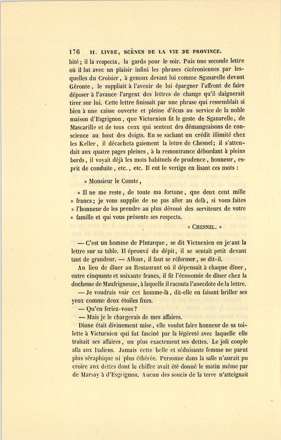 – Le comte d’Esgrignon doit cent mille livres à un Chesnel, s’écria le vieillard en donnant les signes d’une profonde douleur. Ah ! s’il n’était pas fils unique, il partirait ce soir pour les îles avec un brevet de capitaine ! Devoir à des usuriers avec lesquels on s’acquitte par de gros intérêts, bon ! mais Chesnel, un homme auquel on s’attache.