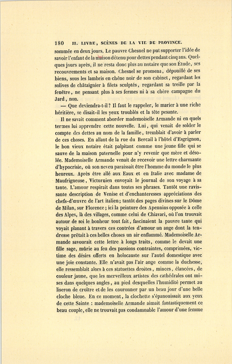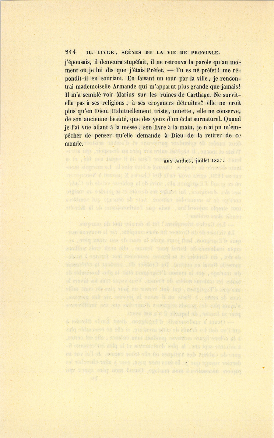 – Quant à mademoiselle d’Esgrignon, disait Émile Blondet à qui l’on doit les détails de cette aventure, si elle ne ressemble plus à la céleste figure entrevue pendant mon enfance, elle est certes, à soixante-sept ans, la plus douloureuse et la plus intéressante figure du Cabinet des Antiques où elle trône encore. Je l’ai vue au dernier voyage que je fis dans mon pays, pour y aller chercher les papiers nécessaires à mon mariage. Quand mon père apprit qui {p. 244} j’épousais, il demeura stupéfait, il ne retrouva la parole qu’au moment où je lui dis que j’étais Préfet. – Tu es né préfet ! me répondit-il en souriant. En faisant un tour par la ville, je rencontrai mademoiselle Armande qui m’apparut plus grande que jamais ! Il m’a semblé voir Marius sur les ruines de Carthage. Ne survit-elle pas à ses religions, à ses croyances détruites ? elle ne croit plus qu’en Dieu. Habituellement triste, muette, elle ne conserve, de son ancienne beauté, que des yeux d’un éclat surnaturel. Quand je l’ai vue allant à la messe, son livre à la main, je n’ai pu m’empêcher de penser qu’elle demande à Dieu de la retirer de ce monde.