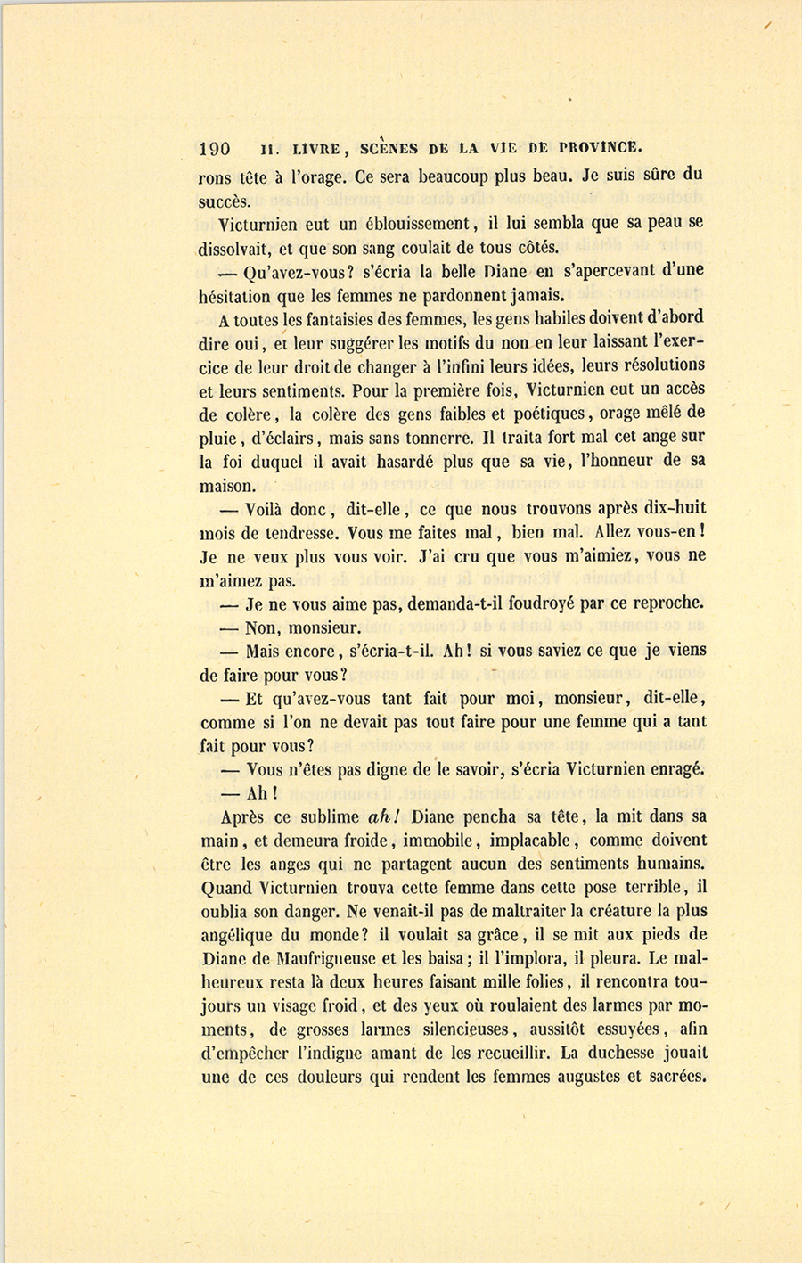 Diane avait disparu. Le fouet du postillon disait à Victurnien que le beau roman de sa première passion était fini. En danger, Diane avait encore pu voir dans le jeune comte son amant ; mais, sauvé, la duchesse le méprisait comme un homme faible qu’il était.