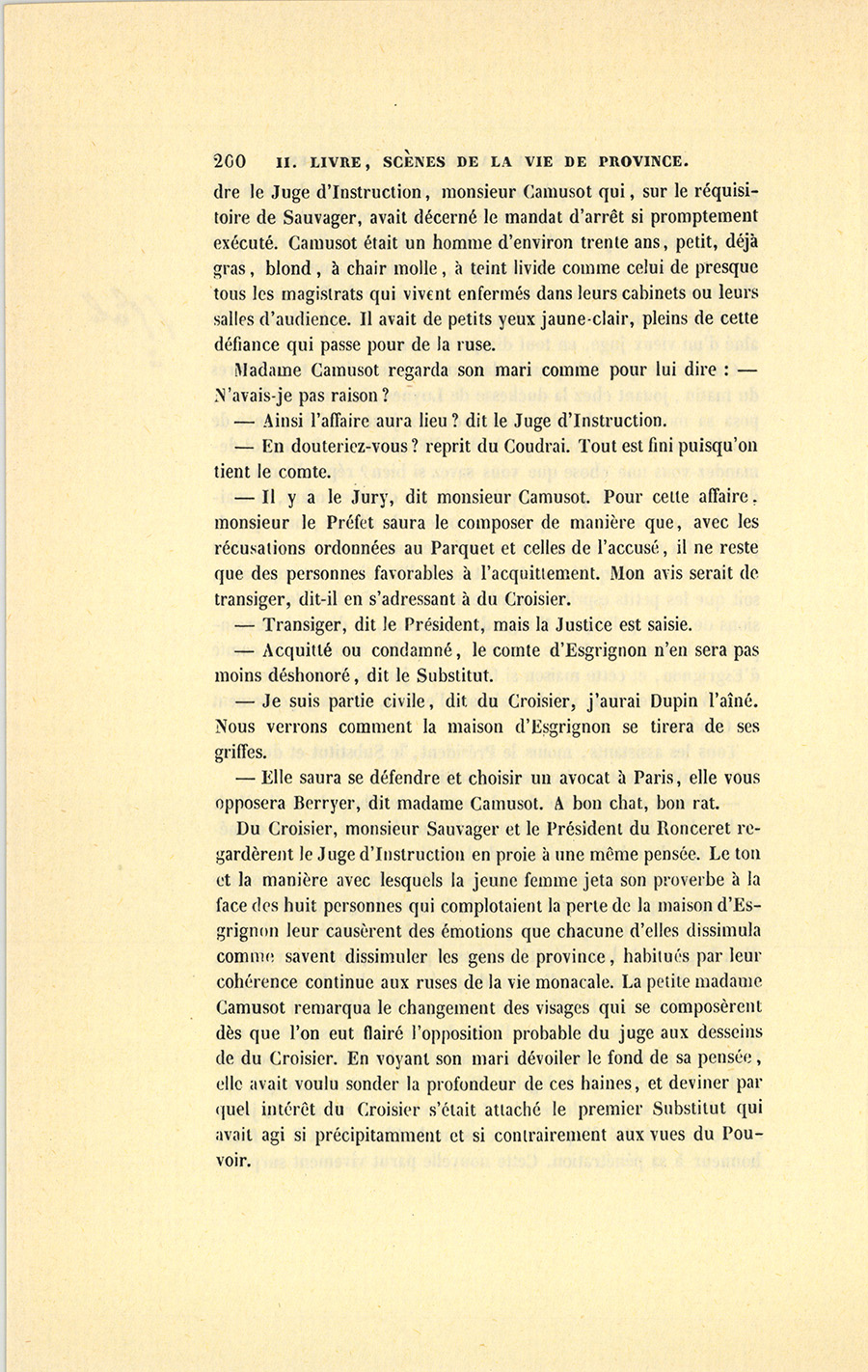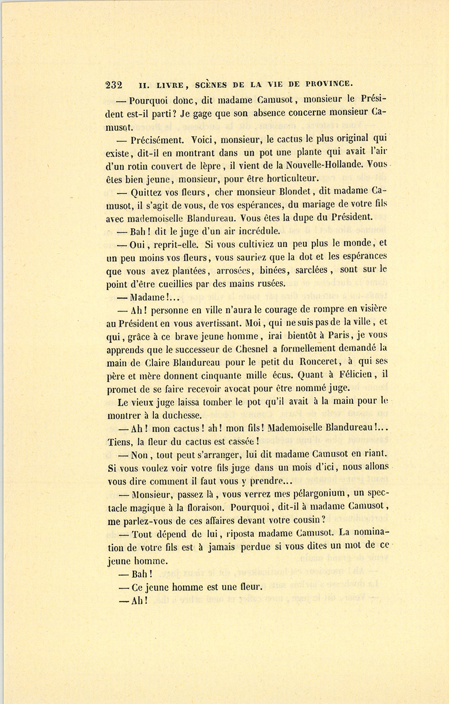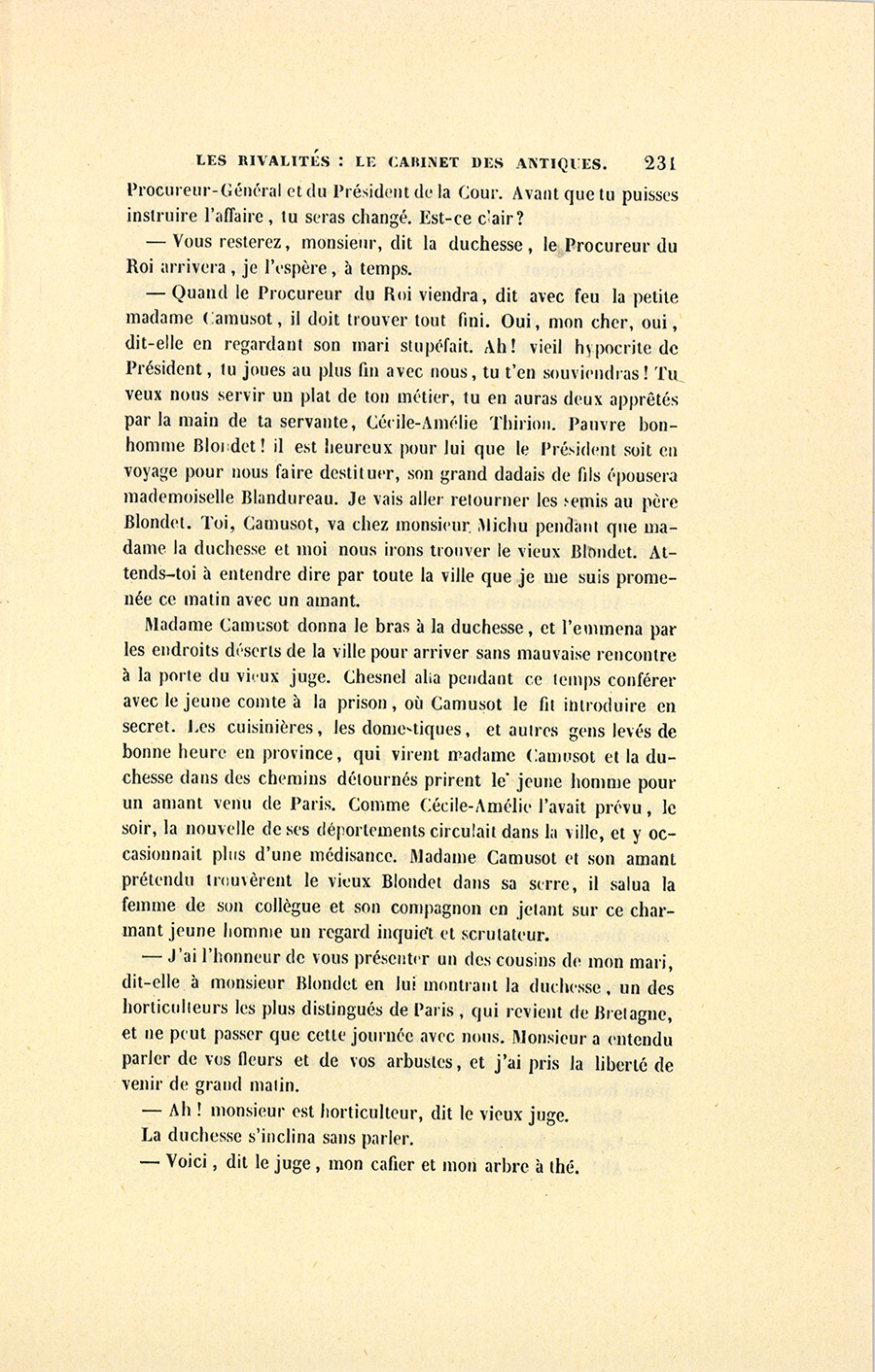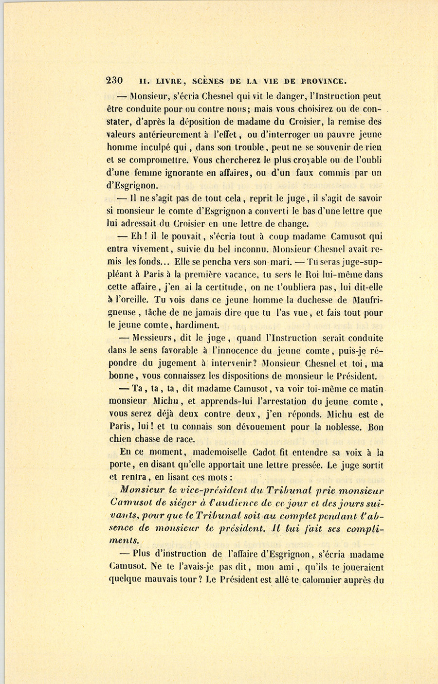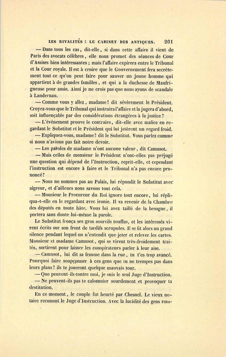 {p. 232} – Pourquoi donc, dit madame Camusot, monsieur le Président est-il parti ? Je gage que son absence concerne monsieur Camusot.