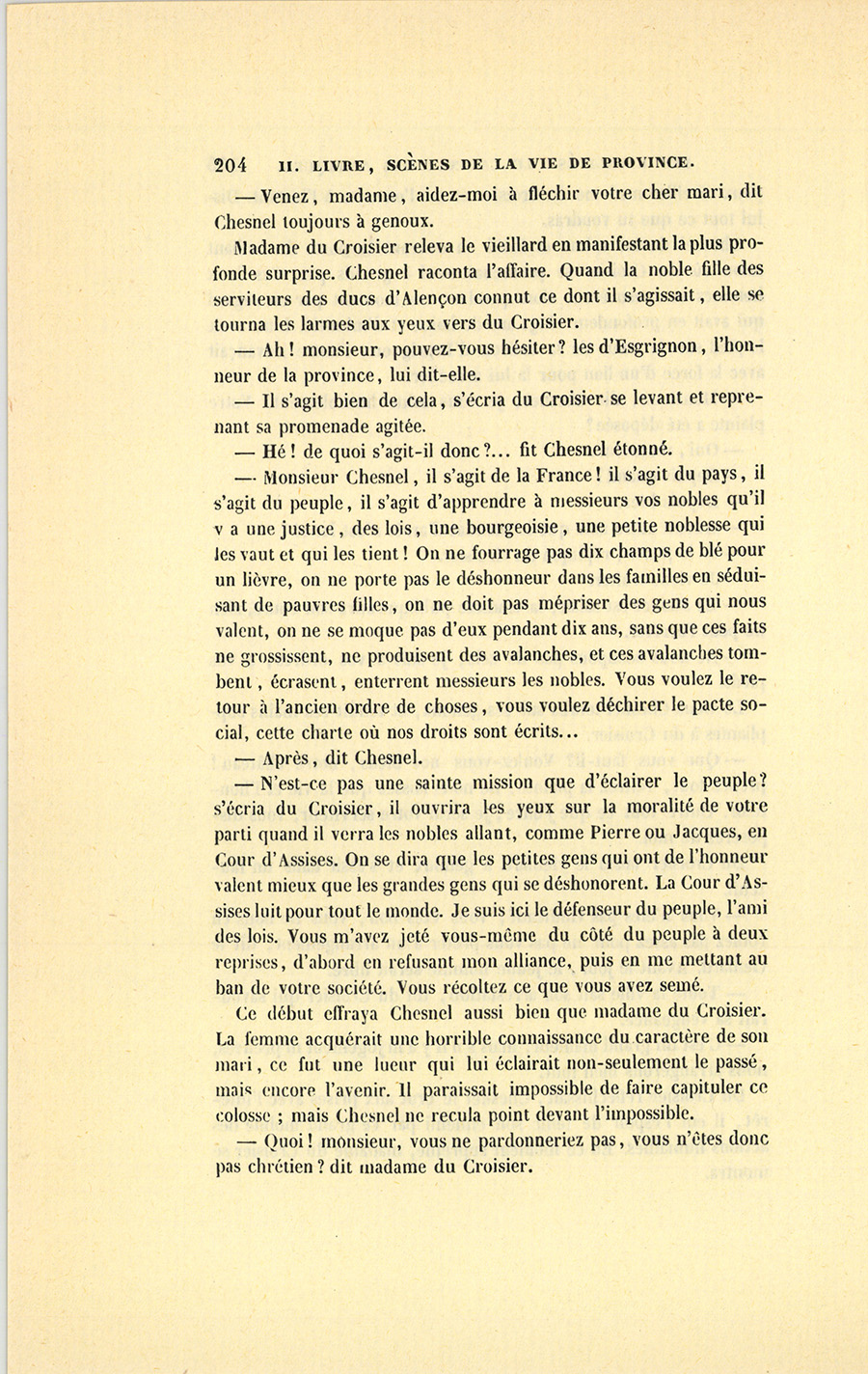 Maître Chesnel avait la confiance de toute la ville, il y était considéré ; sa haute probité, sa grande fortune contribuaient à lui donner de l’importance ; il eut dès lors une aversion décidée pour le sieur du Croisier. Quoique le notaire fût peu rancuneux, il fit épouser ses répugnances à bon nombre de familles. Du Croisier, homme haineux et capable de couver une vengeance pendant vingt ans, conçut pour le notaire et pour la famille d’Esgrignon une de ces haines sourdes et capitales, comme il s’en rencontre en province. Ce refus le tuait aux yeux des malicieux provinciaux parmi lesquels il était venu passer ses jours, et qu’il voulait dominer. Ce fut une catastrophe si réelle que les effets ne tardèrent pas à s’en faire sentir. Du Croisier fut également refusé par une vieille fille à laquelle il s’adressa en désespoir de cause. Ainsi les plans ambitieux qu’il avait formés d’abord, manquèrent une première fois par le refus de mademoiselle d’Esgrignon, de qui l’alliance lui aurait donné l’entrée dans le faubourg Saint-Germain de la province, puis le second refus le déconsidéra si fortement qu’il eut beaucoup de peine à se maintenir dans la seconde société de la ville.