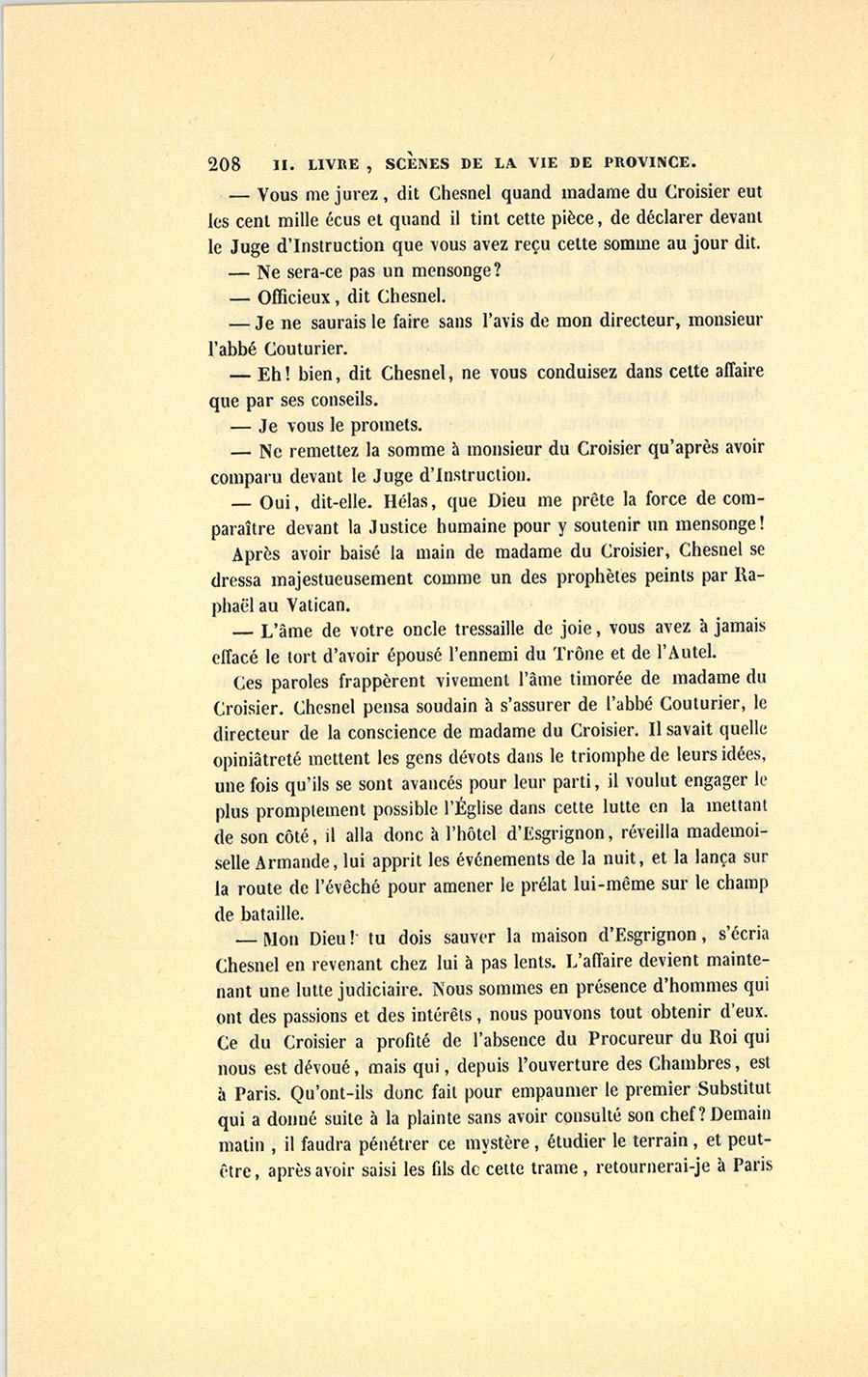 À midi, Monseigneur et mademoiselle Armande étaient arrivés à l’hôtel d’Esgrignon où se trouvaient déjà Chesnel et monsieur Couturier. Après une conférence assez courte entre le directeur de {p. 236} madame du Croisier et le prélat, le prêtre alla sur-le-champ chez sa pénitente.