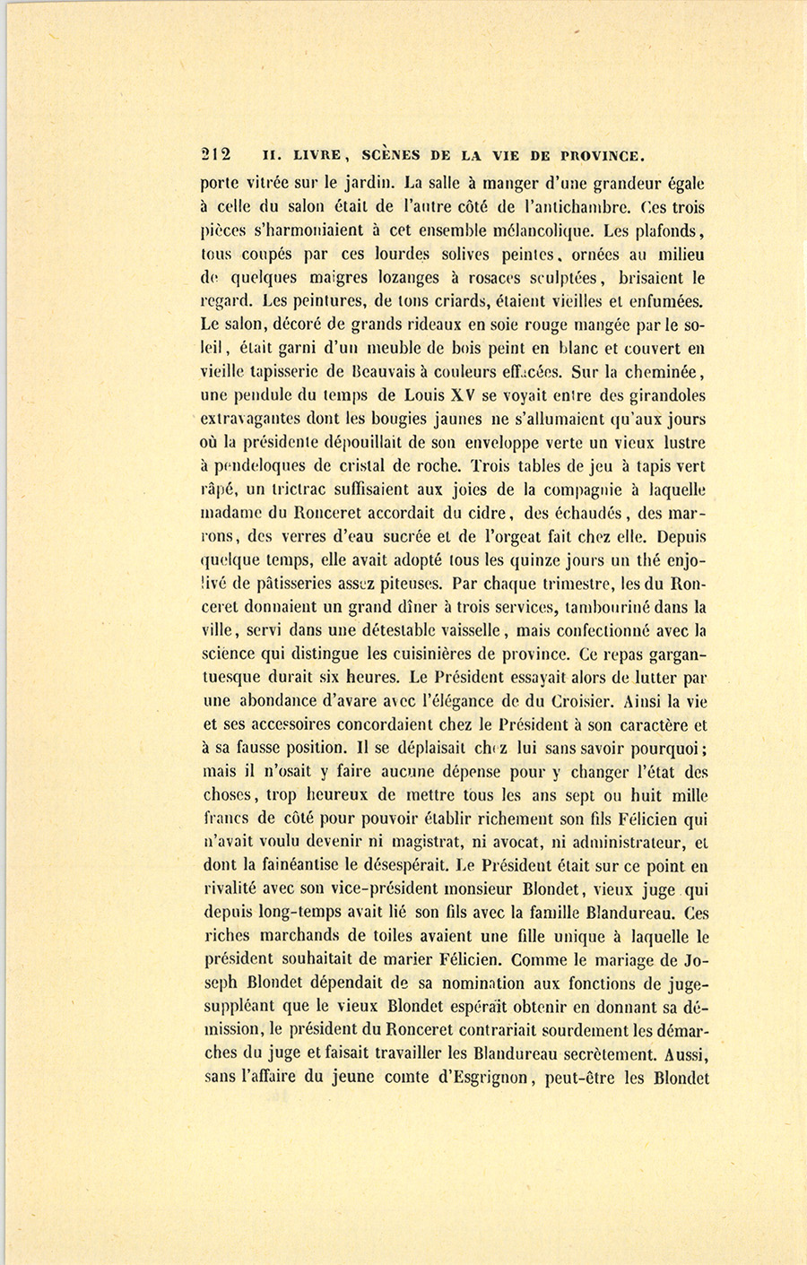 L’hôtel d’Esgrignon était tout bonnement la maison où demeurait un vieux gentilhomme, nommé Charles-Marie-Victor-Ange Carol, marquis d’Esgrignon ou des Grignons, suivant d’anciens titres. La société commerçante et bourgeoise de la ville avait épigrammatiquement nommé son logis un hôtel, et depuis une vingtaine d’années la plupart des habitants avaient fini par dire sérieusement l’hôtel d’Esgrignon en désignant la demeure du marquis.