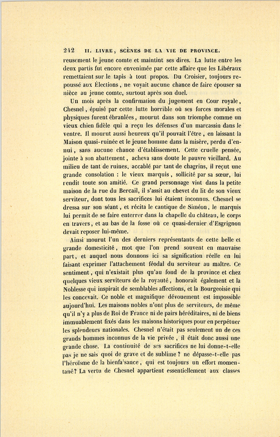 Ainsi mourut l’un des derniers représentants de cette belle et grande domesticité, mot que l’on prend souvent en mauvaise part, et auquel nous donnons ici sa signification réelle en lui faisant exprimer l’attachement féodal du serviteur au maître. Ce sentiment, qui n’existait plus qu’au fond de la province et chez quelques vieux serviteurs de la royauté, honorait également et la Noblesse qui inspirait de semblables affections, et la Bourgeoisie qui les concevait. Ce noble et magnifique dévouement est impossible aujourd’hui. Les maisons nobles n’ont plus de serviteurs, de même qu’il n’y a plus de Roi de France ni de pairs héréditaires, ni de biens immuablement fixés dans les maisons historiques pour en perpétuer les splendeurs nationales. Chesnel n’était pas seulement un de ces grands hommes inconnus de la vie privée, il était donc aussi une grande chose. La continuité de ses sacrifices ne lui donne-t-elle pas je ne sais quoi de grave et de sublime ? ne dépasse-t-elle pas l’héroïsme de la bienfaisance, qui est toujours un effort momentané ? La vertu de Chesnel appartient essentiellement aux classes {p. 243} placées entre les misères du peuple et les grandeurs de l’aristocratie, et qui peuvent unir ainsi les modestes vertus du Bourgeois aux sublimes pensées du Noble, en les éclairant aux flambeaux d’une solide instruction.