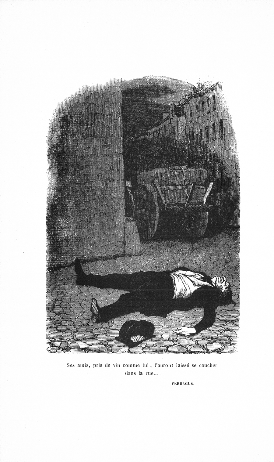 Le jeune homme se croisa les bras ; puis, n’étant vu de personne, il laissa rouler sur ses joues des larmes de rage sans les essuyer. Enfin, la vue des ombres qui se jouaient sur ces deux fenêtres éclairées lui faisait mal, il regarda au hasard dans la partie supérieure de la rue des Vieux-Augustins, et il vit un fiacre arrêté le long d’un mur, à un endroit où il n’y avait ni porte de maison ni lueur de boutique.