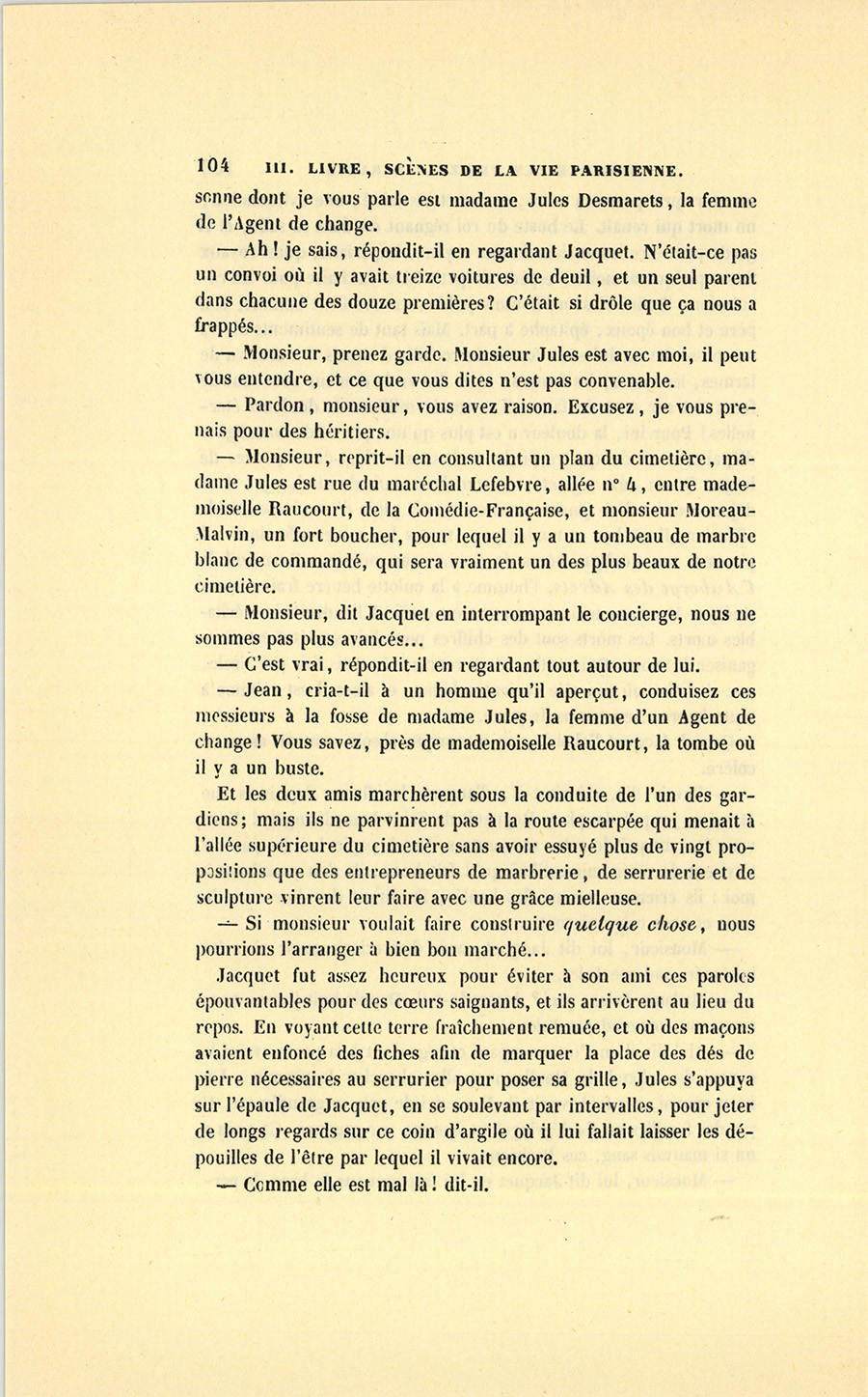 – Jean, cria-t-il à un homme qu’il aperçut, conduisez ces messieurs à la fosse de madame Jules ; la femme d’un Agent de change ! Vous savez, près de mademoiselle Raucourt, la tombe où il y a un buste.