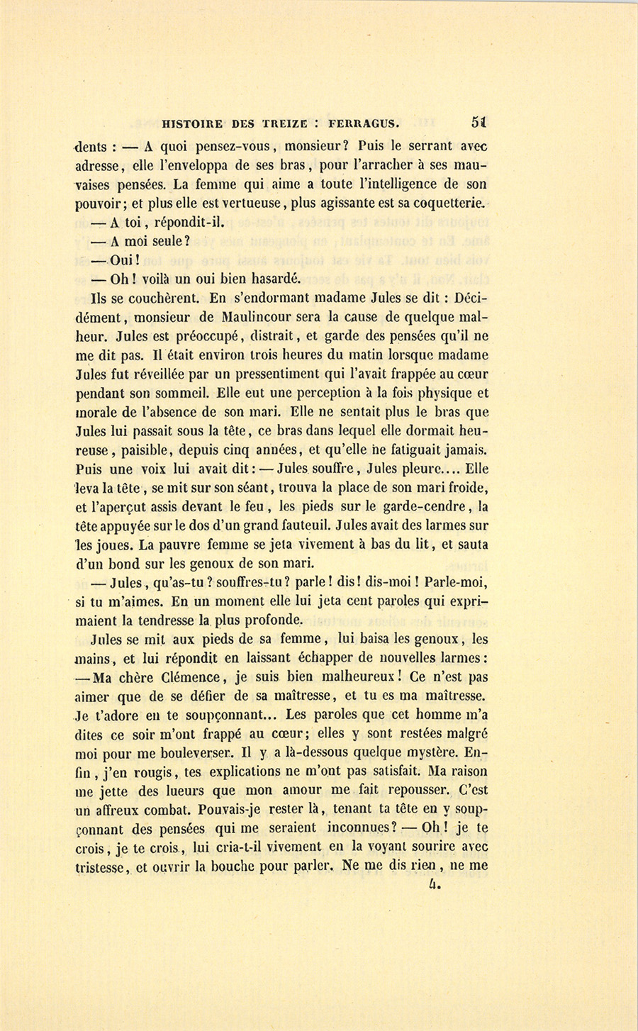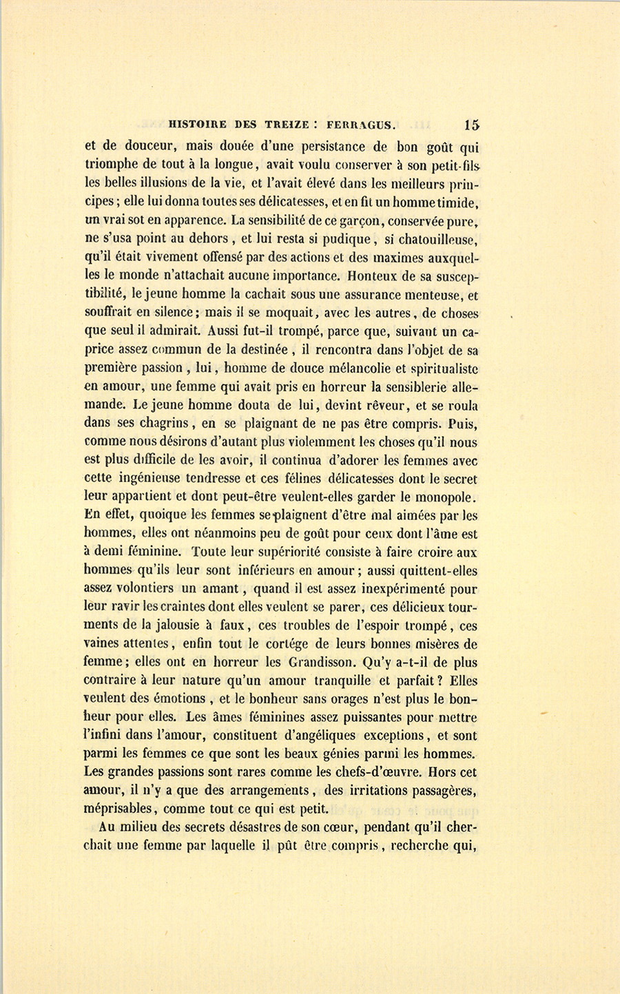 Puis la dame tourna lestement vers la rue de Ménars, et rentra chez elle. Quand la porte de l’hôtel où elle demeurait fut fermée, le jeune amant, ayant perdu toutes ses espérances, et, double malheur, ses plus chères croyances, alla dans Paris comme un homme ivre, et se trouva bientôt chez lui sans savoir comment il y était {p. 13} venu. Il se jeta dans un fauteuil, resta les pieds sur ses chenets, la tête entre les mains, séchant ses bottes mouillées, les brûlant même. Ce fut un moment affreux, un de ces moments où, dans la vie humaine, le caractère se modifie, et où la conduite du meilleur homme dépend du bonheur ou du malheur de sa première action. Providence ou Fatalité, choisissez.