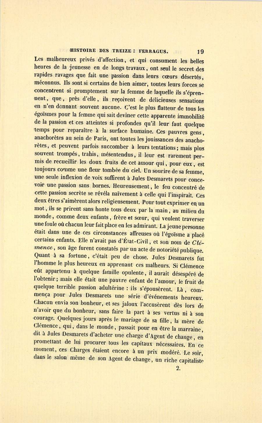 Monsieur Desmarets était, cinq ans avant son mariage, placé chez un Agent de change, et n’avait alors pour toute fortune que les maigres appointements d’un commis. Mais c’était un de ces hommes auxquels le malheur apprend hâtivement les choses de la vie, et qui suivent la ligne droite avec la ténacité d’un insecte voulant arriver à son gîte ; un de ces jeunes gens têtus qui font les morts devant les obstacles et lassent toutes les patiences par une patience de cloporte. Ainsi, jeune, il avait toutes les vertus républicaines des peuples pauvres : il était sobre, avare de son temps, ennemi des plaisirs. Il attendait. La nature lui avait d’ailleurs donné les immenses avantages d’un extérieur agréable. Son front calme et pur ; la coupe de sa figure placide, mais expressive ; ses manières simples, tout en lui révélait une existence laborieuse et résignée, cette haute dignité personnelle qui impose, et cette secrète noblesse de cœur qui résiste à toutes les situations. Sa modestie inspirait une sorte de respect à tous ceux qui le connaissaient. Solitaire d’ailleurs au milieu de Paris, il ne voyait le monde que par échappées, pendant le peu de moments qu’il passait dans le salon de son patron, les jours de fête. Il y avait chez ce jeune homme, comme chez la plupart des gens qui vivent ainsi, des passions d’une étonnante profondeur ; passions trop vastes pour se compromettre jamais dans de petits incidents. Son peu de fortune l’obligeait à une vie austère, et il domptait ses fantaisies par de grands travaux. Après avoir pâli sur les chiffres, il se délassait en essayant avec obstination d’acquérir cet ensemble de connaissances, aujourd’hui nécessaires à tout homme qui veut se faire remarquer dans le monde, dans le Commerce, au Barreau, dans la Politique ou dans les Lettres. Le seul écueil que rencontrent ces belles âmes est leur probité même. Voient-ils une pauvre fille, ils s’en amourachent, l’épousent, et usent leur existence à se débattre entre la misère et l’amour. La plus belle ambition s’éteint dans le livre de dépense du ménage. Jules Desmarets donna pleinement dans cet écueil. Un soir, il vit chez son patron une jeune personne de la plus rare beauté. {p. 19} Les malheureux privés d’affection, et qui consument les belles heures de la jeunesse en de longs travaux, ont seul le secret des rapides ravages que fait une passion dans leurs cœurs désertés, méconnus. Ils sont si certains de bien aimer, toutes leurs forces se concentrent si promptement sur la femme de laquelle ils s’éprennent, que, près d’elle, ils reçoivent de délicieuses sensations en n’en donnant souvent aucune. C’est le plus flatteur de tous les égoïsmes pour la femme qui sait deviner cette apparente immobilité de la passion et ces atteintes si profondes qu’il leur faut quelque temps pour reparaître à la surface humaine. Ces pauvres gens, anachorètes au sein de Paris, ont toutes les jouissances des anachorètes, et peuvent parfois succomber à leurs tentations ; mais plus souvent trompés, trahis, mésentendus, il leur est rarement permis de recueillir les doux fruits de cet amour qui, pour eux, est toujours comme une fleur tombée du ciel. Un sourire de sa femme, une seule inflexion de voix suffirent à Jules Desmarets pour concevoir une passion sans bornes. Heureusement, le feu concentré de cette passion secrète se révéla naïvement à celle qui l’inspirait. Ces deux êtres s’aimèrent alors religieusement. Pour tout exprimer en un mot, ils se prirent sans honte tous deux par la main, au milieu du monde, comme deux enfants, frère et sœur, qui veulent traverser une foule où chacun leur fait place en les admirant. La jeune personne était dans une de ces circonstances affreuses où l’égoïsme a placé certains enfants. Elle n’avait pas d’État-Civil, et son nom de Clémence, son âge furent constatés par un acte de notoriété publique. Quant à sa fortune, c’était peu de chose. Jules Desmarets fut l’homme le plus heureux en apprenant ces malheurs. Si Clémence eût appartenu à quelque famille opulente, il aurait désespéré de l’obtenir ; mais elle était une pauvre enfant de l’amour, le fruit de quelque terrible passion adultérine : ils s’épousèrent. Là, commença pour Jules Desmarets une série d’événements heureux. Chacun envia son bonheur, et ses jaloux l’accusèrent dès lors de n’avoir que du bonheur, sans faire la part à ses vertus ni à son courage. Quelques jours après le mariage de sa fille, la mère de Clémence, qui, dans le monde, passait pour en être la marraine, dit à Jules Desmarets d’acheter une charge d’Agent de change, en promettant de lui procurer tous les capitaux nécessaires. En ce moment, ces Charges étaient encore à un prix modéré. Le soir, dans le salon même de son Agent de change, un riche capitaliste {p. 20} proposa, sur la recommandation de cette dame, à Jules Desmarets, le plus avantageux marché qu’il fût possible de conclure, lui donna autant de fonds qu’il lui en fallait pour exploiter son privilége, et le lendemain l’heureux commis avait acheté la charge de son patron. En quatre ans, Jules Desmarets était devenu l’un des plus riches particuliers de sa compagnie ; des clients considérables vinrent augmenter le nombre de ceux que lui avait légués son prédécesseur. Il inspirait une confiance sans bornes, et il lui était impossible de méconnaître, dans la manière dont les affaires se présentaient à lui, quelque influence occulte due à sa belle-mère ou à une protection secrète qu’il attribuait à la Providence. Au bout de la troisième année, Clémence perdit sa marraine. En ce moment, monsieur Jules, que l’on nommait ainsi pour le distinguer de son frère aîné, qu’il avait établi notaire à Paris, possédait environ deux cent mille livres de rente. Il n’existait pas dans Paris un second exemple 