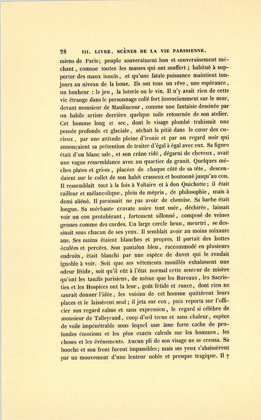 C’était, en apparence du moins, un mendiant, mais non pas le mendiant de Paris, création sans nom dans les langages humains ; non, cet homme formait un type nouveau frappé en dehors de toutes les idées réveillées par le mot de mendiant. L’inconnu ne se distinguait point par ce caractère originalement parisien qui nous saisit assez souvent dans les malheureux que Charlet a représentés parfois, avec un rare bonheur d’observation : c’est de grossières figures roulées dans la boue, à la voix rauque, au nez rougi et bulbeux, à bouches dépourvues de dents, quoique menaçantes ; humbles et terribles, chez lesquelles l’intelligence profonde qui brille dans les yeux semble être un contre-sens. Quelques-uns de ces vagabonds effrontés ont le teint marbré, gercé, veiné ; le front couvert de rugosités ; les cheveux rares et sales, comme ceux d’une perruque jetée au coin d’une borne. Tous gais dans leur dégradation, et dégradés dans leurs joies, tous marqués du sceau de la débauche jettent leur silence comme un reproche ; leur attitude révèle d’effrayantes pensées. Placés entre le crime et l’aumône, ils n’ont plus de remords, et tournent prudemment autour de l’échafaud sans y tomber, innocents au milieu du vice, et vicieux au milieu de leur innocence. Ils font souvent sourire, mais font toujours penser. L’un vous représente la civilisation rabougrie, il comprend tout : l’honneur du bagne, la patrie, la vertu ; puis c’est la malice du crime vulgaire, et les finesses d’un forfait élégant. L’autre est résigné, mime profond, mais stupide. Tous ont des velléités d’ordre et de travail, mais ils sont repoussés dans leur fange par une société qui ne veut pas s’enquérir de ce qu’il peut y avoir de poëtes, de grands hommes, de gens intrépides et d’organisations magnifiques parmi les mendiants, ces {p. 28} bohémiens de Paris ; peuple souverainement bon et souverainement méchant, comme toutes les masses qui ont souffert ; habitué à supporter des maux inouïs, et qu’une fatale puissance maintient toujours au niveau de la boue. Ils ont tous un rêve, une espérance, un bonheur : le jeu, la loterie ou le vin. Il n’y avait rien de cette vie étrange dans le personnage collé fort insouciamment sur le mur, devant monsieur de Maulincour, comme une fantaisie dessinée par un habile artiste derrière quelque toile retournée de son atelier. Cet homme long et sec, dont le visage plombé trahissait une pensée profonde et glaciale, séchait la pitié dans le cœur des curieux, par une attitude pleine d’ironie et par un regard noir qui annonçaient sa prétention de traiter d’égal à égal avec eux. Sa figure était d’un blanc sale, et son crâne ridé, dégarni de cheveux, avait une vague ressemblance avec un quartier de granit. Quelques mèches plates et grises, placées de chaque côté de sa tête, descendaient sur le collet de son habit crasseux et boutonné jusqu’au cou. Il ressemblait tout à la fois à Voltaire et à don Quichotte ; il était railleur et mélancolique, plein de mépris, de philosophie, mais à demi aliéné. Il paraissait ne pas avoir de chemise. Sa barbe était longue. Sa méchante cravate noire tout usée, déchirée, laissait voir un cou protubérant, fortement sillonné, composé de veines grosses comme des cordes. Un large cercle brun, meurtri, se dessinait sous chacun de ses yeux. Il semblait avoir au moins soixante ans. Ses mains étaient blanches et propres. Il portait des bottes éculées et percées. Son pantalon bleu, raccommodé en plusieurs endroits, était blanchi par une espèce de duvet qui le rendait ignoble à voir. Soit que ses vêtements mouillés exhalassent une odeur fétide, soit qu’il eût à l’état normal cette senteur de misère qu’ont les taudis parisiens, de même que les Bureaux, les Sacristies et les Hospices ont la leur, goût fétide et rance, dont rien ne saurait donner l’idée, les voisins de cet homme quittèrent leurs places et le laissèrent seul ; il jeta sur eux, puis reporta sur l’officier son regard calme et sans expression, le regard si célèbre de monsieur de Talleyrand, coup d’œil terne et sans chaleur, espèce de voile impénétrable sous lequel une âme forte cache de profondes émotions et les plus exacts calculs sur les hommes, les choses et les événements. Aucun pli de son visage ne se creusa. Sa bouche et son front furent impassibles ; mais ses yeux s’abaissèrent par un mouvement d’une lenteur noble et presque tragique. Il y {p. 29} eut enfin tout un drame dans le mouvement de ses paupières flétries.