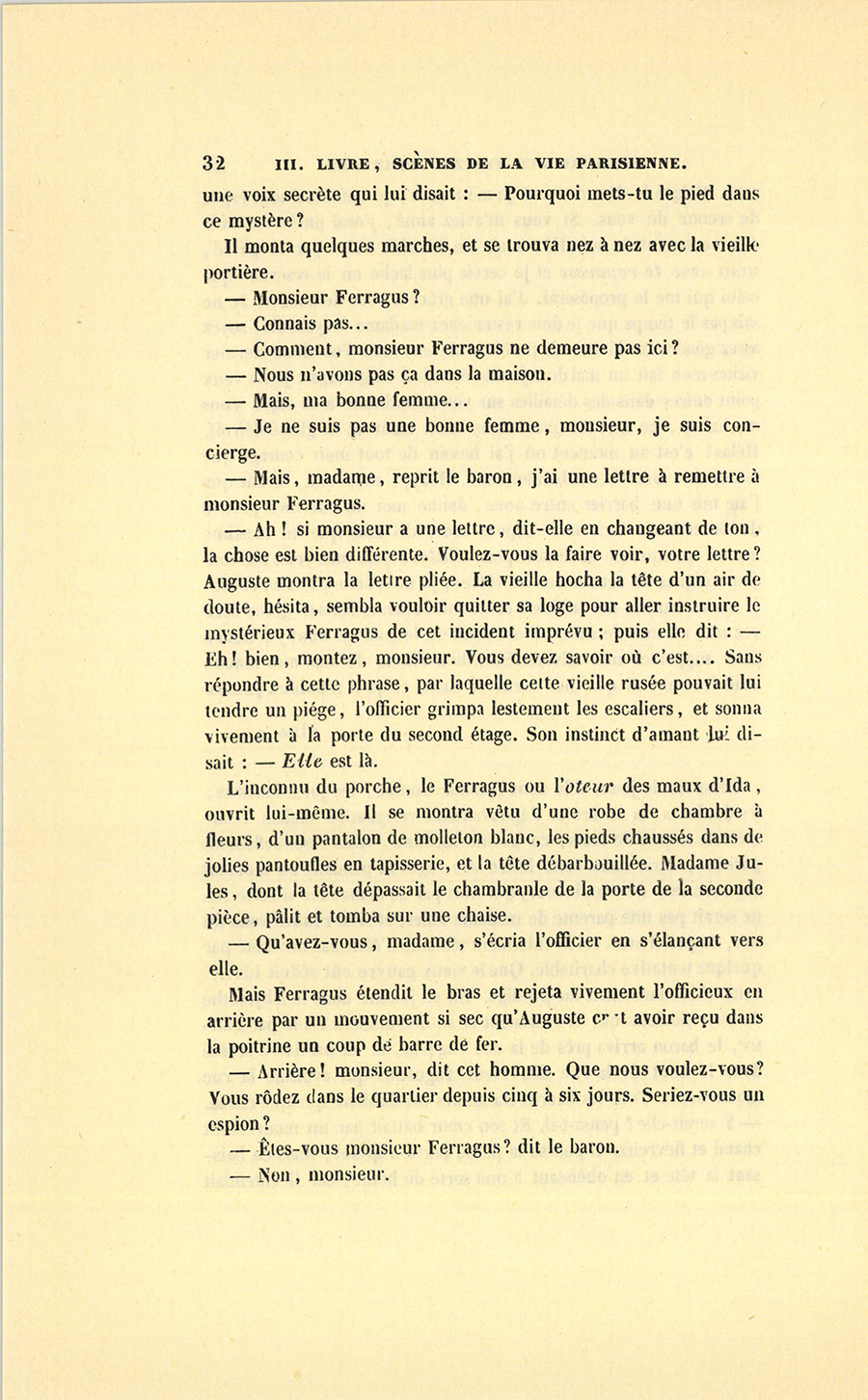 – Ah ! si monsieur a une lettre, dit-elle en changeant de ton, la chose est bien différente. Voulez-vous la faire voir, votre lettre ? Auguste montra la lettre pliée. La vieille hocha la tête d’un air de doute, hésita, sembla vouloir quitter sa loge pour aller instruire le mystérieux Ferragus de cet incident imprévu ; puis elle dit : – Eh ! bien, montez, monsieur. Vous devez savoir où c’est… Sans répondre à cette phrase, par laquelle cette vieille rusée pouvait lui tendre un piége, l’officier grimpa lestement les escaliers, et sonna vivement à la porte du second étage. Son instinct d’amant lui disait : – Elle est là.