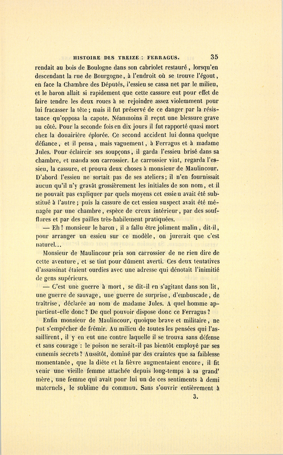 En ce temps-là, Paris avait la fièvre des constructions. Si Paris est un monstre, il est assurément le plus maniaque des monstres. Il s’éprend de mille fantaisies : tantôt il bâtit comme un grand seigneur qui aime la truelle ; puis, il laisse sa truelle, et devient militaire ; il s’habille de la tête aux pieds en garde national, fait l’exercice et fume ; tout à coup, il abandonne les répétitions militaires et jette son cigare ; puis il se désole, fait faillite, vend ses meubles sur la place du Châtelet, dépose son bilan ; mais quelques {p. 34} jours après, il arrange ses affaires, se met en fête et danse. Un jour il mange du sucre d’orge à pleines mains, à pleines lèvres ; hier il achetait du papier Weynen ; aujourd’hui le monstre a mal aux dents et s’applique un alexipharmaque sur toutes ses murailles ; demain il fera ses provisions de pâte pectorale. Il a ses manies pour le mois, pour la saison, pour l’année, comme ses manies d’un jour. En ce moment donc, tout le monde bâtissait et démolissait quelque chose, on ne sait quoi encore. Il y avait très-peu de rues qui ne vissent l’échafaudage à longues perches, garni de planches mises sur des traverses et fixées d’étages en étages dans des boulins ; construction frêle, ébranlée par les Limousins, mais assujettie par des cordages, toute blanche de plâtre, rarement garantie des atteintes d’une voiture par ce mur de planches, enceinte obligée des monuments qu’on ne bâtit pas. Il y a quelque chose de maritime dans ces mâts, dans ces échelles, dans ces cordages, dans les cris des maçons. Or, à douze pas de l’hôtel Maulincour, un de ces bâtiments éphémères était élevé devant une maison que l’on construisait en pierres de taille. Le lendemain, au moment où le baron de Maulincour passait en cabriolet devant cet échafaud, en allant chez madame Jules, une pierre de deux pieds carrés, arrivée au sommet des perches, s’échappa de ses liens de corde en tournant sur elle-même, et tomba sur le domestique, qu’elle écrasa derrière le cabriolet. Un cri d’épouvante fit trembler l’échafaudage et les maçons ; l’un d’eux, en danger de mort, se tenait avec peine aux longues perches et paraissait avoir été touché par la pierre. La foule s’amassa promptement. Tous les maçons descendirent, criant, jurant et disant que le cabriolet de monsieur de Maulincour avait causé un ébranlement à leur grue. Deux pouces de plus, et l’officier avait la tête coiffée par la pierre. Le valet était mort, la voiture était brisée. Ce fut un événement pour le quartier, les journaux le rapportèrent. Monsieur de Maulincour, sûr de n’avoir rien touché, se plaignit. La justice intervint. Enquête faite, il fut prouvé qu’un petit garçon, armé d’une latte, montait la garde et criait aux passants de s’éloigner. L’affaire en resta là. Monsieur de Maulincour en fut pour son domestique, pour sa terreur, et resta dans son lit pendant quelques jours ; car l’arrière-train du cabriolet en se brisant lui avait fait des contusions ; puis, la secousse nerveuse causée par la surprise lui donna la fièvre. Il n’alla pas chez madame Jules. Dix jours après cet événement, et à sa première sortie, il se {p. 35} rendait au bois de Boulogne dans son cabriolet restauré, lorsqu’en descendant la rue de Bourgogne, à l’endroit où se trouve l’égout, en face la Chambre des Députés, l’essieu se cassa net par le milieu, et le baron allait si rapidement que cette cassure eut pour effet de faire tendre les deux roues à se rejoindre assez violemment pour lui fracasser la tête ; mais il fut préservé de ce danger par la résistance qu’opposa la capote. Néanmoins il reçut une blessure grave au côté. Pour la seconde fois en dix jours il fut rapporté quasi mort chez la douairière éplorée. Ce second accident lui donna quelque défiance, et il pensa, mais vaguement, à Ferragus et à madame Jules. Pour éclaircir ses soupçons, il garda l’essieu brisé dans sa chambre, et manda son carrossier. Le carrossier vint, regarda l’essieu, la cassure, et prouva deux choses à monsieur de Maulincour. D’abord l’essieu ne sortait pas de ses ateliers ; il n’en fournissait aucun qu’il n’y gravât grossièrement les initiales de son nom, et il ne pouvait pas expliquer par quels moyens cet essieu avait été substitué à l’autre ; puis la cassure de cet essieu suspect avait été ménagée par une chambre, espèce de creux intérieur, par des soufflures et par des pailles très-habilement pratiquées.