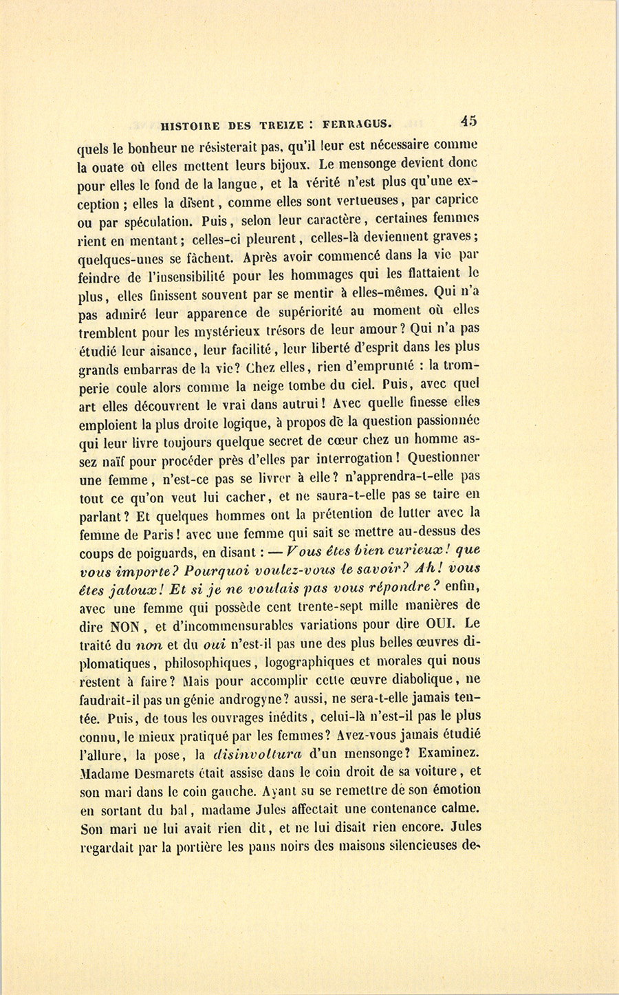 – Eh quoi ! se dit Auguste en forme de conclusion, les femmes sont donc telles que le vidame les voit ? Certes, toutes celles qui dansent ici sont moins irréprochables que ne le paraît madame Jules, et madame Jules va rue Soly. La rue Soly était sa maladie, le mot seul lui crispait le cœur.