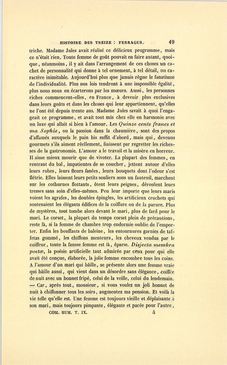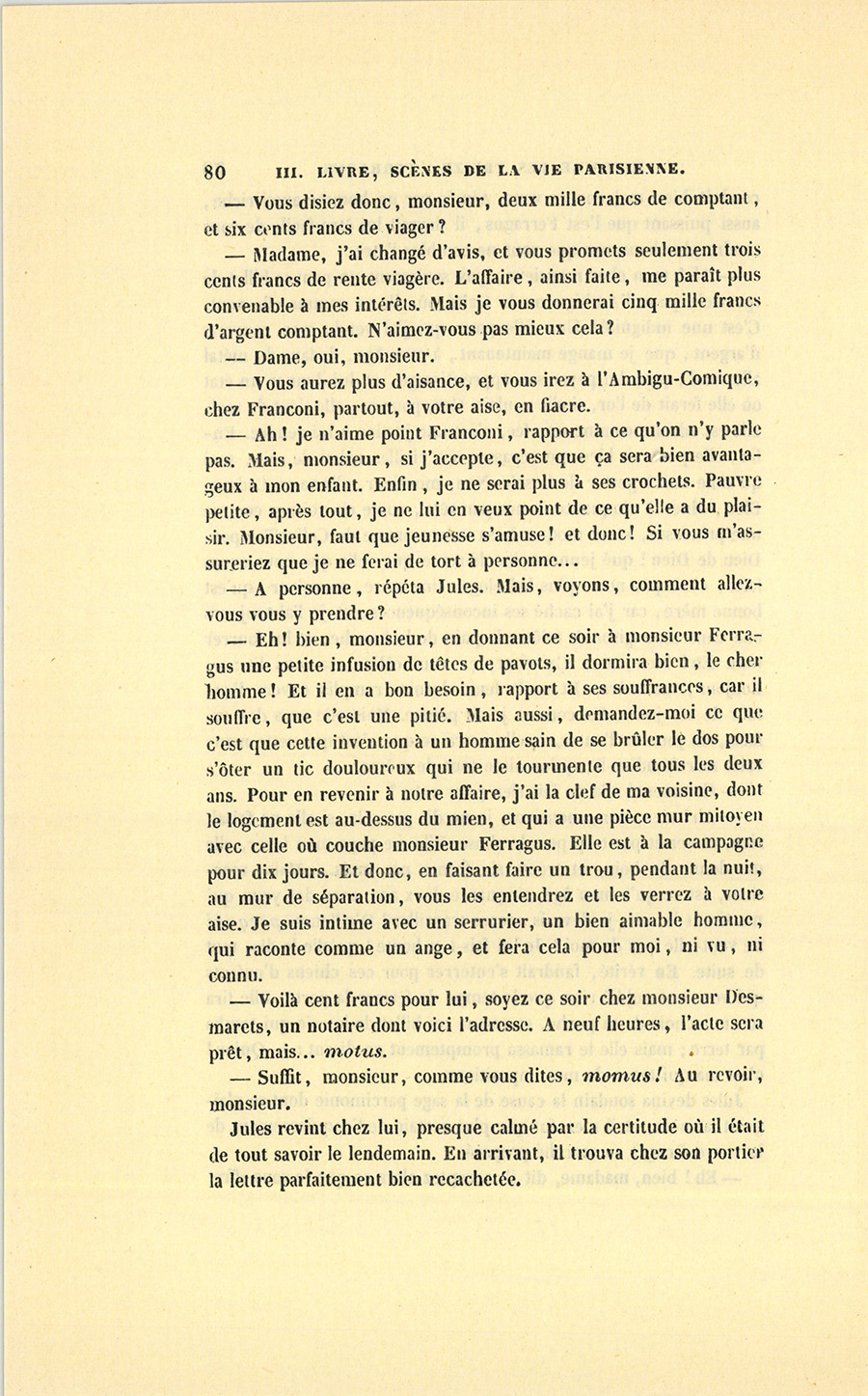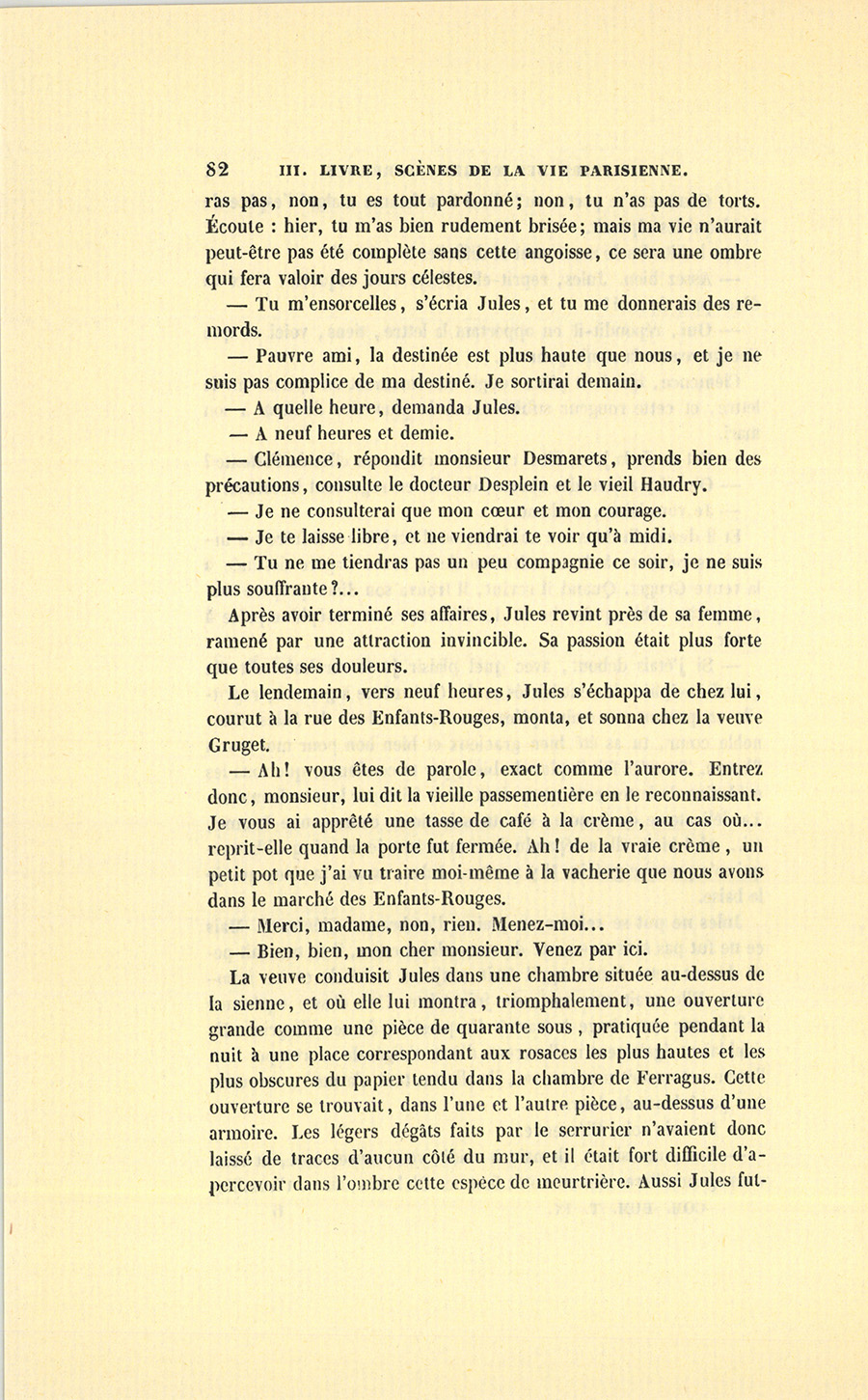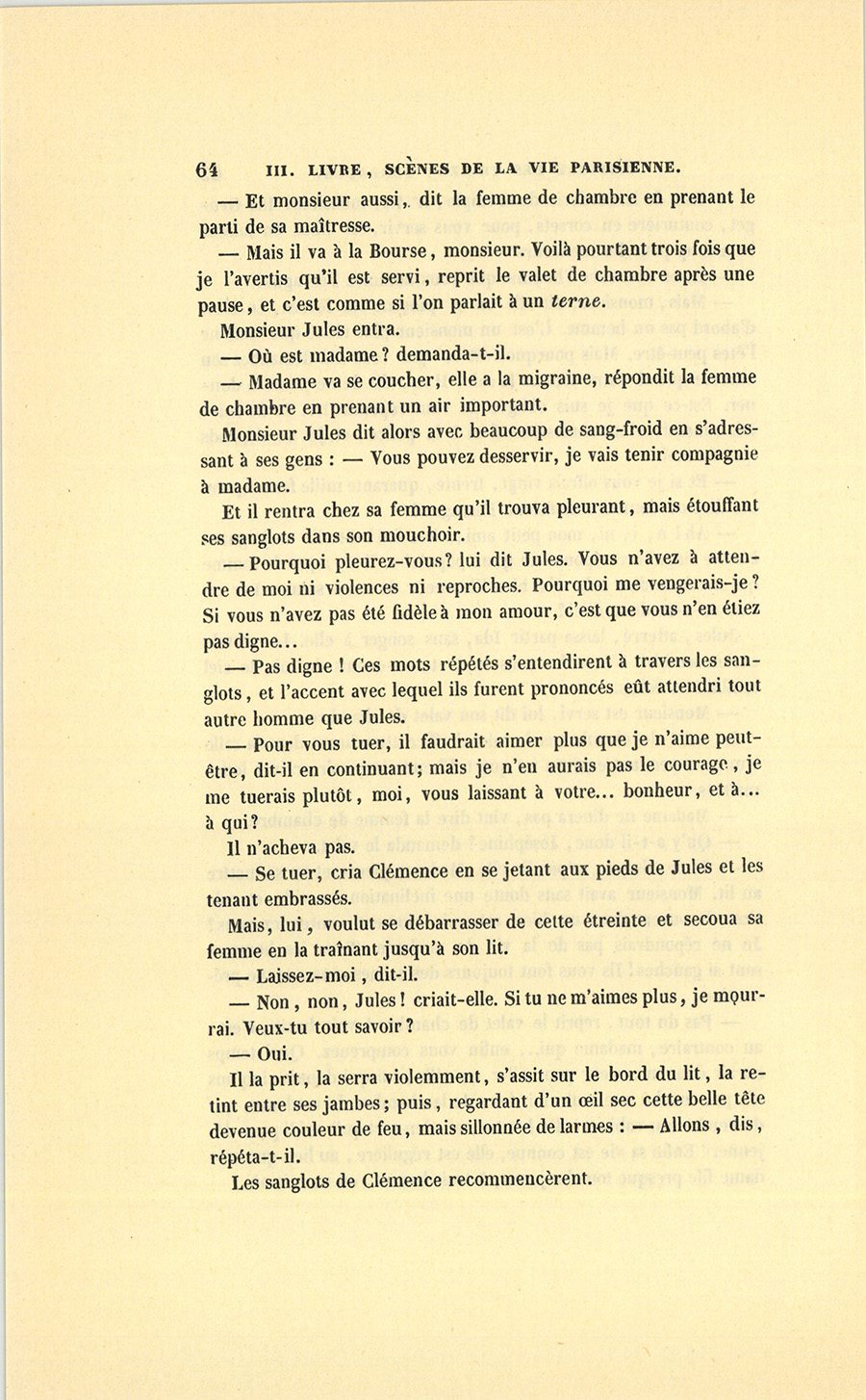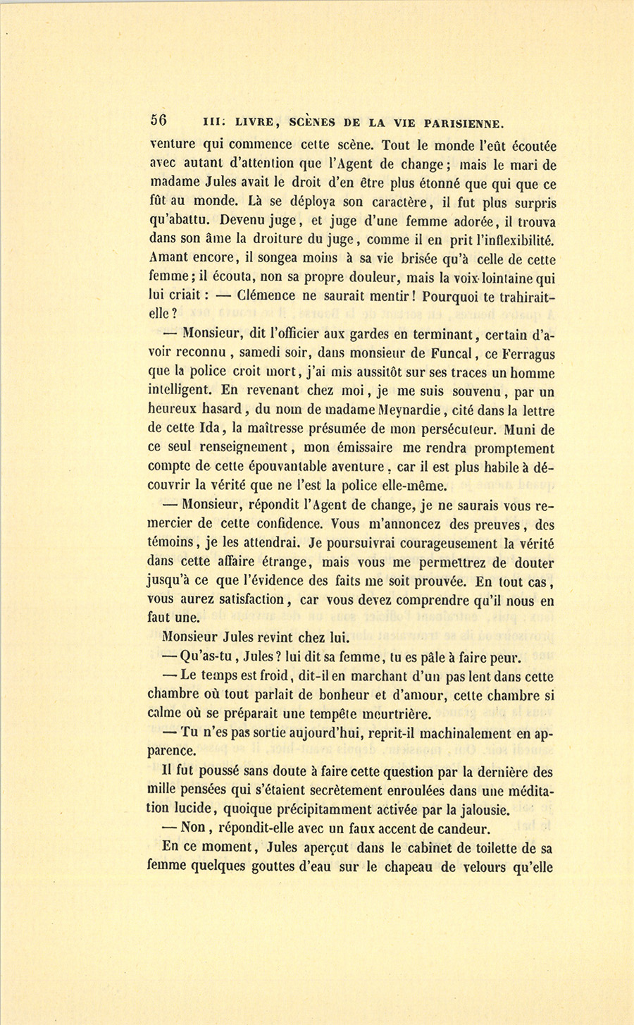 Beaucoup de jeunes gens se sont trouvés ainsi, rentrant chez eux, désespérés d’avoir rompu pour toujours avec une femme adorée en secret ; condamnée, méprisée en secret. C’est des monologues inconnus, dits aux murs d’un réduit solitaire, des orages nés et calmés sans être sortis du fond des cœurs, d’admirables scènes du {p. 18} monde moral, auxquelles il faudrait un peintre. Madame Jules alla s’asseoir, en quittant son mari qui fit le tour du salon. Quand elle fut assise, elle se trouva comme gênée, et, tout en causant avec sa voisine, elle jetait furtivement un regard sur monsieur Jules Desmarets, son mari, l’Agent de change du baron de Nucingen. Voici l’histoire de ce ménage.