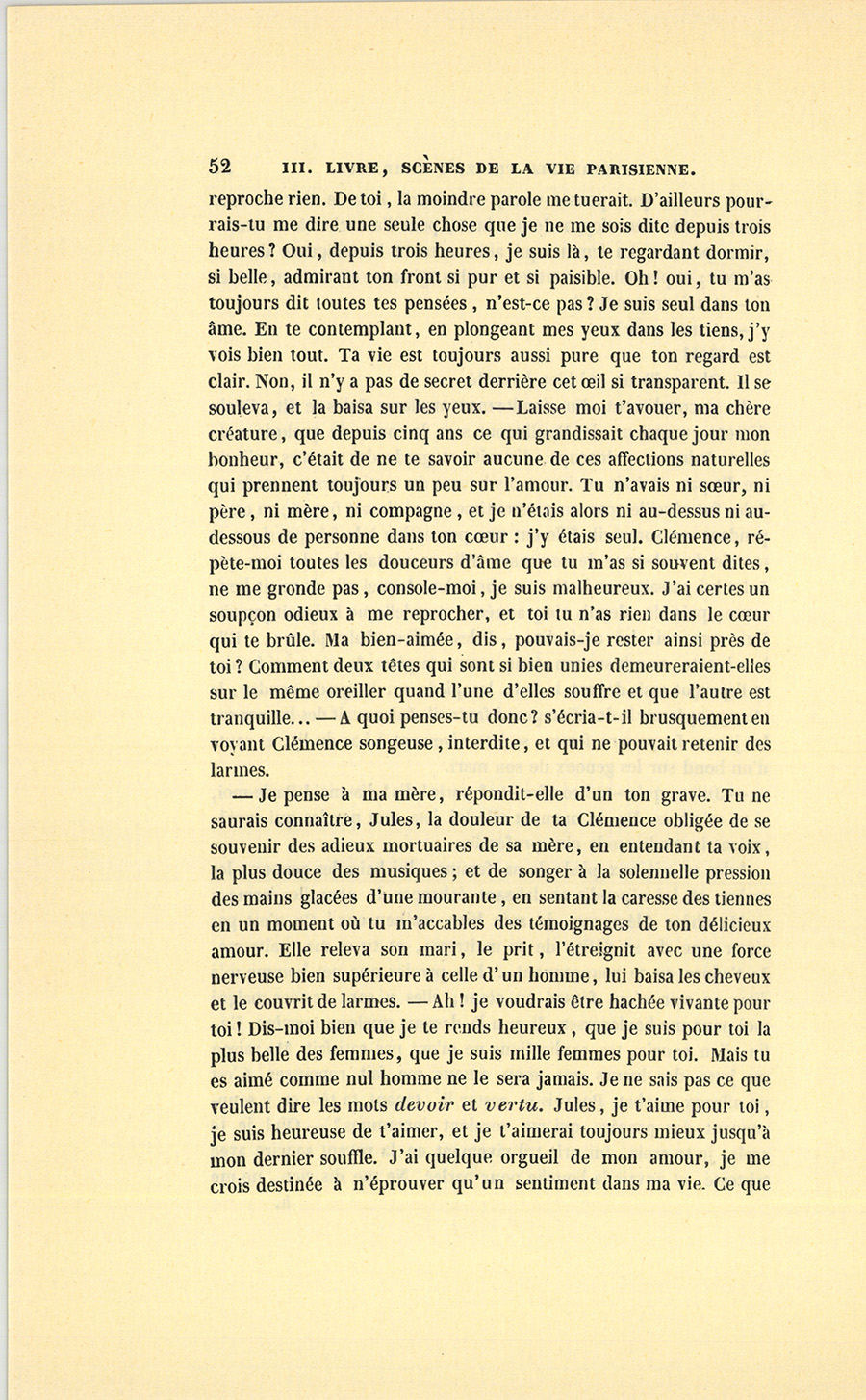 Mon bien aimé, ceci est mon testament. Pourquoi ne ferait-on pas des testaments pour les trésors du cœur, comme pour les autres biens ? Mon amour, n’était-ce pas tout mon bien ? je veux ici ne m’occuper que de mon amour : il fut toute la fortune de ta Clémence, et tout ce qu’elle peut te laisser en mourant. Jules, je suis encore aimée, je meurs heureuse. Les médecins expliquent ma mort à leur manière, moi seule en connais la véritable cause. Je te la dirai, quelque peine qu’elle puisse te faire. Je ne voudrais pas emporter dans un cœur tout à toi quelque secret qui ne te fût pas dit, alors que je meurs victime d’une discrétion nécessaire.