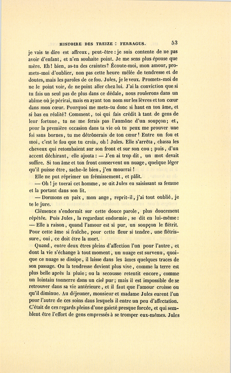 Il y eut un moment où, croyant sa femme endormie, Jules la baisa doucement au front, et dit après l’avoir long-temps contemplée : – Mon Dieu, laisse-moi cet ange encore assez de temps pour que je m’absolve moi-même de mes torts par une longue adoration… Fille, elle est sublime ; femme, quel mot pourrait la qualifier ?