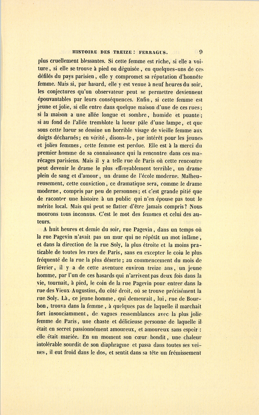 À huit heures et demie du soir, rue Pagevin, dans un temps où la rue Pagevin n’avait pas un mur qui ne répétât un mot infâme, et dans la direction de la rue Soly, la plus étroite et la moins praticable de toutes les rues de Paris, sans en excepter le coin le plus fréquenté de la rue la plus déserte ; au commencement du mois de février, il y a de cette aventure environ treize ans, un jeune homme, par l’un de ces hasards qui n’arrivent pas deux fois dans la vie, tournait, à pied, le coin de la rue Pagevin pour entrer dans la rue des Vieux-Augustins, du côté droit, où se trouve précisément la rue Soly. Là, ce jeune homme, qui demeurait, lui, rue de Bourbon, trouva dans la femme, à quelques pas de laquelle il marchait fort insouciamment, de vagues ressemblances avec la plus jolie femme de Paris, une chaste et délicieuse personne de laquelle il était en secret passionnément amoureux, et amoureux sans espoir : elle était mariée. En un moment son cœur bondit, une chaleur intolérable sourdit de son diaphragme et passa dans toutes ses veines, il eut froid dans le dos, et sentit dans sa tête un frémissement {p. 10} superficiel. Il aimait, il était jeune, il connaissait Paris ; et sa perspicacité ne lui permettait pas d’ignorer tout ce qu’il y avait d’infamie possible pour une femme élégante, riche, jeune et jolie, à se promener là, d’un pied criminellement furtif. Elle, dans cette crotte, à cette heure ! L’amour que ce jeune homme avait pour cette femme pourra sembler bien romanesque, et d’autant plus même qu’il était officier dans la garde royale. S’il eût été dans l’infanterie, la chose serait encore vraisemblable ; mais officier supérieur de cavalerie, il appartenait à l’arme française qui veut le plus de rapidité dans ses conquêtes, qui tire vanité de ses mœurs amoureuses autant que de son costume. Cependant la passion de cet officier était vraie, et à beaucoup de jeunes cœurs elle paraîtra grande. Il aimait cette femme parce qu’elle était vertueuse, il en aimait la vertu, la grâce décente, l’imposante sainteté, comme les plus chers trésors de sa passion inconnue. Cette femme était vraiment digne d’inspirer un de ces amours platoniques qui se rencontrent comme des fleurs au milieu de ruines sanglantes dans l’histoire du Moyen Âge ; digne d’être secrètement le principe de toutes les actions d’un homme jeune ; amour aussi haut, aussi pur que le ciel quand il est bleu ; amour sans espoir et auquel on s’attache, parce qu’il ne trompe jamais ; amour prodigue de jouissances effrénées, surtout à un âge où le cœur est brûlant, l’imagination mordante, et où les yeux d’un homme voient bien clair. Il se rencontre dans Paris des effets de nuit singuliers, bizarres, inconcevables. Ceux-là seulement qui se sont amusés à les observer savent combien la femme y devient fantastique à la brune. Tantôt la créature que vous y suivez, par hasard ou à dessein, vous paraît svelte ; tantôt le bas, s’il est bien blanc, vous fait croire à des jambes fines et élégantes ; puis la taille, quoique enveloppée d’un châle, d’une pelisse, se révèle jeune et voluptueuse dans l’ombre ; enfin les clartés incertaines d’une boutique ou d’un réverbère donnent à l’inconnue un éclat fugitif, presque toujours trompeur qui réveille, allume l’imagination et la lance au delà du vrai. Les sens s’émeuvent alors, tout se colore et s’anime ; la femme prend un aspect tout nouveau ; son corps s’embellit ; par moments ce n’est plus une femme, c’est un démon, un feu follet qui vous entraîne par un ardent magnétisme jusqu’à une maison décente où la pauvre bourgeoise, ayant peur de votre pas menaçant ou de vos bottes retentissantes, vous ferme la porte cochère au nez sans vous regarder. La lueur {p. 11} vacillante que projetait le vitrage d’une boutique de cordonnier illumina soudain, précisément à la chute des reins, la taille de la femme qui se trouvait devant le jeune homme. Ah ! certes, elle seule était ainsi cambrée ! Elle seule avait le secret de cette chaste démarche qui met innocemment en relief les beautés des formes les plus attrayantes. C’était et son châle du matin et le chapeau de velours du matin. À son bas de soie gris, pas une mouche, à son soulier pas une éclaboussure. Le châle était bien collé sur le buste, il en dessinait vaguement les délicieux contours, et le jeune homme en avait vu les blanches épaules au bal ; il savait tout ce que ce châle couvrait de trésors. À la manière dont s’entortille une Parisienne dans son châle, à la manière dont elle lève le pied dans la rue, un homme d’esprit devine le secret de sa course mystérieuse. Il y a je ne sais quoi de frémissant, de léger dans la personne et dans la démarche : la femme semble peser moins, elle va, elle va, ou mieux elle file comme une étoile, et vole emportée par une pensée que trahissent les plis et les jeux de sa robe. Le jeune homme hâta le pas, devança la femme, se retourna pour la voir… Pst ! elle avait disparu dans une allée dont la porte à claire-voie et à grelot claquait et sonnait. Le jeune homme revint, et vit cette femme montant au fond de l’allée, non sans recevoir l’obséquieux salut d’une vieille portière, un tortueux escalier dont les premières marches étaient fortement éclairées ; et madame montait lestement, vivement, comme doit monter une femme impatiente.