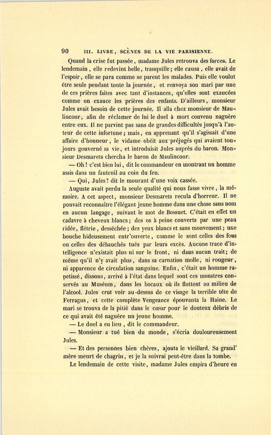 {p. 90} Quand la crise fut passée, madame Jules retrouva des forces. Le lendemain, elle redevint belle, tranquille ; elle causa, elle avait de l’espoir, elle se para comme se parent les malades. Puis elle voulut être seule pendant toute la journée, et renvoya son mari par une de ces prières faites avec tant d’instances, qu’elles sont exaucées comme on exauce les prières des enfants. D’ailleurs, monsieur Jules avait besoin de cette journée. Il alla chez monsieur de Maulincour, afin de réclamer de lui le duel à mort convenu naguère entre eux. Il ne parvint pas sans de grandes difficultés jusqu’à l’auteur de cette infortune ; mais, en apprenant qu’il s’agissait d’une affaire d’honneur, le vidame obéit aux préjugés qui avaient toujours gouverné sa vie, et introduisit Jules auprès du baron. Monsieur Desmarets chercha le baron de Maulincour.