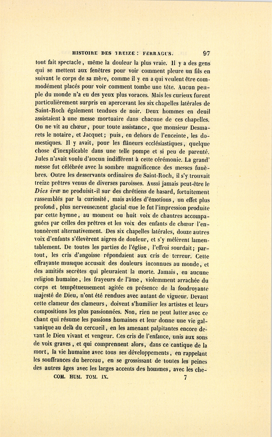 Pendant cette matinée, madame Jules, après avoir été exposée dans une chapelle ardente, à la porte de son hôtel, fut amenée à Saint-Roch. L’église était entièrement tendue de noir. L’espèce de luxe déployé pour ce service avait attiré du monde ; car, à Paris, {p. 97} tout fait spectacle, même la douleur la plus vraie. Il y a des gens qui se mettent aux fenêtres pour voir comment pleure un fils en suivant le corps de sa mère, comme il y en a qui veulent être commodément placés pour voir comment tombe une tête. Aucun peuple du monde n’a eu des yeux plus voraces. Mais les curieux furent particulièrement surpris en apercevant les six chapelles latérales de Saint-Roch également tendues de noir. Deux hommes en deuil assistaient à une messe mortuaire dans chacune de ces chapelles. On ne vit au chœur, pour toute assistance, que monsieur Desmarets le notaire, et Jacquet ; puis, en dehors de l’enceinte, les domestiques. Il y avait, pour les flâneurs ecclésiastiques, quelque chose d’inexplicable dans une telle pompe et si peu de parenté. Jules n’avait voulu d’aucun indifférent à cette cérémonie. La grand’messe fut célébrée avec la sombre magnificence des messes funèbres. Outre les desservants ordinaires de Saint-Roch, il s’y trouvait treize prêtres venus de diverses paroisses. Aussi jamais peut-être le Dies iræ ne produisit-il sur des chrétiens de hasard, fortuitement rassemblés par la curiosité, mais avides d’émotions, un effet plus profond, plus nerveusement glacial que le fut l’impression produite par cette hymne, au moment où3 huit voix de chantres accompagnées par celles des prêtres et les voix des enfants de chœur l’entonnèrent alternativement. Des six chapelles latérales, douze autres voix d’enfants s’élevèrent aigres de douleur, et s’y mêlèrent lamentablement. De toutes les parties de l’église, l’effroi sourdait ; partout, les cris d’angoisse répondaient aux cris de terreur. Cette effrayante musique accusait des douleurs inconnues au monde, et des amitiés secrètes qui pleuraient la morte. Jamais, en aucune religion humaine, les frayeurs de l’âme, violemment arrachée du corps et tempêtueusement agitée en présence de la foudroyante majesté de Dieu, n’ont été rendues avec autant de vigueur. Devant cette clameur des clameurs, doivent s’humilier les artistes et leurs compositions les plus passionnées. Non, rien ne peut lutter avec ce chant qui résume les passions humaines et leur donne une vie galvanique au delà du cercueil, en les amenant palpitantes encore devant le Dieu vivant et vengeur. Ces cris de l’enfance, unis aux sons de voix graves, et qui comprennent alors, dans ce cantique de la mort, la vie humaine avec tous ses développements, en rappelant les souffrances du berceau, en se grossissant de toutes les peines des autres âges avec les larges accents des hommes, avec les {p. 98} chevrotements des vieillards et des prêtres ; toute cette stridente harmonie pleine de foudres et d’éclairs ne parle-t-elle pas aux imaginations les plus intrépides, aux cœurs les plus glacés, et même aux philosophes ! En l’entendant, il semble que Dieu tonne. Les voûtes d’aucune église ne sont froides ; elles tremblent, elles parlent, elles versent la peur par toute la puissance de leurs échos. Vous croyez voir d’innombrables morts se levant et tendant les mains. Ce n’est plus ni un père, ni une femme, ni un enfant qui sont sous le drap noir, c’est l’humanité sortant de sa poudre. Il est impossible de juger la religion catholique, apostolique et romaine, tant que l’on n’a pas éprouvé la plus profonde des douleurs, en pleurant la personne adorée qui gît sous le cénotaphe ; tant que l’on n’a pas senti toutes les émotions qui vous emplissent alors le cœur, traduites par cette hymne du désespoir, par ces cris qui écrasent les âmes, par cet effroi religieux qui grandit de strophe en strophe, qui tournoie vers le ciel, et qui épouvante, qui rapetisse, qui élève l’âme et vous laisse un sentiment de l’éternité dans la conscience, au moment où le dernier vers s’achève. Vous avez été aux prises avec la grande idée de l’infini, et alors tout se tait dans l’Église. Il ne s’y dit pas une parole ; les incrédules eux-mêmes ne savent pas ce qu’ils ont. Le génie espagnol a pu seul inventer ces majestés inouïes pour la plus inouïe des douleurs. Quand la suprême cérémonie fut achevée, douze hommes en deuil sortirent des six chapelles, et vinrent écouter autour du cercueil le chant d’espérance que l’Église fait entendre à l’âme chrétienne avant d’aller en ensevelir la forme humaine. Puis chacun de ces hommes monta dans une voiture drapée ; Jacquet et monsieur Desmarets prirent la treizième ; les serviteurs suivirent à pied. Une heure après, les douze inconnus étaient au sommet du cimetière nommé populairement le Père-Lachaise, tous en cercle autour d’une fosse où le cercueil avait été descendu, devant une foule curieuse accourue de tous les points de ce jardin public. Puis après de courtes prières, le prêtre jeta quelques grains de terre sur la dépouille de cette femme ; et les fossoyeurs, ayant demandé leur pourboire, s’empressèrent de combler la fosse pour aller à une autre.