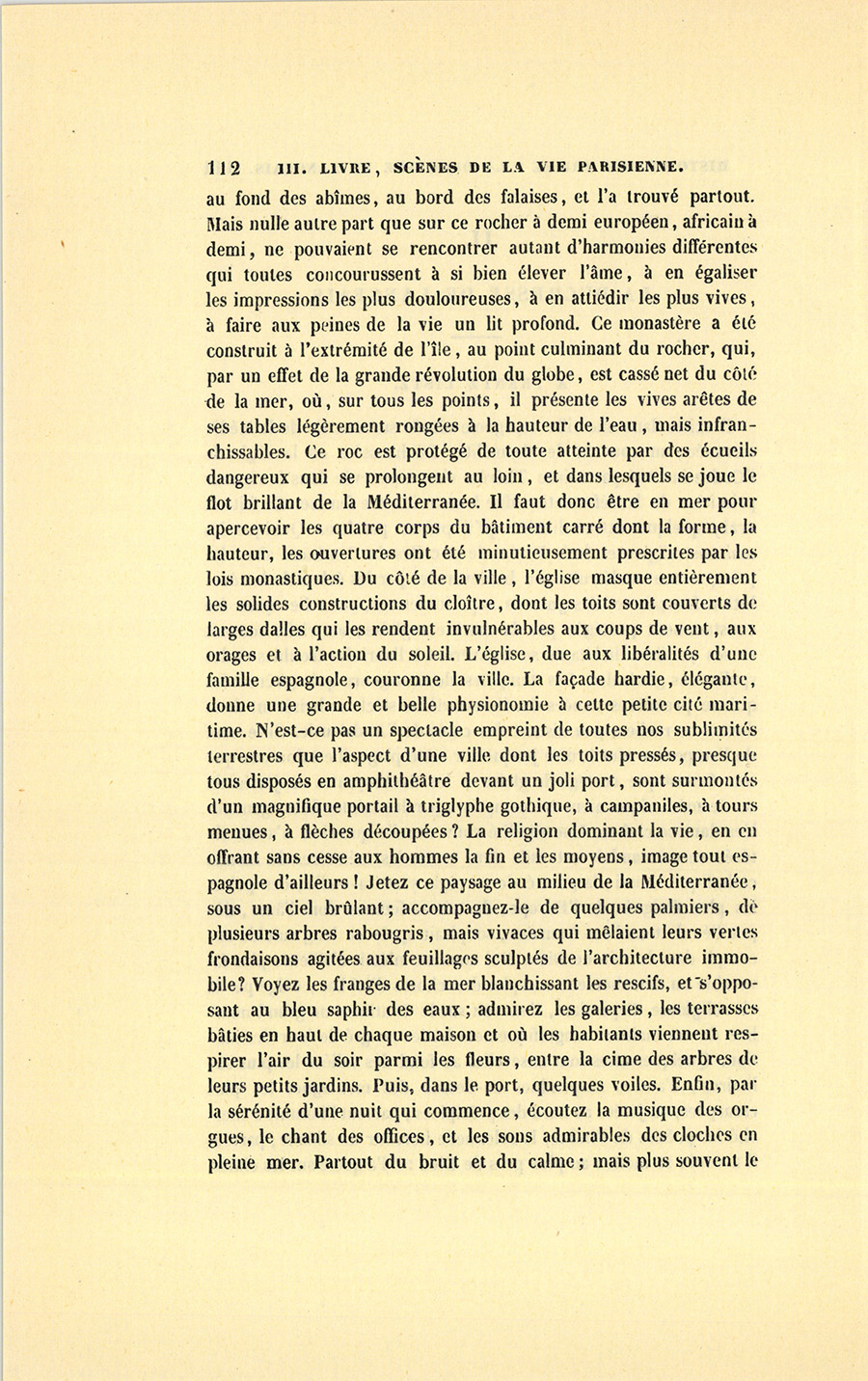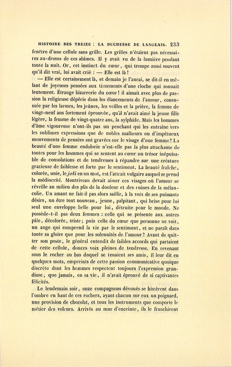 Montriveau resta, pendant deux nuits, enveloppé dans son manteau, couché sur le roc. Les chants du soir et ceux du matin lui causèrent d’inexprimables délices. Il alla jusqu’au mur, pour pouvoir entendre la musique des orgues, et s’efforça de distinguer une voix dans cette masse de voix. Mais, malgré le silence, l’espace ne laissait parvenir à ses oreilles que les effets confus de la musique. C’était de suaves harmonies où les défauts de l’exécution ne se faisaient plus sentir, et d’où la pure pensée de l’art se dégageait en se communiquant à l’âme, sans lui demander ni les efforts de l’attention ni les fatigues de l’entendement. Terribles souvenirs pour Armand, dont l’amour reflorissait tout entier dans cette brise de musique, où il voulut trouver d’aériennes promesses de bonheur. Le lendemain de la dernière nuit, il descendit avant le lever du soleil, après être resté durant plusieurs heures les yeux attachés sur la {p. 233} fenêtre d’une cellule sans grille. Les grilles n’étaient pas nécessaires au-dessus de ces abîmes. Il y avait vu de la lumière pendant toute la nuit. Or, cet instinct du cœur, qui trompe aussi souvent qu’il dit vrai, lui avait crié : – Elle est là !
