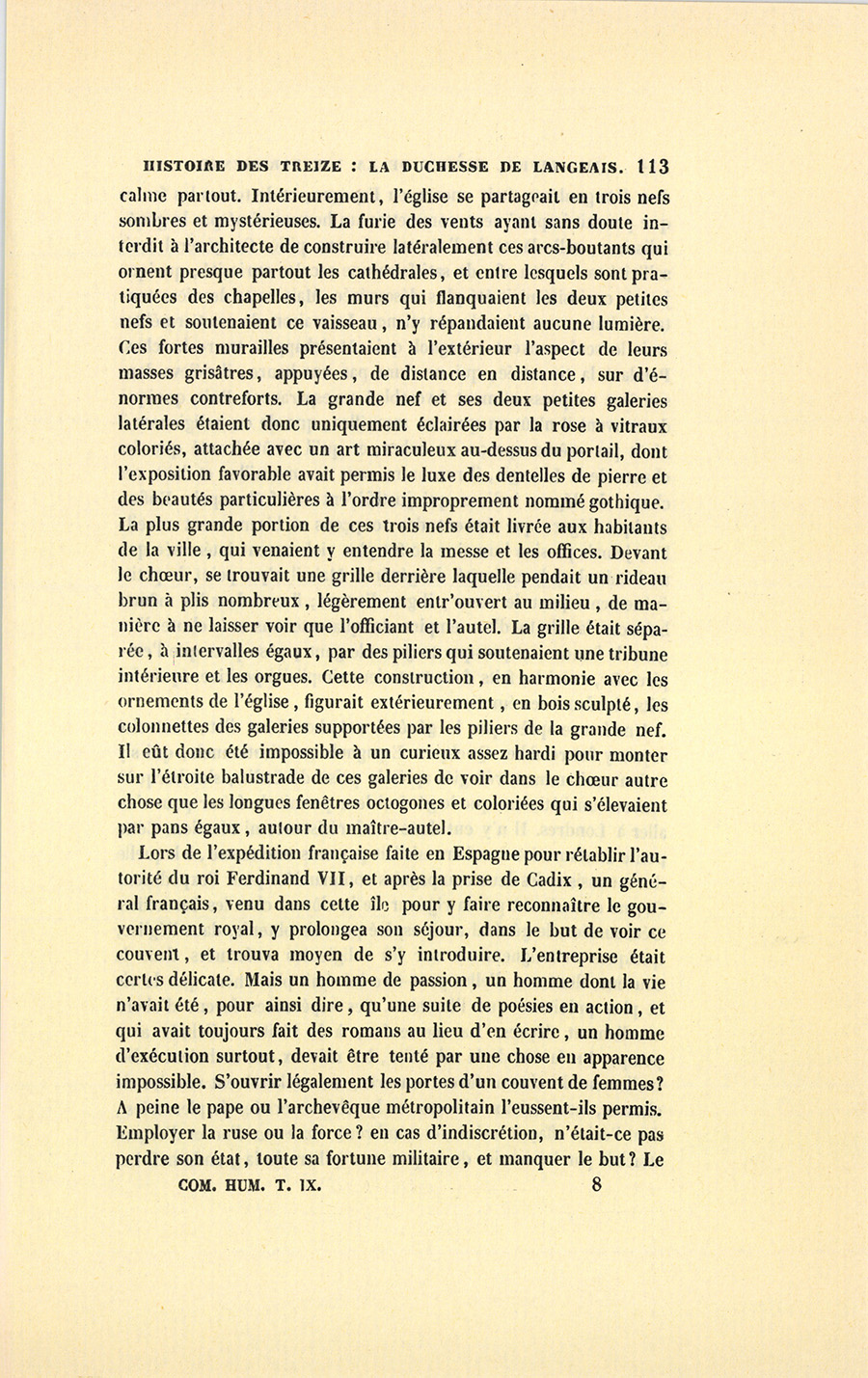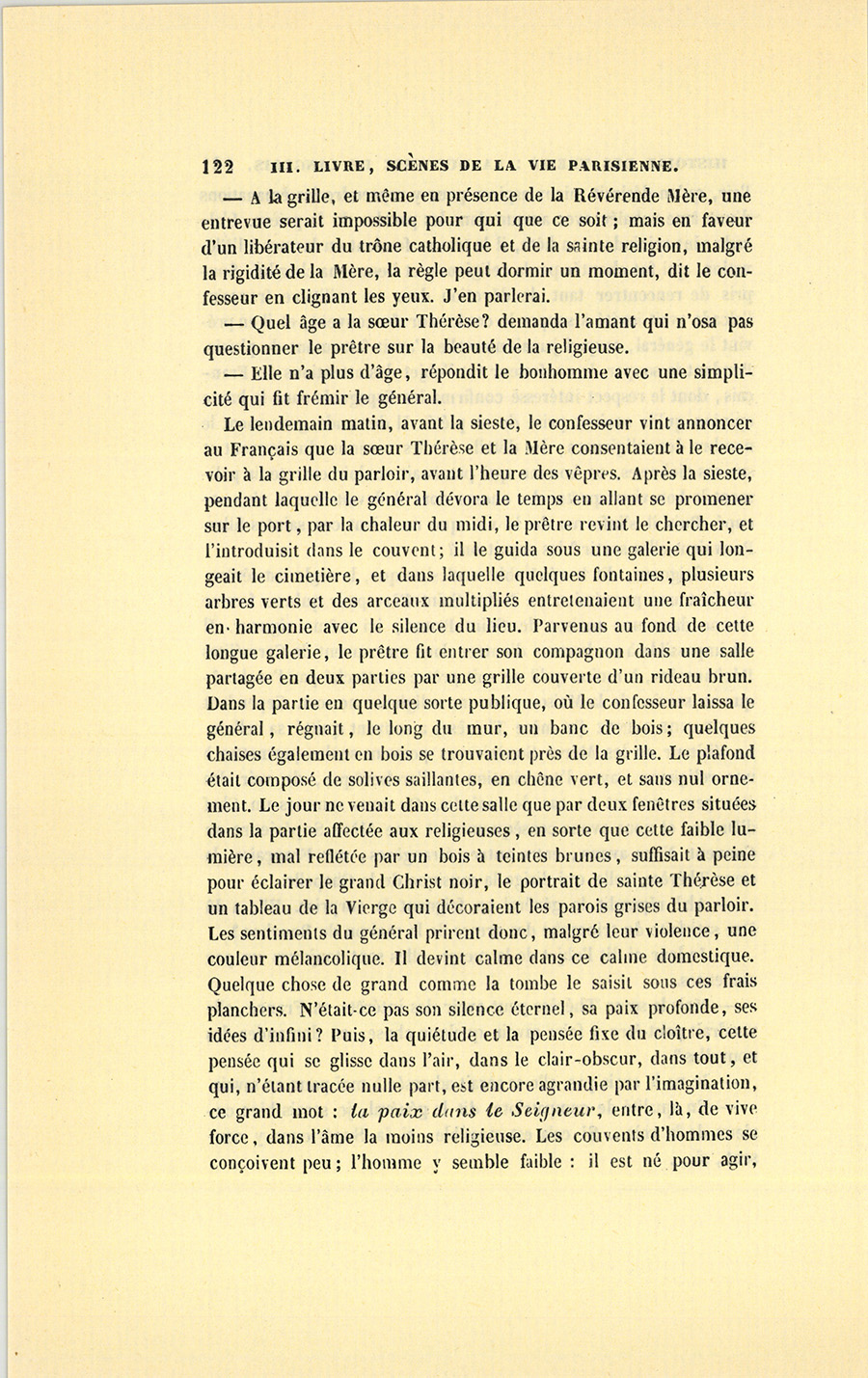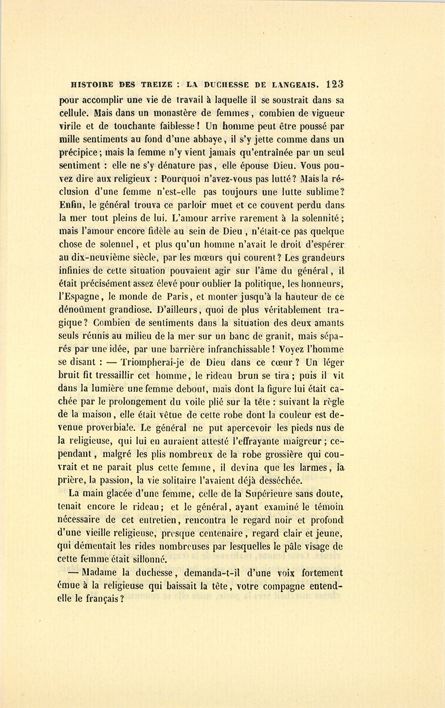 Lors de l’expédition française faite en Espagne pour rétablir l’autorité du roi Ferdinand VII, et après la prise de Cadix, un général français, venu dans cette île pour y faire reconnaître le gouvernement royal, y prolongea son séjour, dans le but de voir ce couvent, et trouva moyen de s’y introduire. L’entreprise était certes délicate. Mais un homme de passion, un homme dont la vie n’avait été, pour ainsi dire, qu’une suite de poésies en action, et qui avait toujours fait des romans au lieu d’en écrire, un homme d’exécution surtout, devait être tenté par une chose en apparence impossible. S’ouvrir légalement les portes d’un couvent de femmes ? À peine le pape ou l’archevêque métropolitain l’eussent-ils permis. Employer la ruse ou la force ? en cas d’indiscrétion, n’était-ce pas perdre son état, toute sa fortune militaire, et manquer le but ? Le {p. 114} duc d’Angoulême était encore en Espagne, et de toutes les fautes que pouvait impunément commettre un homme aimé par le généralissime, celle-là seule l’eût trouvé sans pitié. Ce général avait sollicité sa mission afin de satisfaire une secrète curiosité, quoique jamais curiosité n’ait été plus désespérée. Mais cette dernière tentative était une affaire de conscience. La maison de ces Carmélites était le seul couvent espagnol qui eût échappé à ses recherches. Pendant la traversée, qui ne dura pas une heure, il s’éleva dans son âme un pressentiment favorable à ses espérances. Puis, quoique du couvent il n’eût vu que les murailles, que de ces religieuses il n’eût pas même aperçu les robes, et qu’il n’eût écouté que les chants de la Liturgie, il rencontra sous ces murailles et dans ces chants de légers indices qui justifièrent son frêle espoir. Enfin, quelque légers que fussent des soupçons si bizarrement réveillés, jamais passion humaine ne fut plus violemment intéressée que ne l’était alors la curiosité du général. Mais il n’y a point de petits événements pour le cœur ; il grandit tout ; il met dans les mêmes balances la chute d’un empire de quatorze ans et la chute d’un gant de femme, et presque toujours le gant y pèse plus que l’empire. Or, voici les faits dans toute leur simplicité positive. Après les faits viendront les émotions.