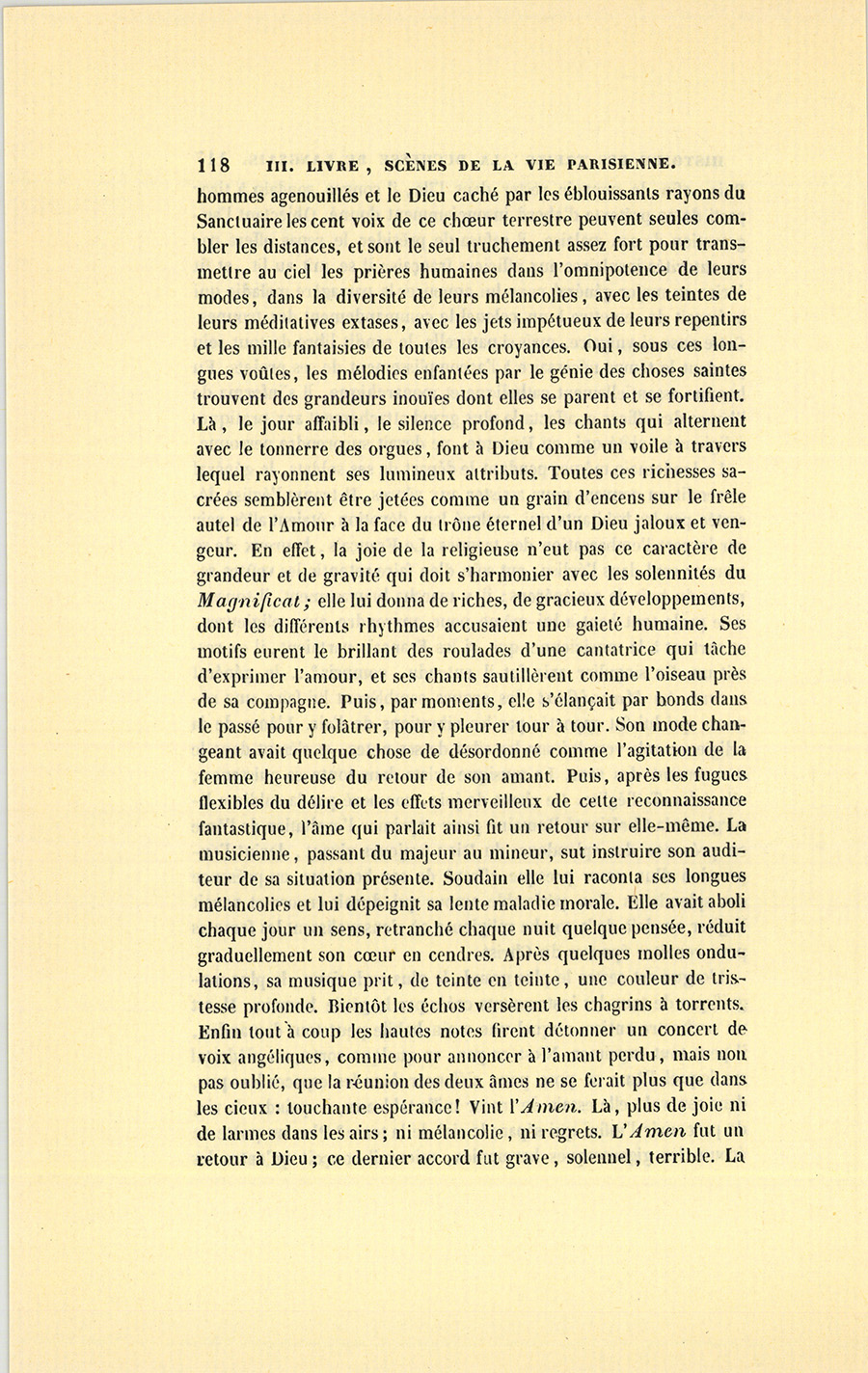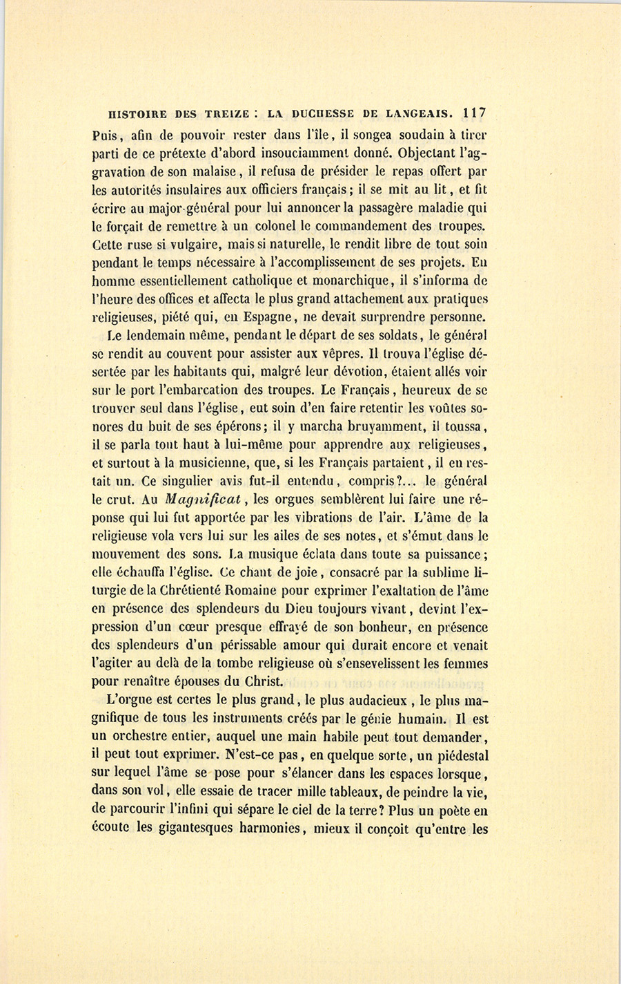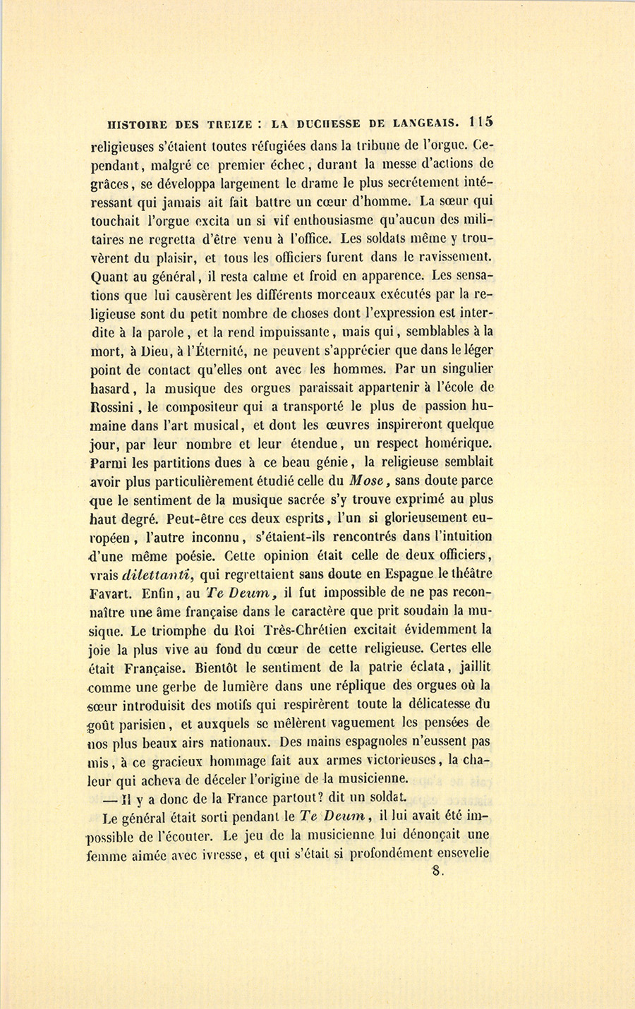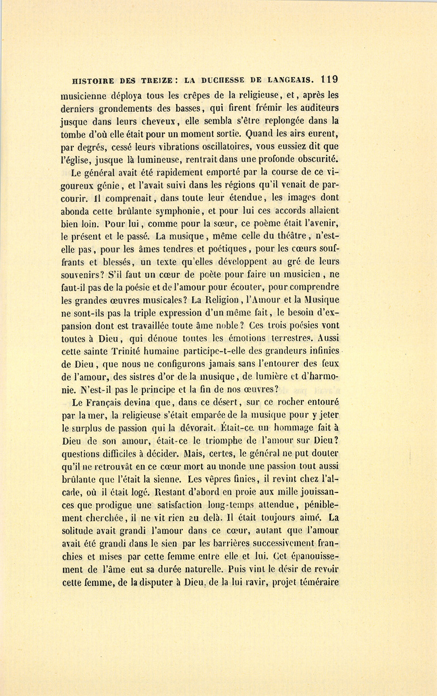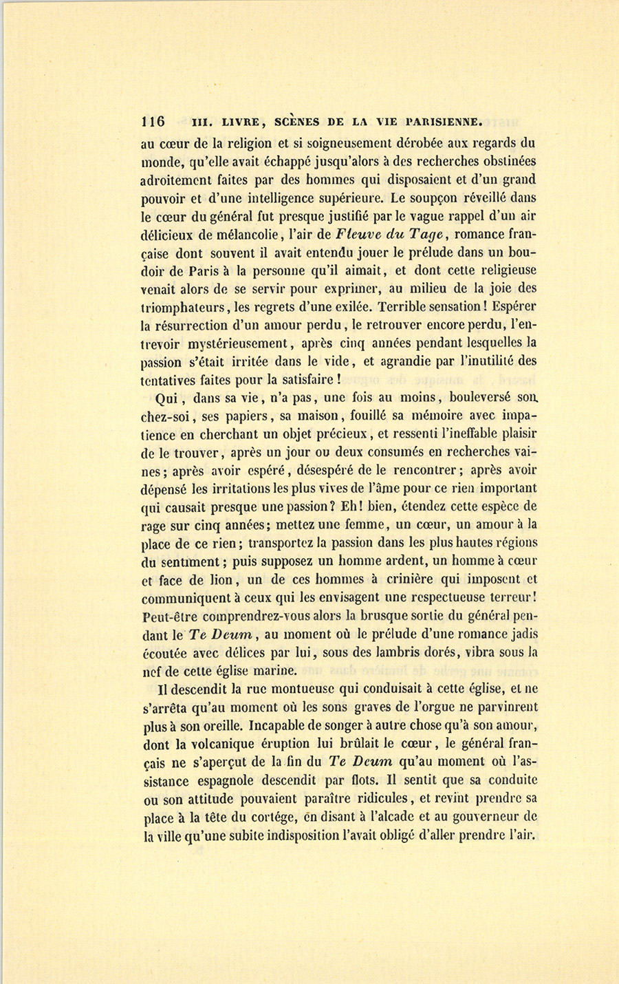 Le général était sorti pendant le Te Deum, il lui avait été impossible de l’écouter. Le jeu de la musicienne lui dénonçait une femme aimée avec ivresse, et qui s’était si profondément ensevelie {p. 116} au cœur de la religion et si soigneusement dérobée aux regards du monde, qu’elle avait échappé jusqu’alors à des recherches obstinées adroitement faites par des hommes qui disposaient et d’un grand pouvoir et d’une intelligence supérieure. Le soupçon réveillé dans le cœur du général fut presque justifié par le vague rappel d’un air délicieux de mélancolie, l’air de Fleuve du Tage, romance française dont souvent il avait entendu jouer le prélude dans un boudoir de Paris à la personne qu’il aimait, et dont cette religieuse venait alors de se servir pour exprimer, au milieu de la joie des triomphateurs, les regrets d’une exilée. Terrible sensation ! Espérer la résurrection d’un amour perdu, le retrouver encore perdu, l’entrevoir mystérieusement, après cinq années pendant lesquelles la passion s’était irritée dans le vide, et agrandie par l’inutilité des tentatives faites pour la satisfaire !