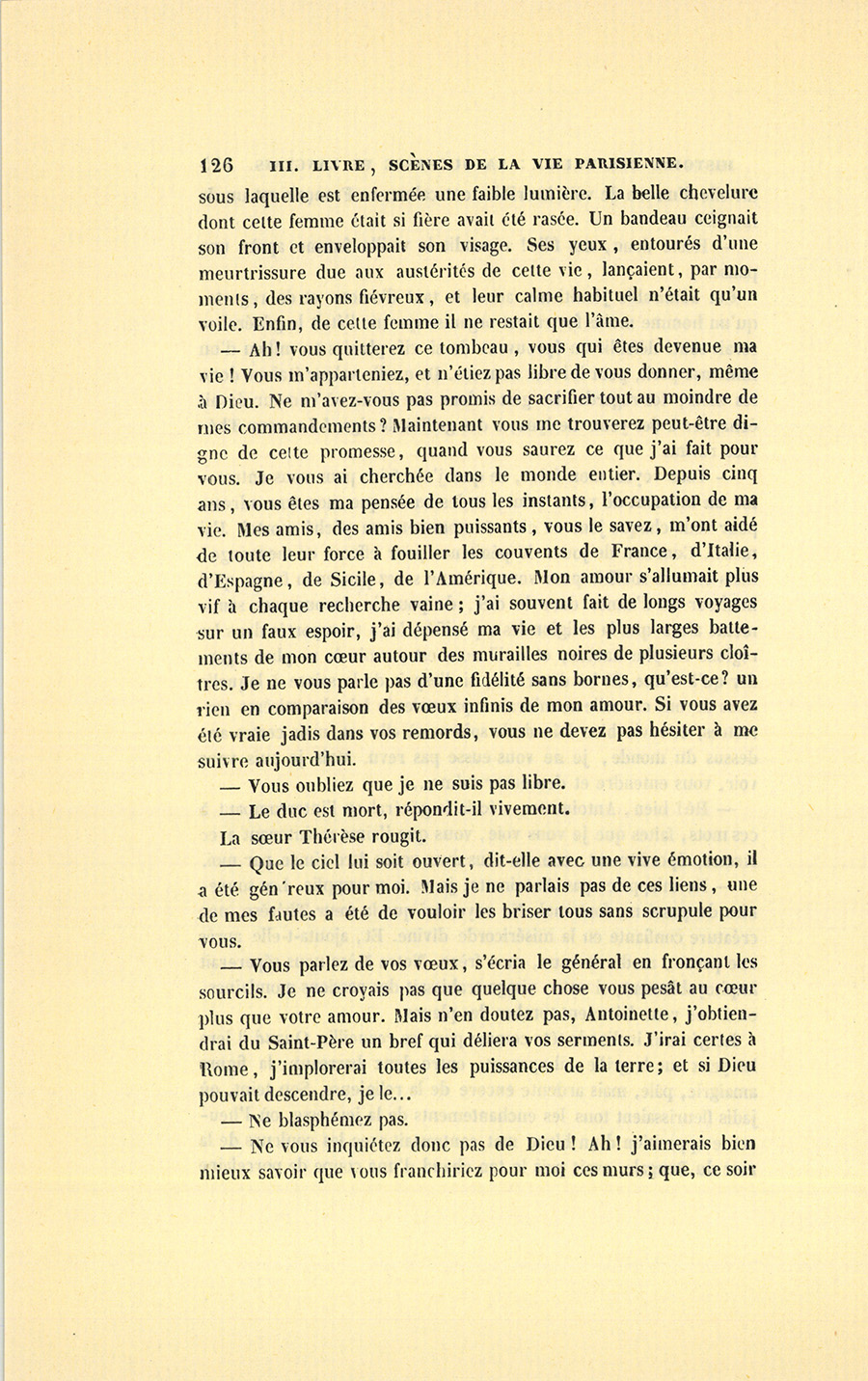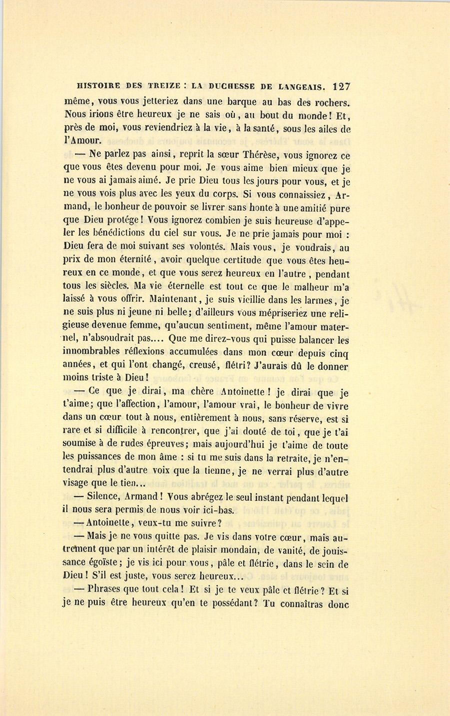 – Phrases que tout cela ! Et si je te veux pâle et flétrie ? Et si je ne puis être heureux qu’en te possédant ? Tu connaîtras donc {p. 128} toujours des devoirs en présence de ton amant ? Il n’est donc jamais au-dessus de tout dans ton cœur ? Naguère, tu lui préférais la société, toi, je ne sais quoi ; maintenant, c’est Dieu, c’est mon salut. Dans la sœur Thérèse, je reconnais toujours la duchesse ignorante des plaisirs de l’amour, et toujours insensible sous les apparences de la sensibilité. Tu ne m’aimes pas, tu n’as jamais aimé…