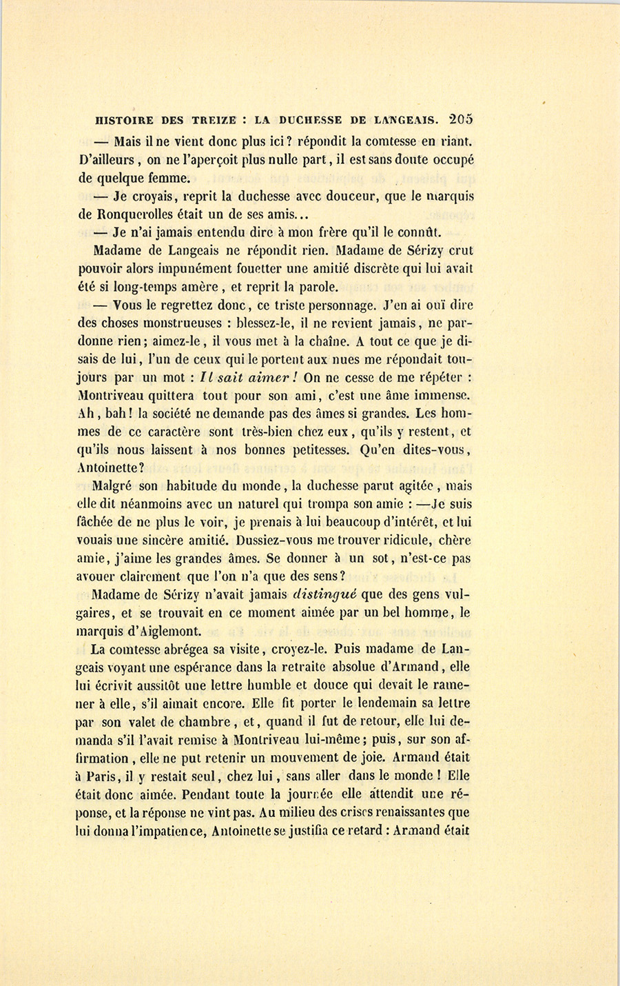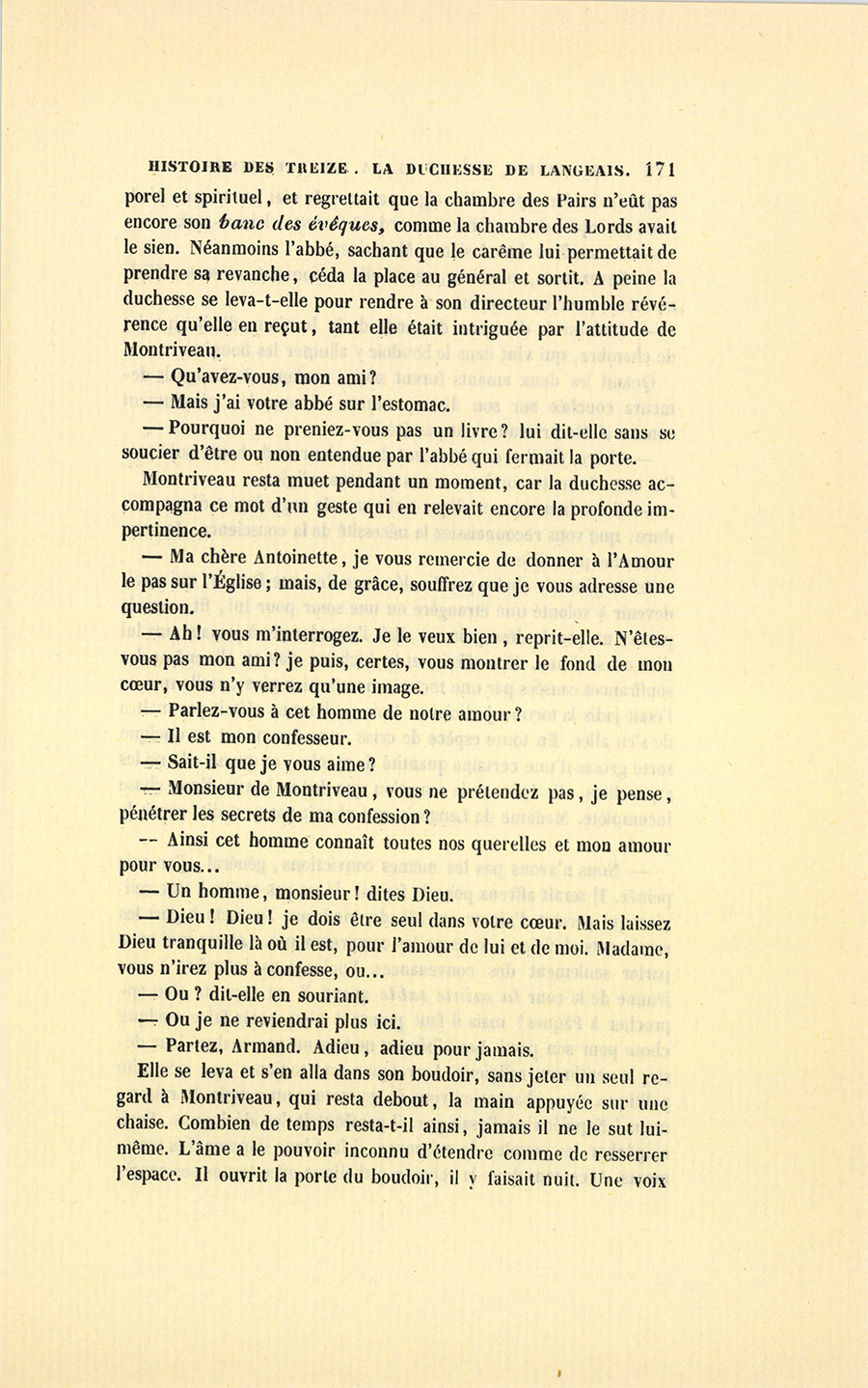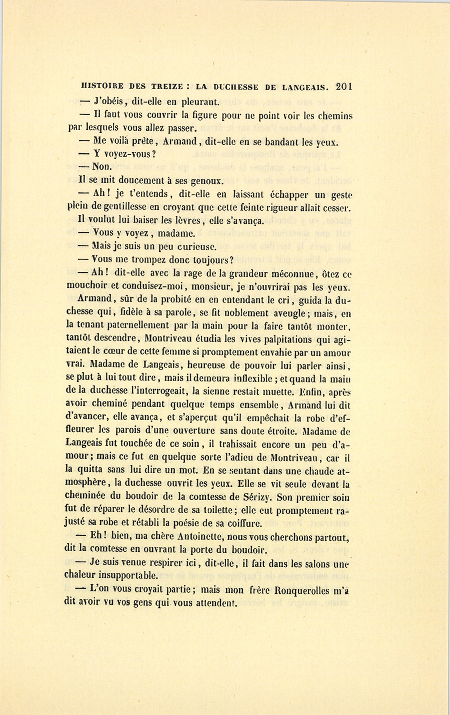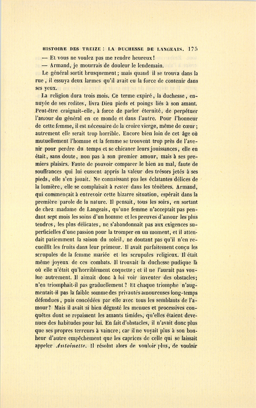 – Monsieur, vous seriez-vous prêté à quelque cruelle {p. 228} plaisanterie ? s’écria-t-il. Je viens de chez madame de Langeais, et ses gens la disent sortie.