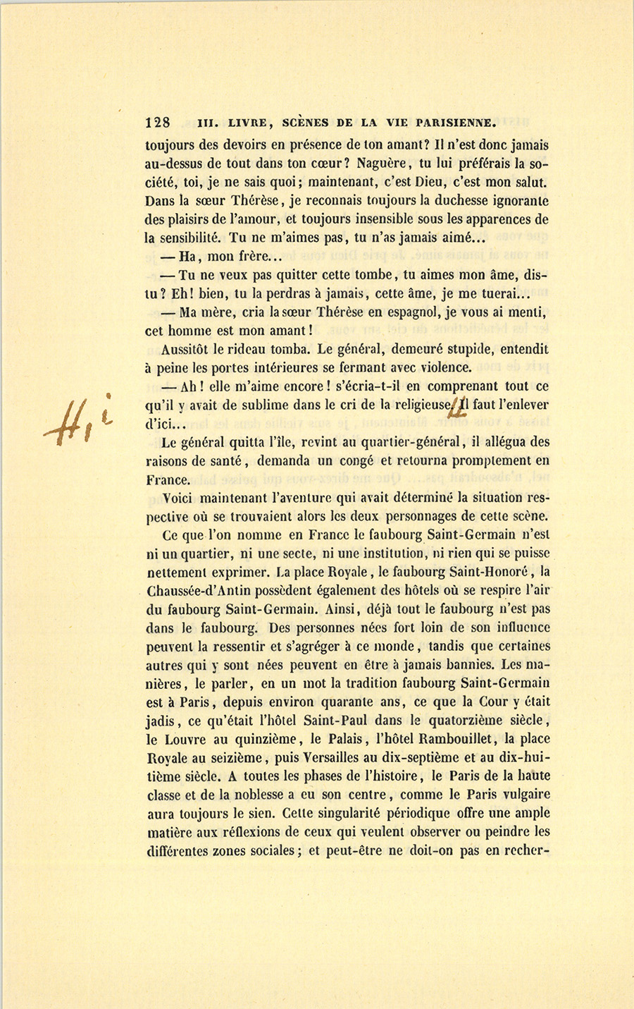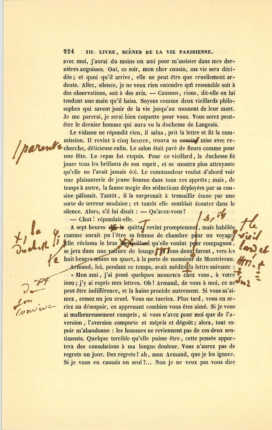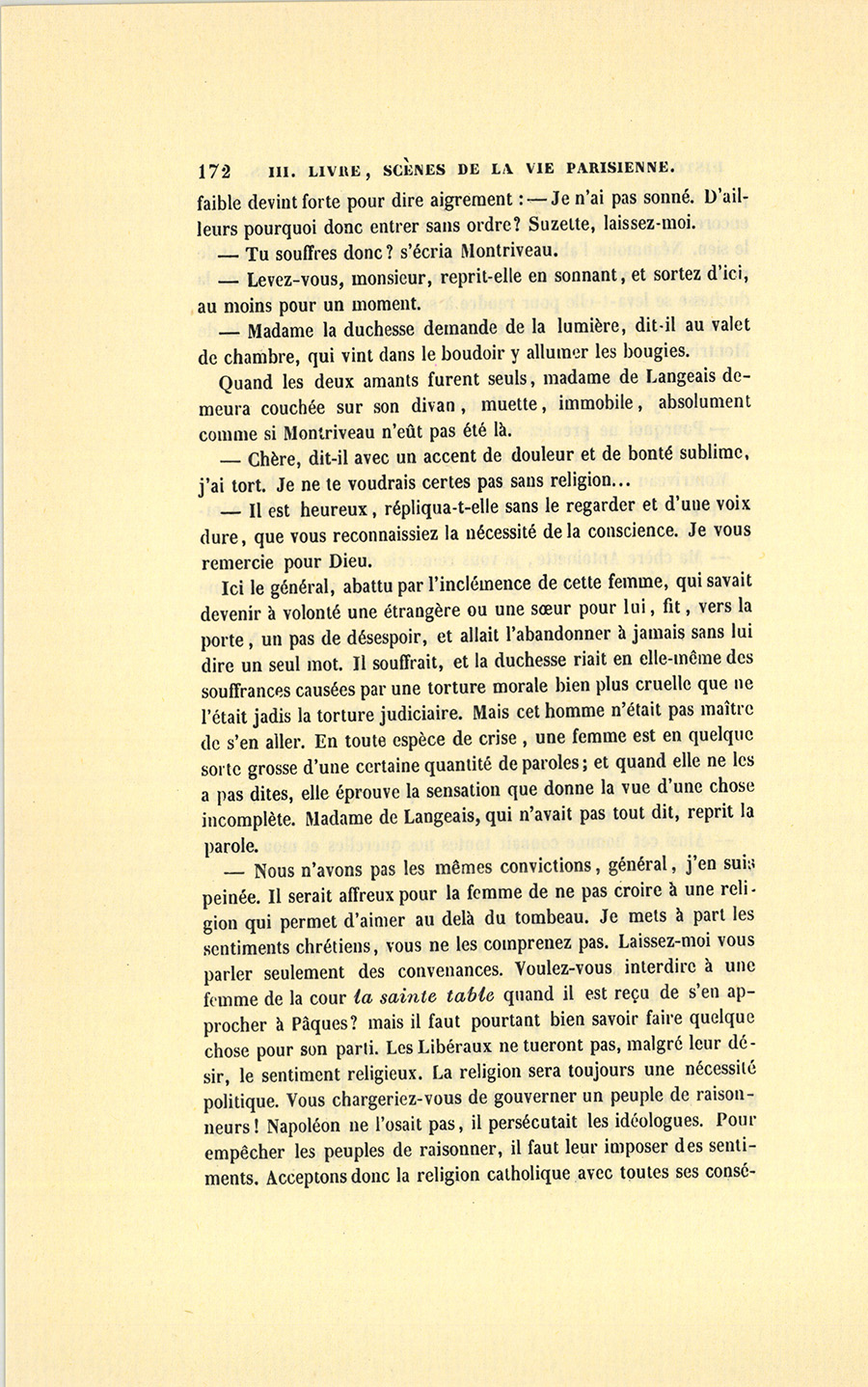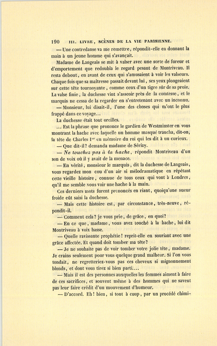 – Monsieur, vous seriez-vous prêté à quelque cruelle {p. 228} plaisanterie ? s’écria-t-il. Je viens de chez madame de Langeais, et ses gens la disent sortie.